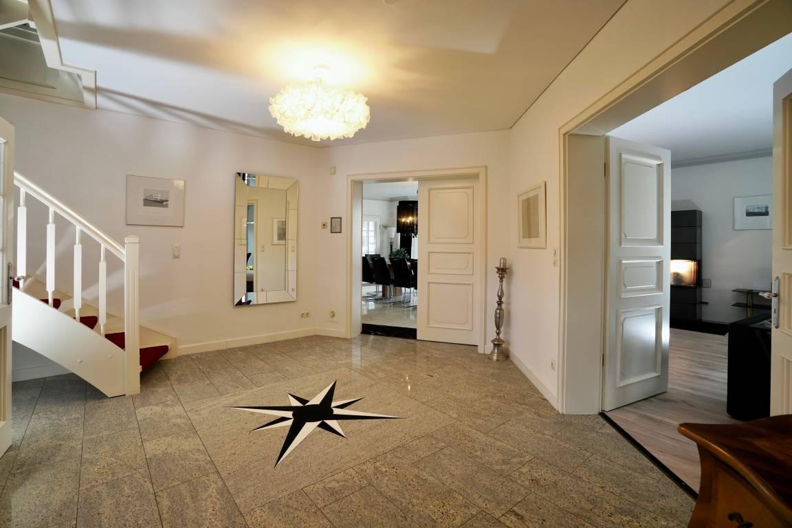 Entspannen Sie im privaten Schwimmbad und der Sauna im Wellnessbereich oder lassen Sie die Seele im geschmackvoll eingerichteten Wohnzimmer mit Kamin und großem Flat-TV baumeln. Das Esszimmer mit Gartenblick, das gemütliche Kaminzimmer mit Bibliothek sowie die moderne Küche laden zum Verweilen ein.