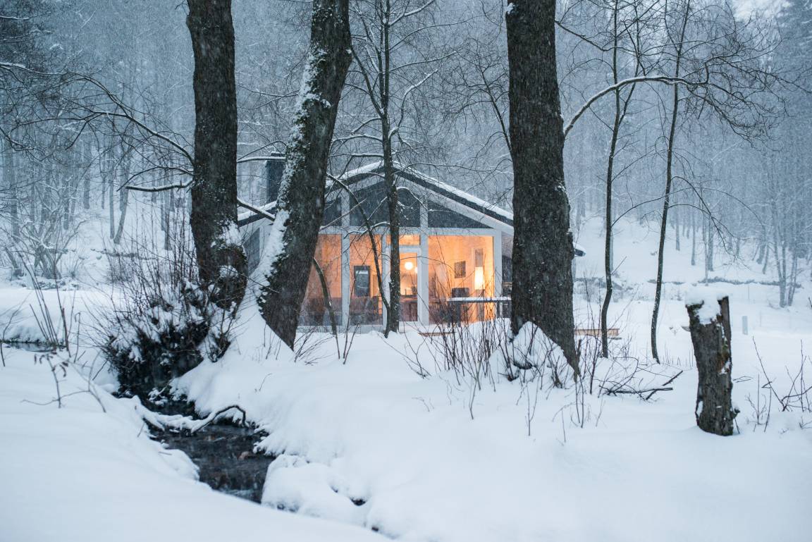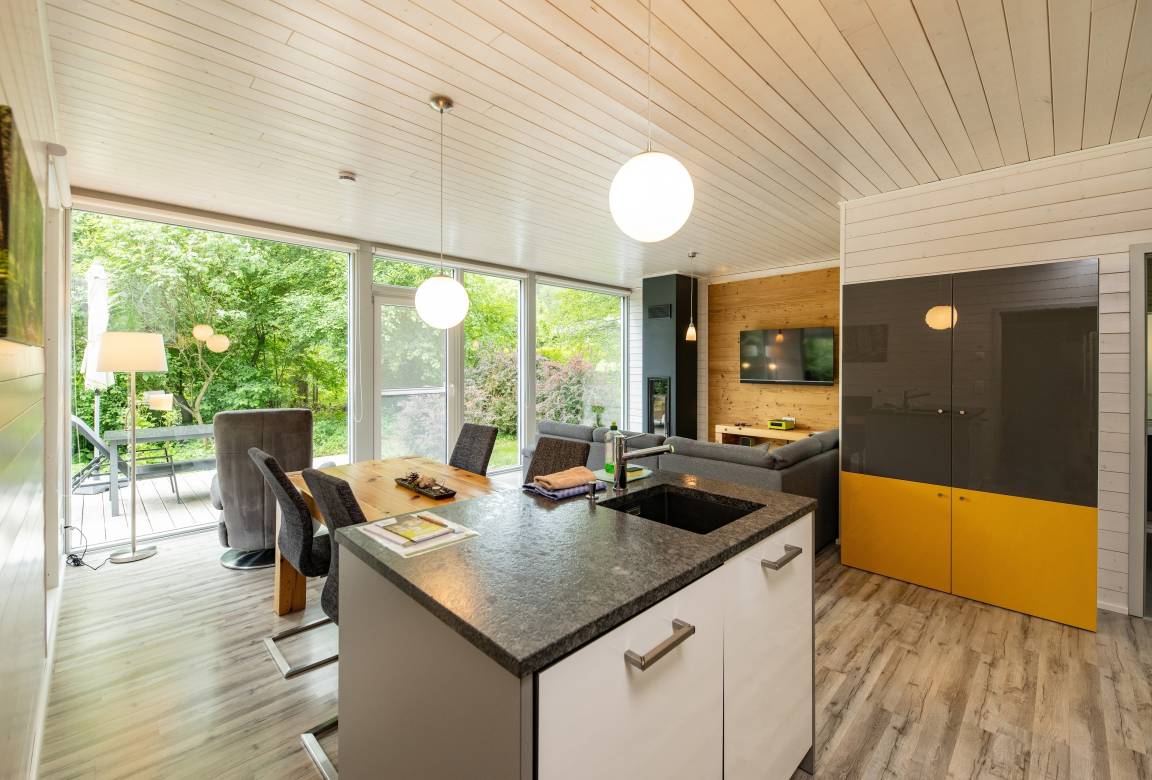 Das Ferienhaus mit einem lichtdurchfluteten offenen Wohn- und Küchenbereich, einem Schlafzimmer und einem Wellness-Bad mit Sauna bietet Ihnen auf 61 Quadratmetern großzügigen Platz für 2 Personen. Die 7 Meter breite Glasfront lässt die Natur beim Essen oder Relaxen teilhaben. In der kalten Jahreszeit vollendet das knisternde Kaminfeuer das Urlaubsfeeling.
