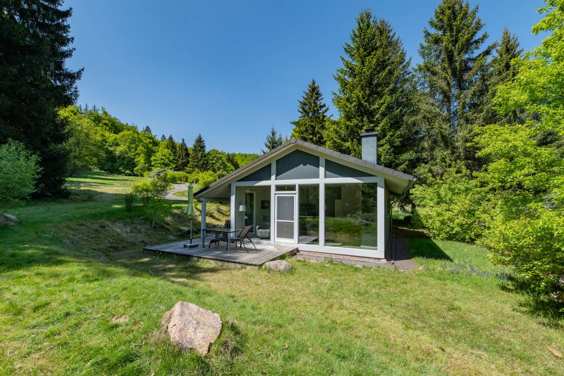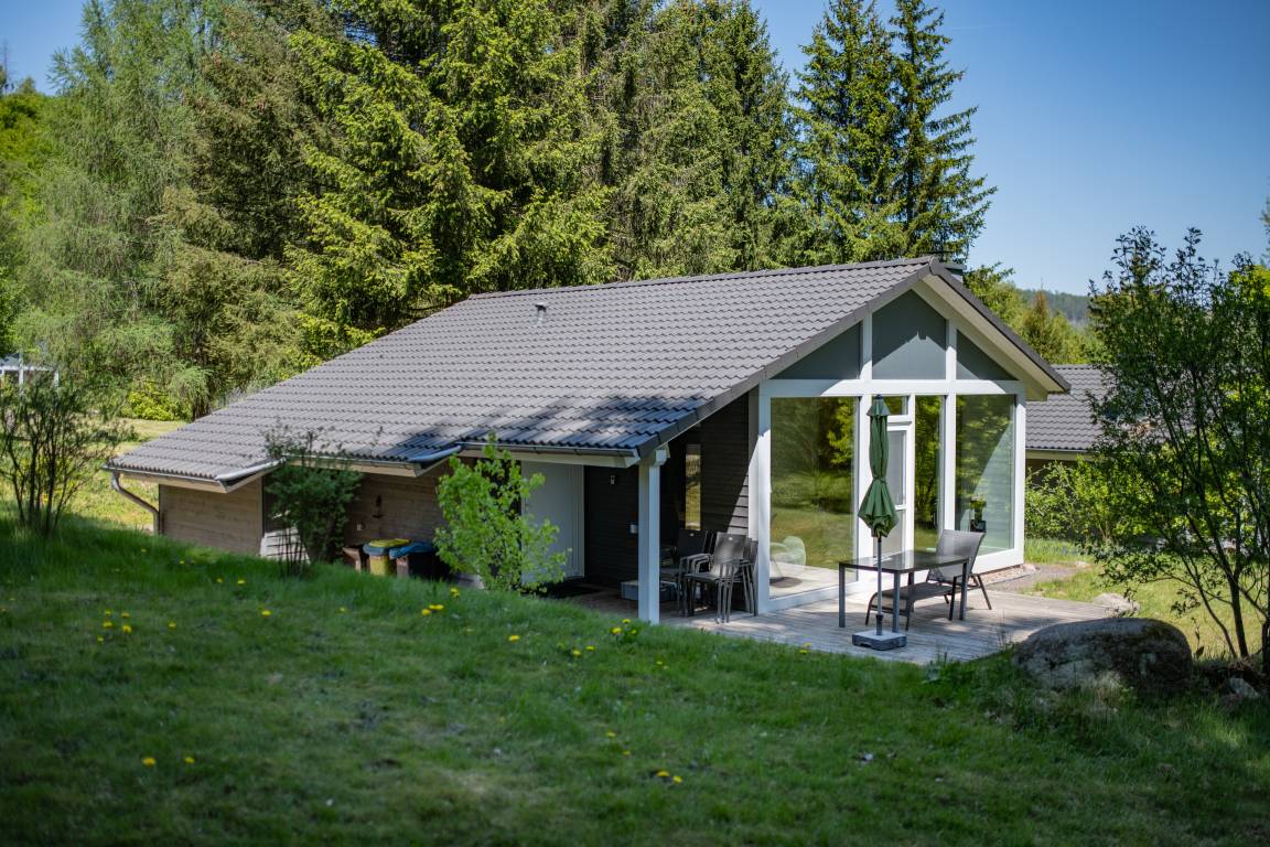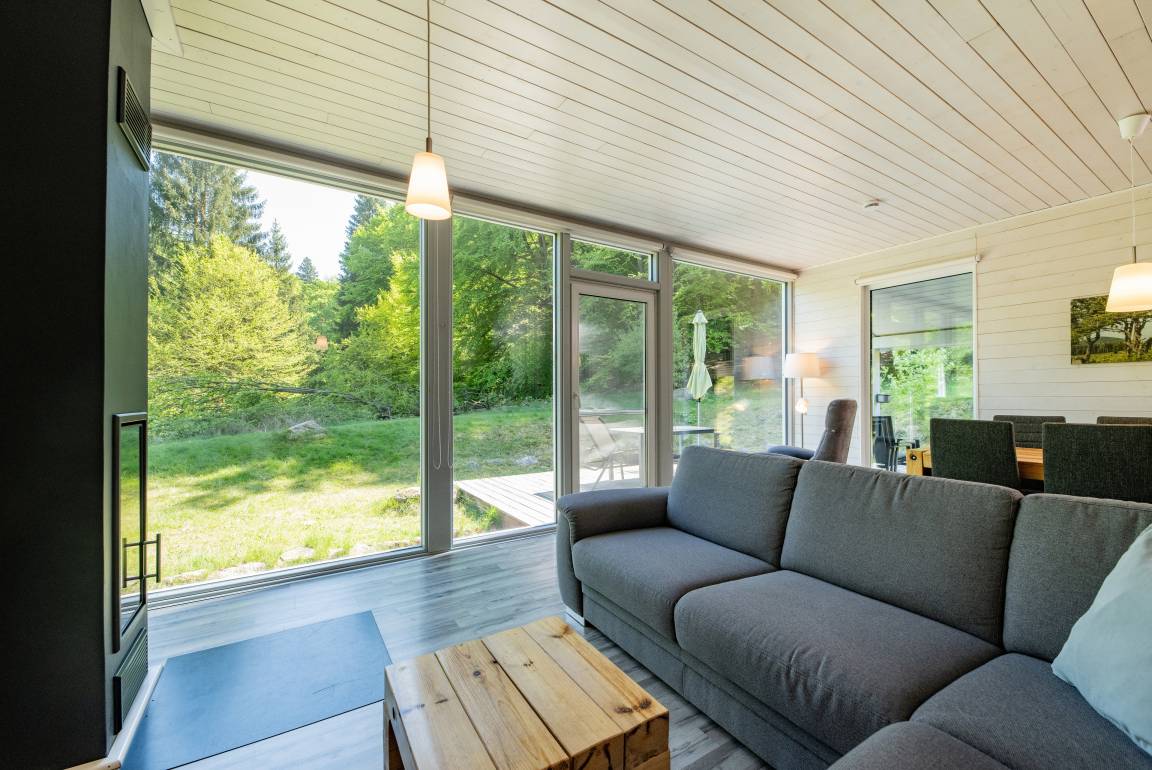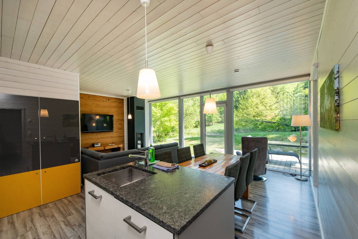 Das Ferienhaus mit einem lichtdurchluteten offenen Wohn- und Küchenbereich, zwei Schlafzimmern und einem Wellness-Bad mit Sauna bietet Ihnen auf 70 Quadratmetern ausreichend Platz für 4 Personen. Die 7 Meter breite Glasfront lässt die Natur beim Essen oder Relaxen teilhaben. In der kalten Jahreszeit vollendet das knisternde Kaminfeuer das Urlaubsfeeling.