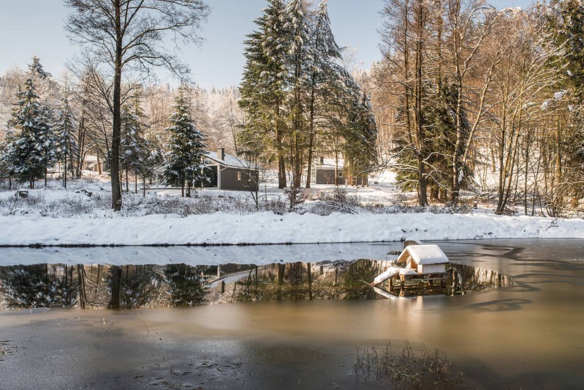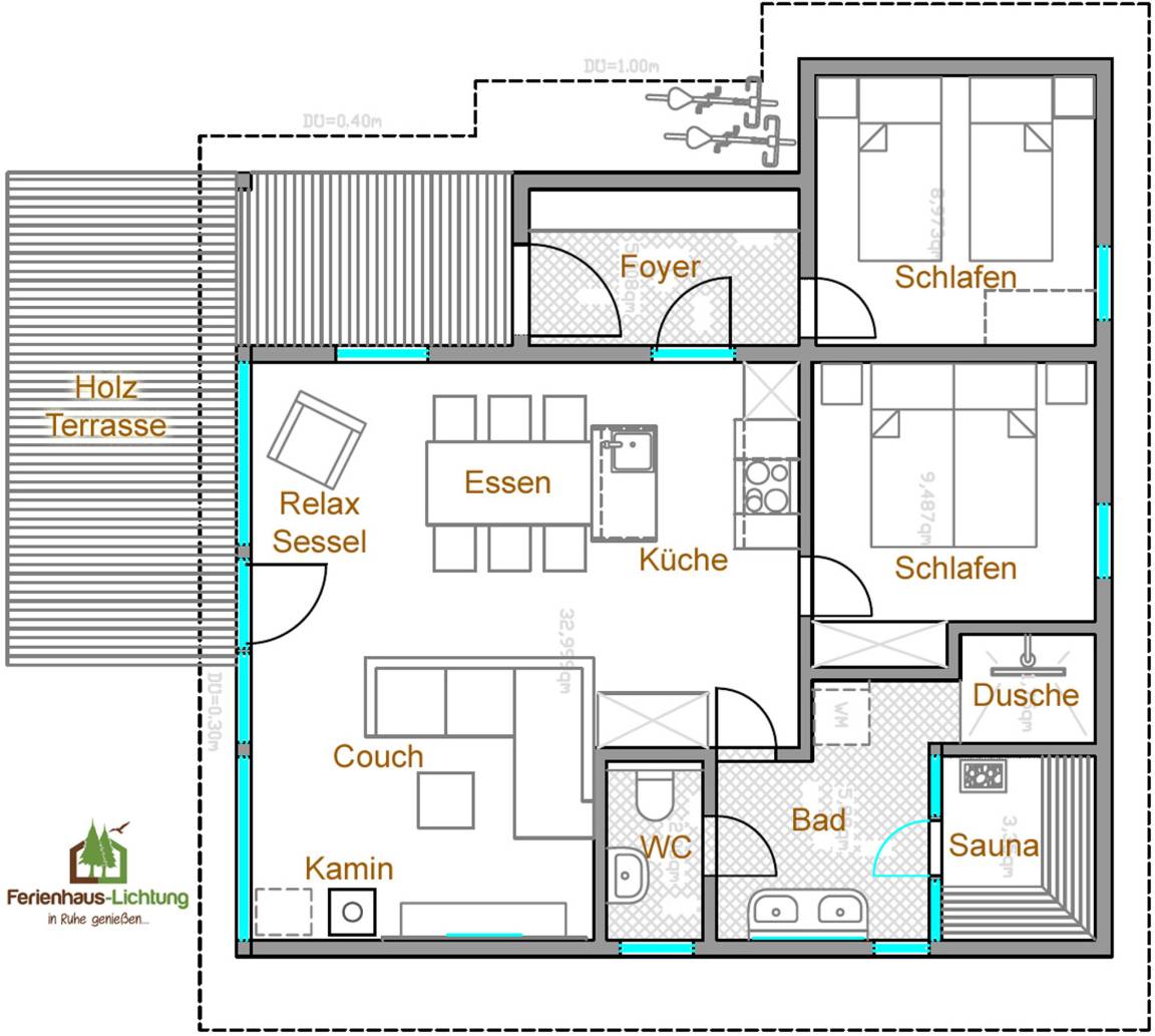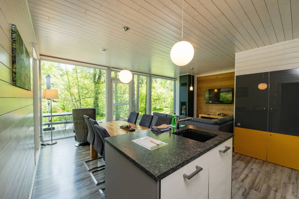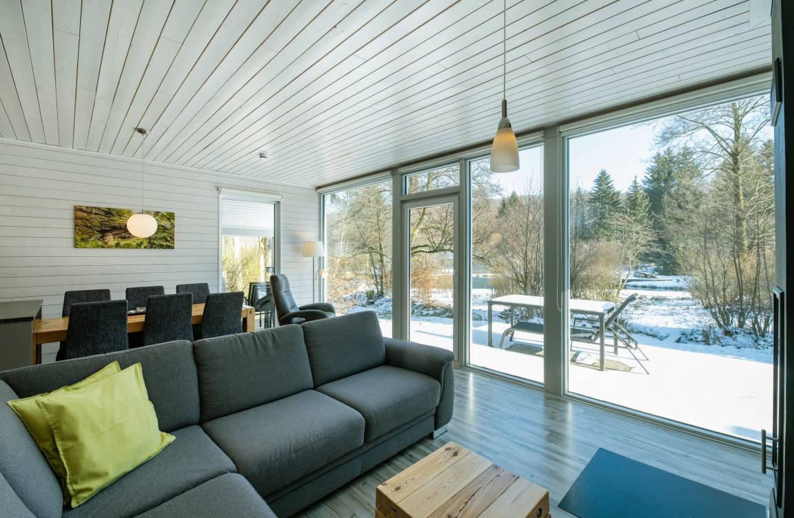 Das Ferienhaus mit einem lichtdurchluteten offenen Wohn- und Küchenbereich, zwei Schlafzimmern und einem Wellness-Bad mit Sauna bietet Ihnen auf 70 Quadratmetern ausreichend Platz für 4 Personen. Die 7 Meter breite Glasfront lässt die Natur beim Essen oder Relaxen teilhaben. In der kalten Jahreszeit vollendet das knisternde Kaminfeuer das Urlaubsfeeling.