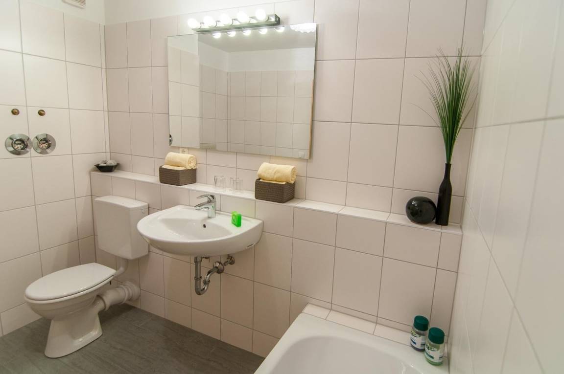 Die Wohnung verfügt über eine voll ausgestattete Wohnküche mit Essbereich, ein separates Elternschlafzimmer mit Doppelbett (180 x 200 cm) und Zugang zur Terrasse sowie ein zweites Schlafzimmer mit Stockbett – ideal für Familien. Das Badezimmer mit Badewanne/Dusche und WC sowie ein zusätzliches Gäste-WC bieten extra Komfort.