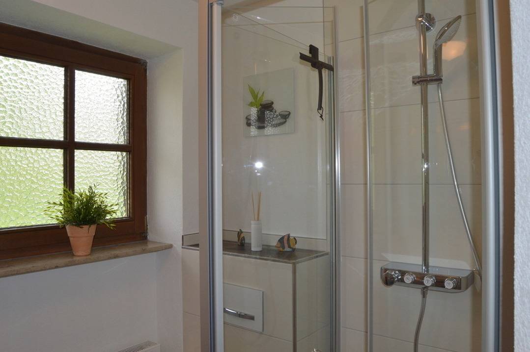 Das Badezimmer ist lichtdurchflutet und verfügt über eine Dusche, WC und ein Waschbecken. Nach einem ereignisreichen Tag können Sie sich in der hausinternen Sauna entspannen oder auf dem großzügigen Balkon mit Blick auf die atemberaubenden Chiemgauer Alpen die Seele baumeln lassen.