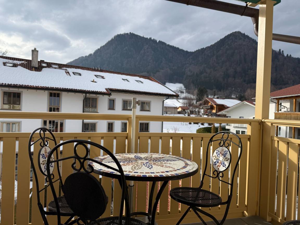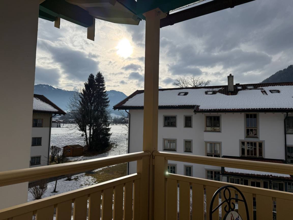 Der Balkon mit Gartenmöbeln und Sonnenschirm bietet einen herrlichen Westblick auf die Berge – ideal, um die Abendsonne entspannt zu genießen.
