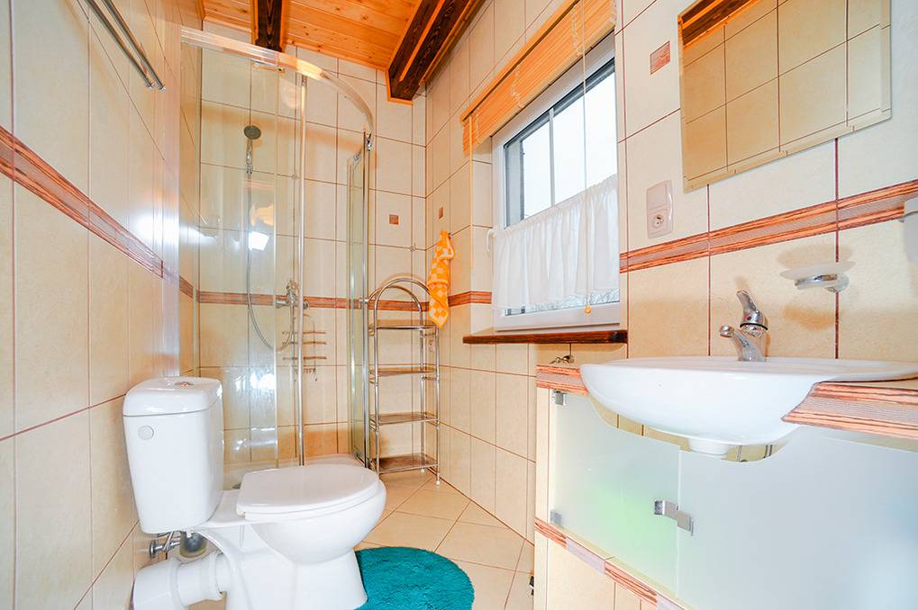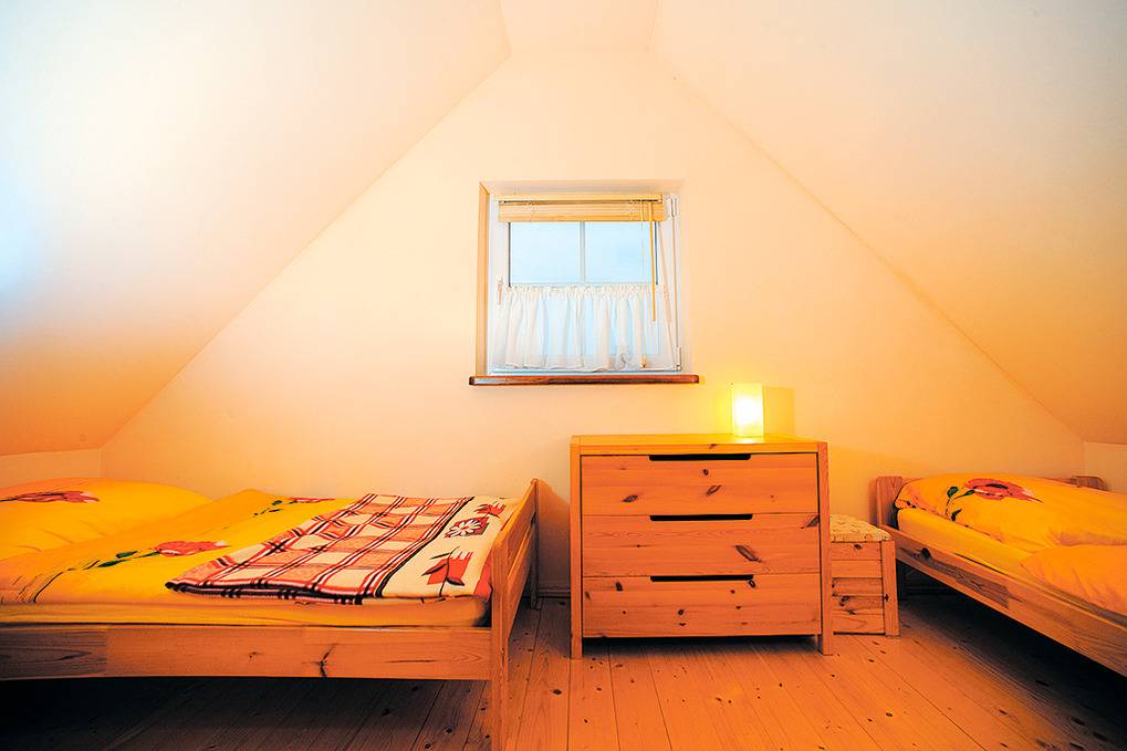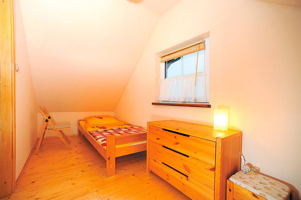PL 312.5 Ferienhaus 2-5 Pers.: 3-Zimmerhaus mit ca. 55 qm Wohnfläche über 2 Etagen. Parterre: Wohn-/Essraum mit rustikaler Holzbalkendecke, Kamin, Sitzcouch, Couchtisch, Sat-TV mit dt. Programmen, Internet (Wlan), Küchenzeile (2 Platten Ceranfeld). Bad/WC. 1. Etage mit Schrägen: 3-Bettzimmer mit Doppelbett, Einzelbett. 2-Bettzimmer.