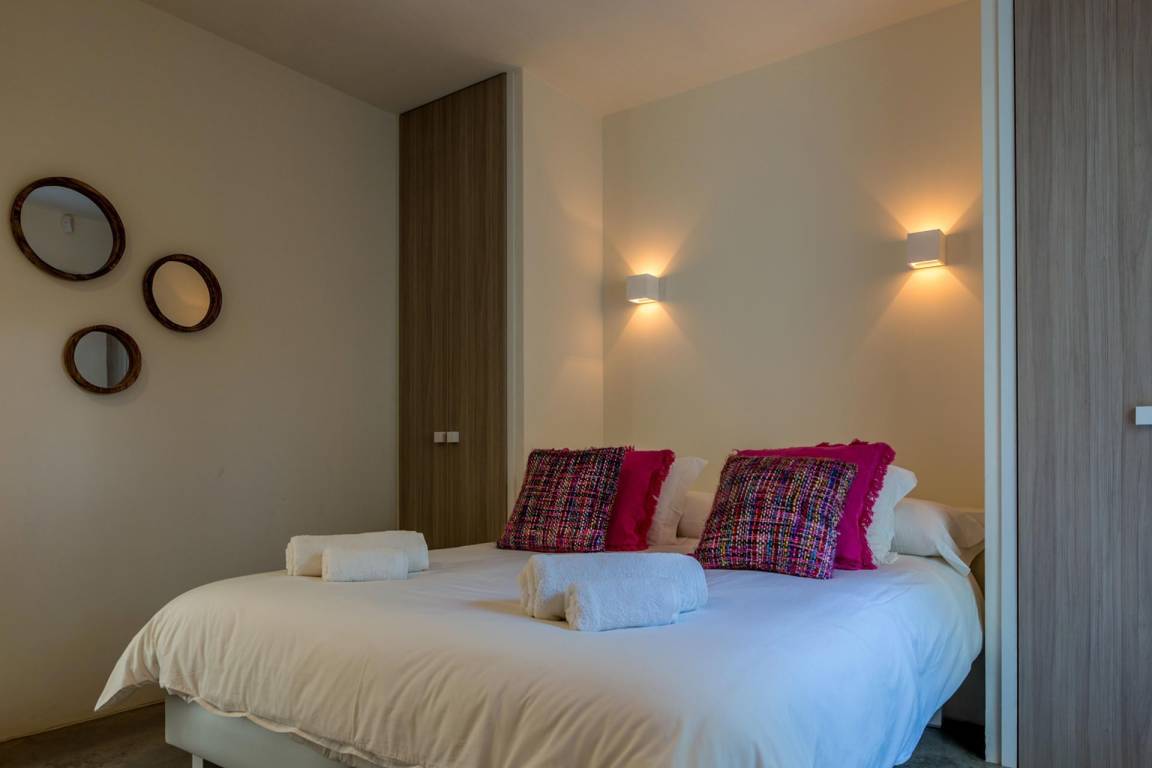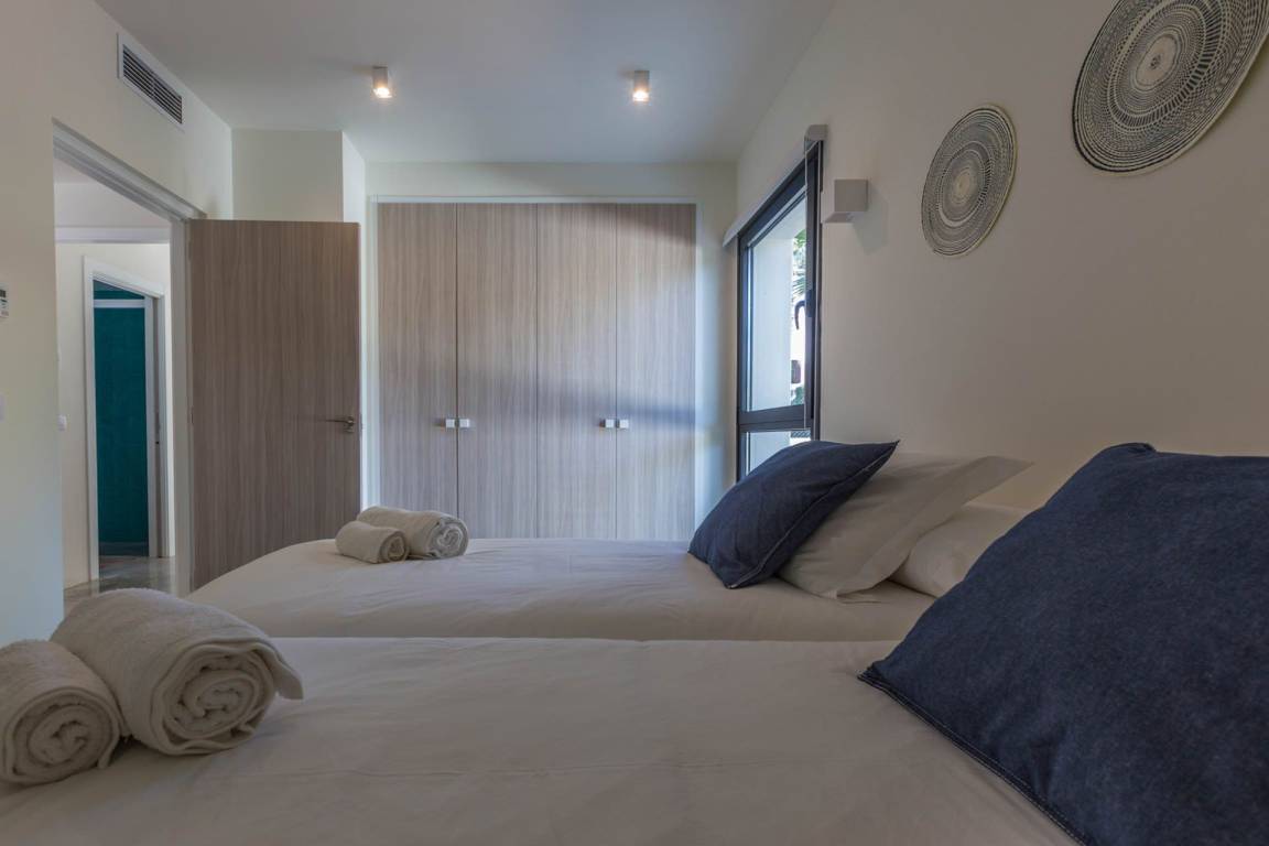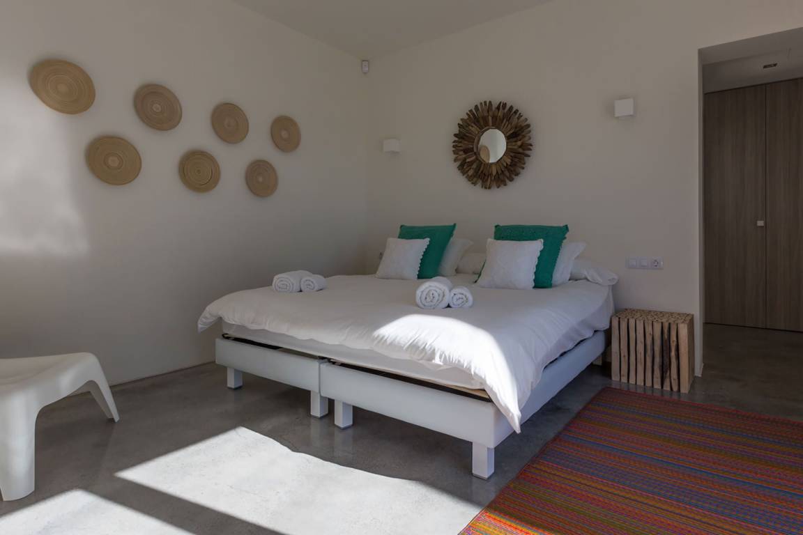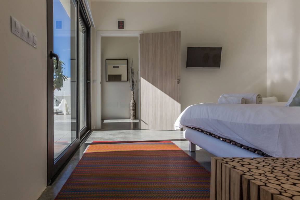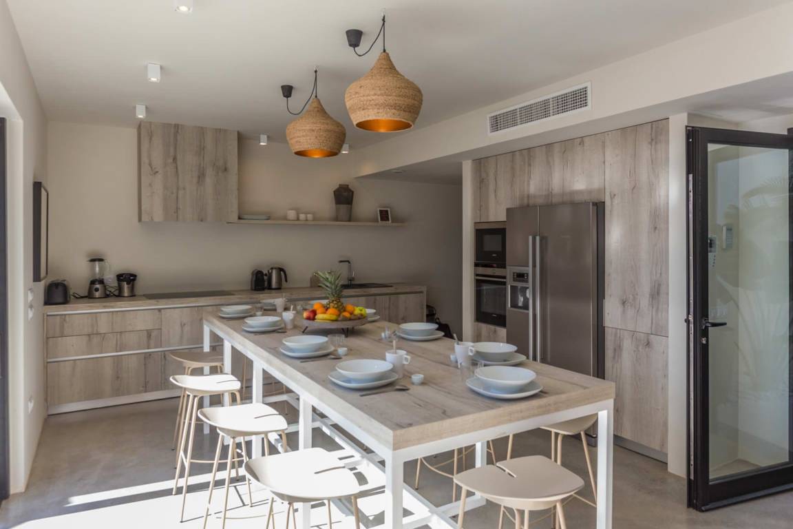 Die Villa Kiribati umfasst 5 Schlafzimmer und 5 Bäder und bietet Platz für bis zu 10 Gäste auf mehreren Geschossen. Die Schlafzimmer sind großzügig geschnitten und elegant möbliert. Jedes Bad ist hochwertig ausgestattet. Die Innenräume öffnen sich zu den Außenbereichen und ermöglichen direkten Zugang zum Meer sowie zu einem privaten Pool.