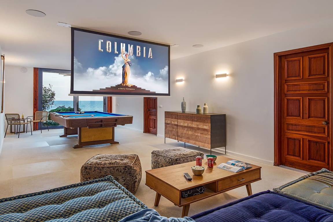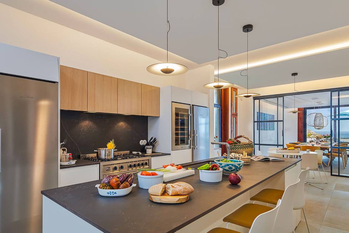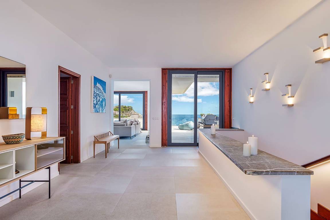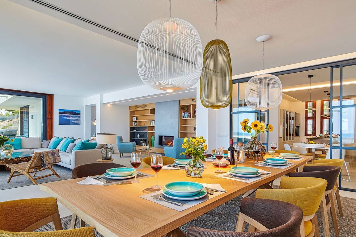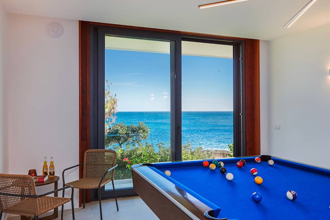 Die Villa Fullmoon ist eine 5-Zimmer-Villa mit einer Gesamtfläche von 2 Geschossen, ausgelegt für bis zu 10 Gäste. Das Erdgeschoss bildet das Zentrum der Villa und beherbergt ein großzügiges Wohnzimmer mit großflächigen Glasfenstern, das sich zur Außenterrasse und zum Meer öffnet. Das Wohnzimmer ist mit Sofas, einem Fernseher, einem Kamin mit offenem Herd und einem Klavier ausgestattet. Angrenzend befinden sich ein Essbereich mit Tisch und Stühlen sowie eine modern ausgestattete Küche mit zentraler Insel und Hochstühlen. Ebenfalls auf dieser Ebene liegt ein Entspannungsraum mit großem Fenster zur Landschaft, Billardtisch und Kinobildschirm. Das Erdgeschoss verfügt über 3 Schlafzimmer, jedes mit Doppelbett, Meerblick oder Gartenblick, Klimaanlage und eigenem Bürobereich. Die Badezimmer auf dieser Ebene sind mit begehbaren Duschen ausgestattet; eines der Zimmer verfügt zusätzlich über eine Badewanne.