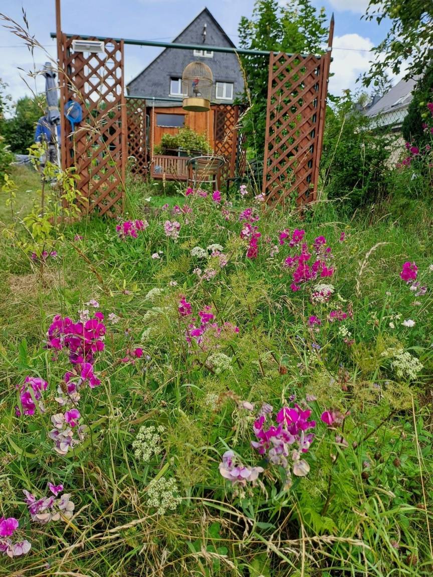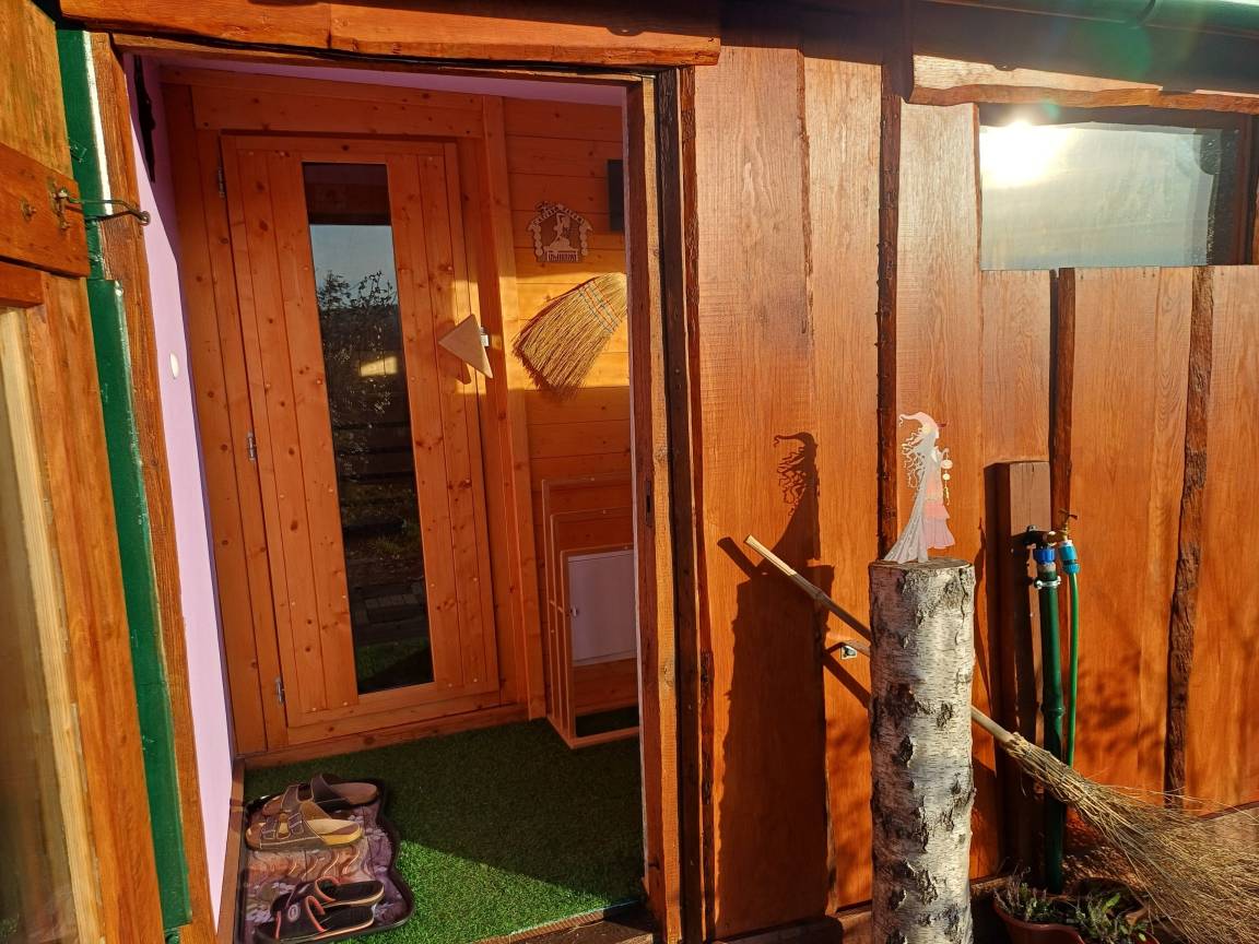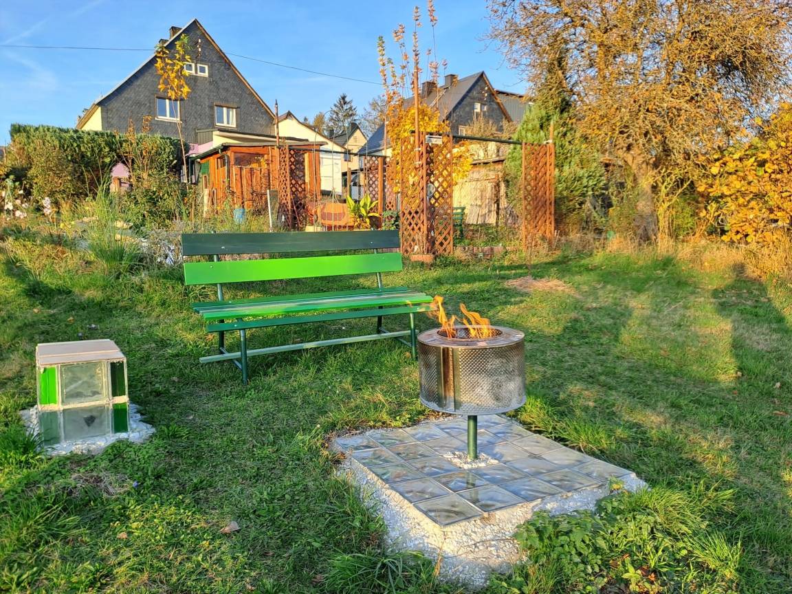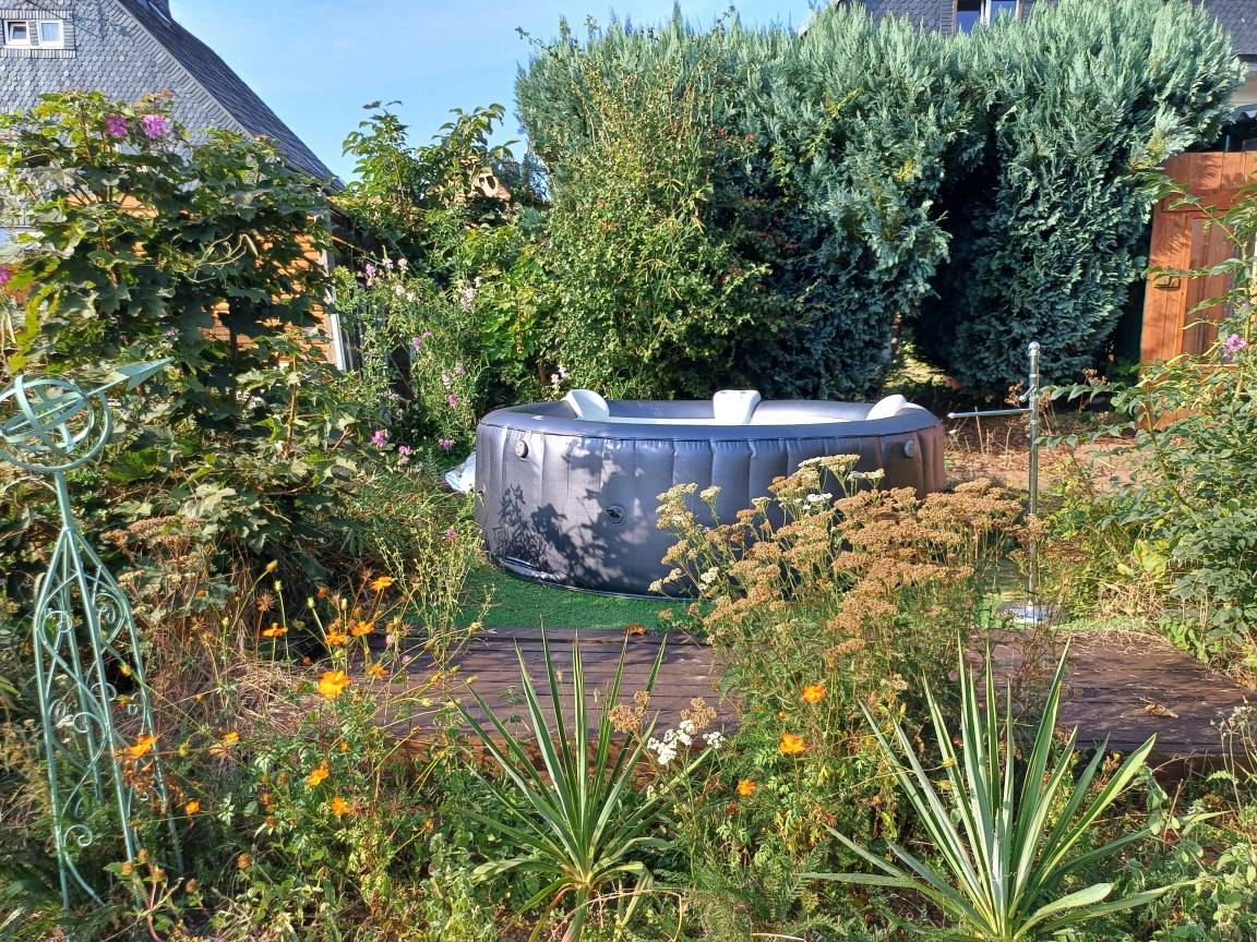 Auf dem über 700qm Grundstück erwarten Sie ein Hexen-Saunahaus mit tollem Blick und gemütlichen Vorraum, ein Kaffee-/Freizeithaus, ein Sonnenplatz, eine Feuerstelle, in warmen Zeiten ein Grillplatz, Whirlpool, Solardusche, Bachlauf-Oase mit einem kleinen Teichbiotop.
