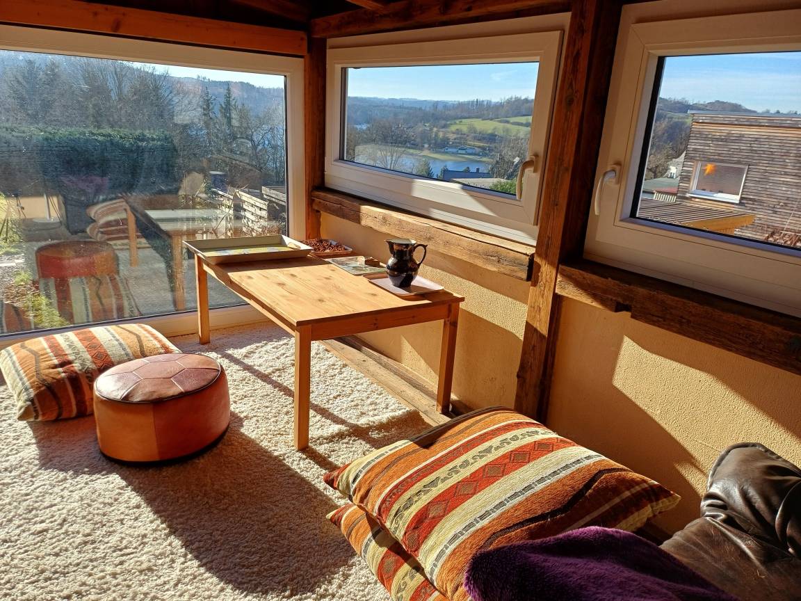 Das zweiteilige Dachgeschoß bietet eine zusätzliche Schlafmöglichkeit an. Der Raum und Blick aus dem Panoramafenster: lässt Sie hier, dem 7.Himmel nah, Ihre Seele baumeln!