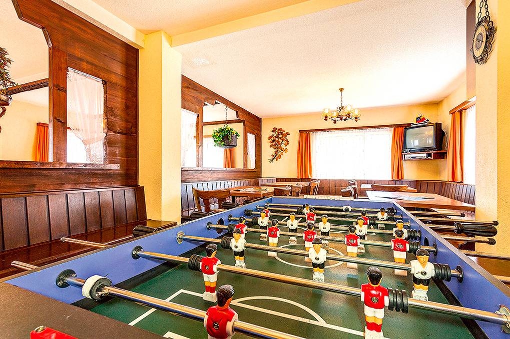 Parterre: Großer, gemütlich-rustikaler Tagesraum (ca. 80 qm) mit Pellet-Kaminofen, Kicker, Flachbild-Sat-TV, DVD, Esstischen, Theke. Gut ausgestattete Gruppenküche mit Spülmaschine, Tiefkühltruhe. Vorratsraum. Doppelzimmer. 3-Bettzimmer mit Einzelbetten. Bad: Du, Wb, WC. Hinweis: Das Bad und die Zimmer im Parterre sind barrierefrei und für Rollstuhlfahrer geeignet.