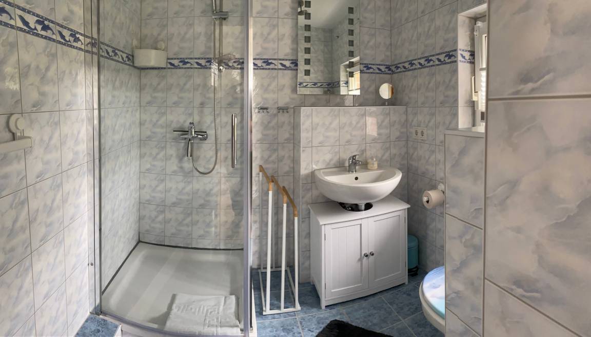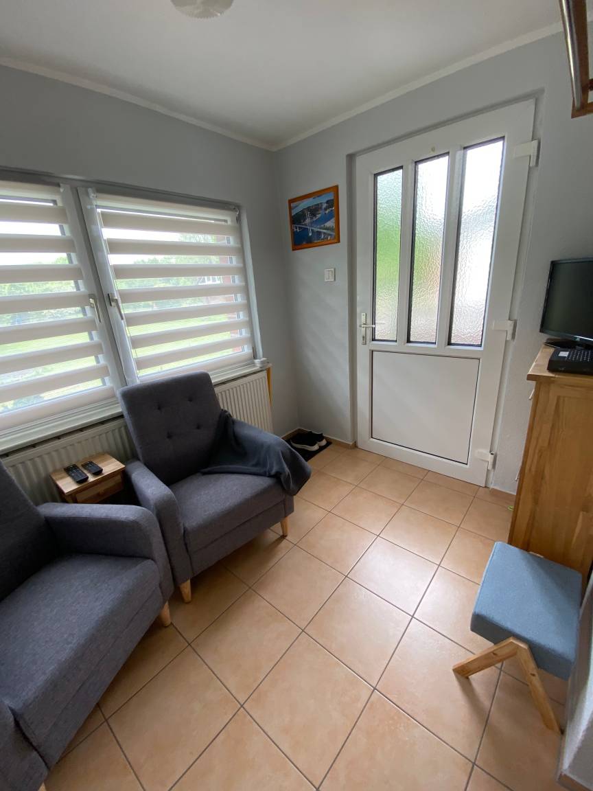 Unsere 43qm große 2,5 Raum-Wohnung bietet Ihnen viel Platz für Ihren wohlverdienten Urlaub. Der Wohn- und Essbereich mit Veranda bietet ausreichend Sitzmöglichkeiten mit Fachbild-SAT-TV, Radio und WLAN. Die große Wohnküche mit Küchenzeile und dem gemütlichen Esstisch lassen jeden Morgen gemütlich starten. Im Schlafzimmer steht für Ihren geruhsamen Schlaf ein großes Doppelbett (180 x 200 Meter) mit verstellbaren Lattenrosten bereit. Hier ist ein Schlafsessel von Wohnidee der als Schlafgelegenheit ( vorher angeben) umfunktioniert werden kann. Dieser hat eine Liegefläche von 80 x 190 Meter. Die voll ausgestattete Küchenzeile (Kühlschrank mit Gefrierfach, Herd mit 2 Platten, Multifunktionsbackofen mit Grill, Mikrowelle, ist neben Kaffeemaschine und Kapselmaschine (Dulco Gusto), Toaster und Wasserkocher somit gut ausgestattet. Eine eigene Terrasse vor der Wohnung lädt ebenfalls zum sitzen ein. Das Dusch-/Badezimmer ist modern eingerichtet. Der Bodenbelag im Schlafzimmer ist ein Dielenboden dieser sorgt somit für angenehm wohlige Wärme. In den anderen Zimmern ist Fliesenboden. Damit ist die Wohnung ebenfalls Allergiker freundlich.