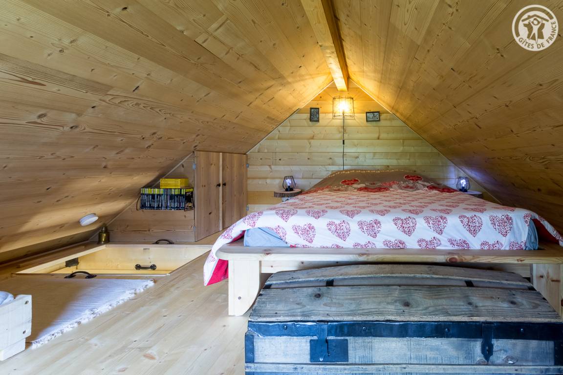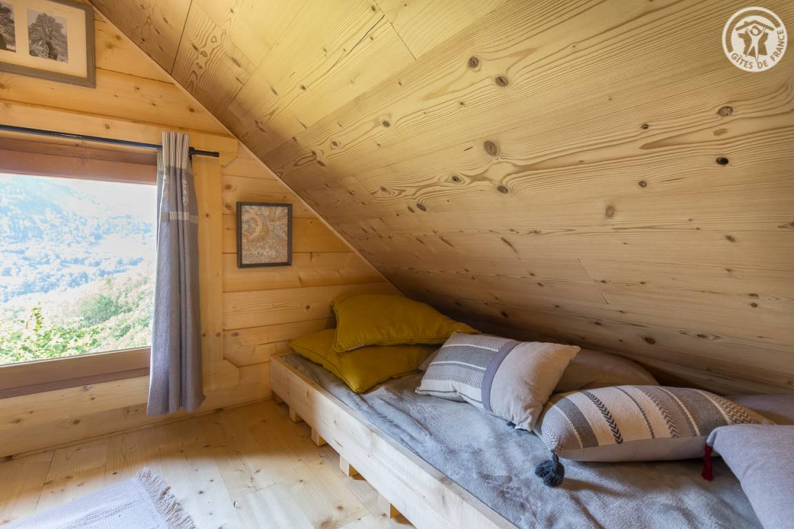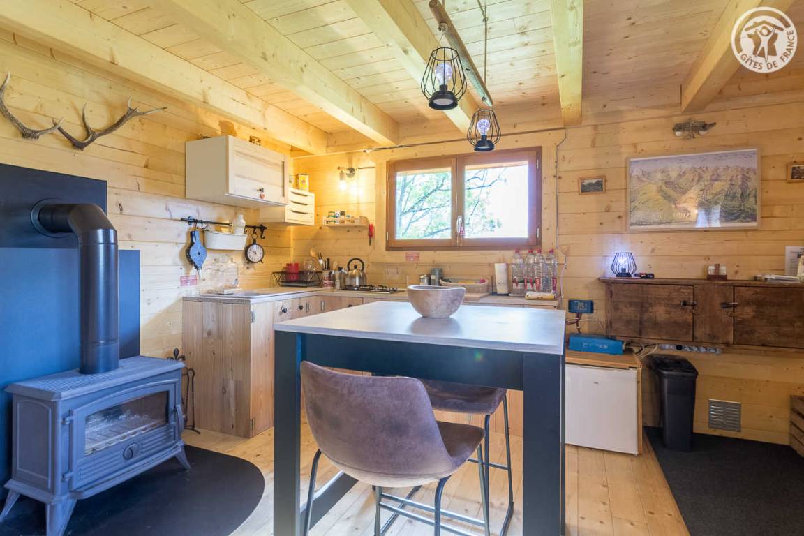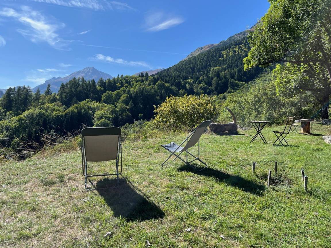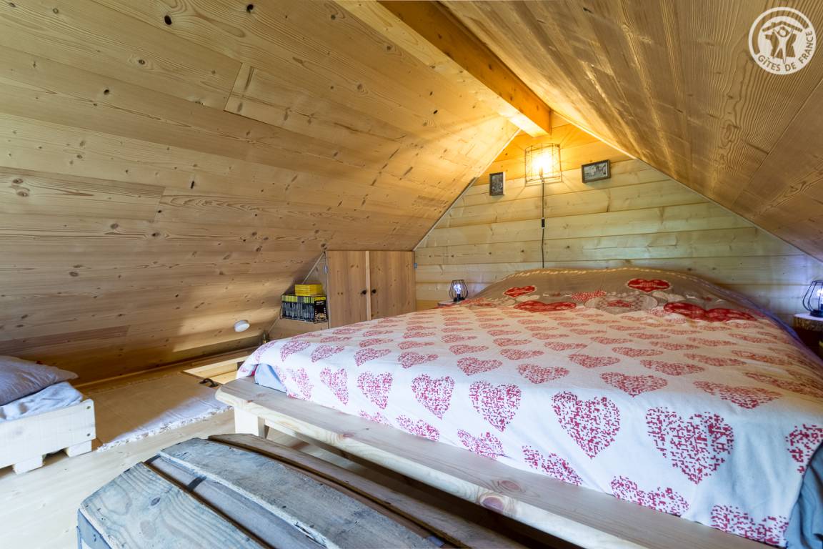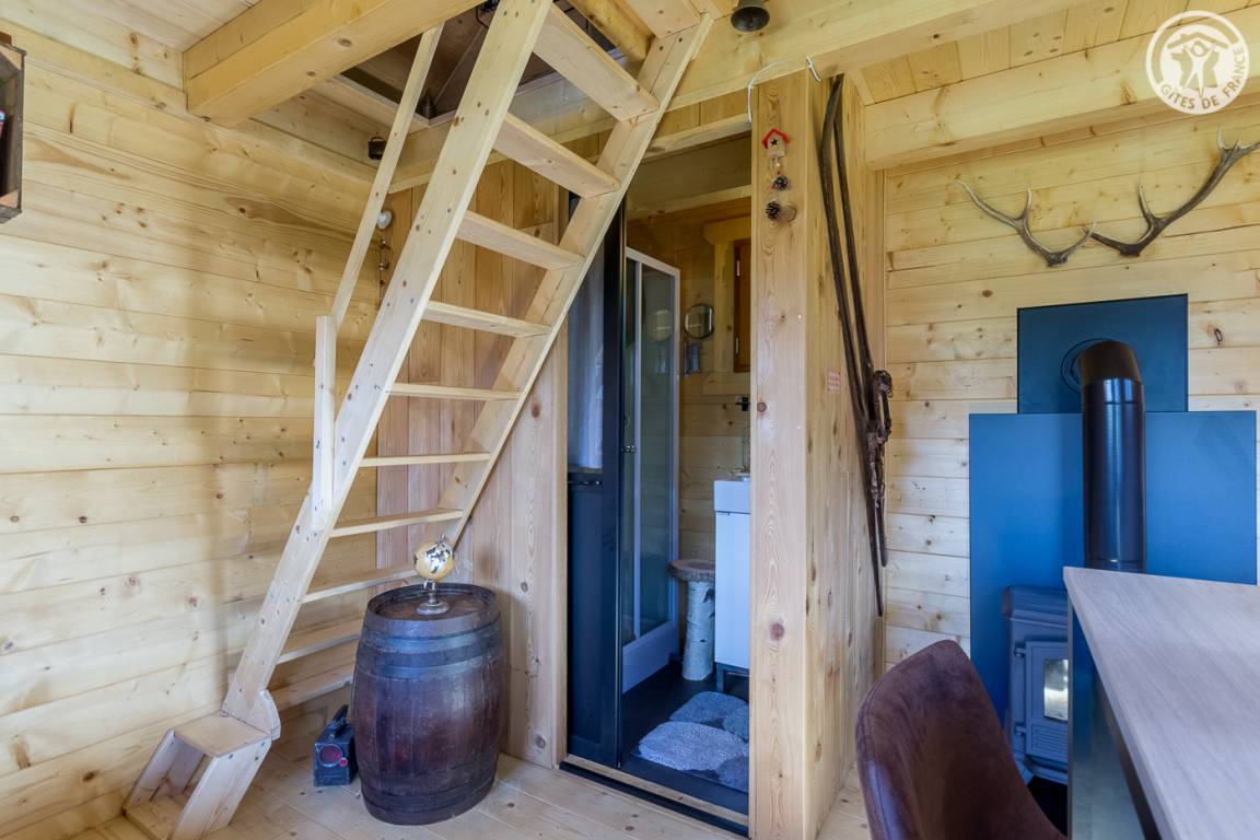 Freistehendes Holzchalet mit Küchenbereich (Kühlschrank mit Gefrierfach, 2 Gasbrenner) und Wohnbereich (1 Schlafsofa 110 x 190 cm für 1 Person), Bad (Dusche und Waschbecken). Obergeschoss: Zwischengeschoss unter dem Hang mit einer Gesamthöhe von weniger als 1,80 m, mit 1 Doppelbett und 1 Einzelbett. Trockentoiletten außerhalb des Chalets. Kein fließendes Wasser, aber Mineralwasserflaschen zum Kochen und Trinken vorhanden; Wasserbehälter für Waschbecken und Duschtanks (ergänzt durch einen Brunnen vor dem Chalet). Elektrische Beleuchtung durch 2 Solarmodule und batteriebetriebene Lampen. Holzofen mit Holz wird bereitgestellt. Ebenes Grundstück mit Grill, Tisch, Stühlen, Liegestühlen und Hängematte ausgestattet.