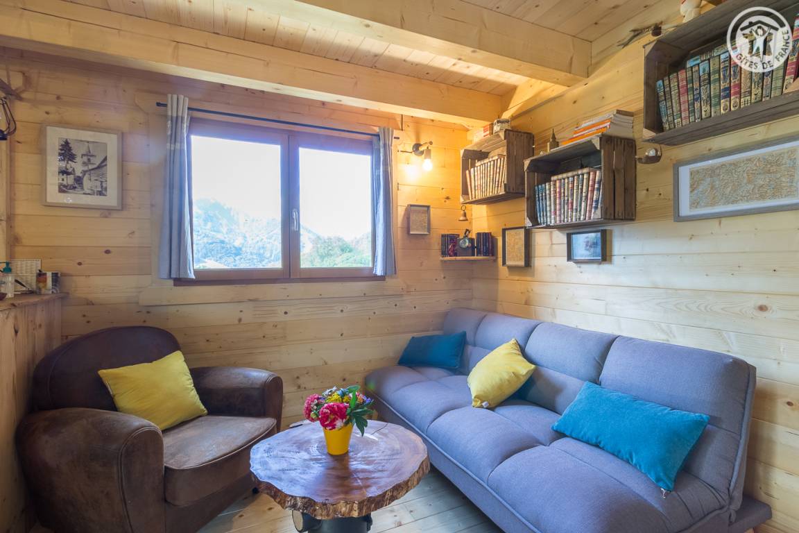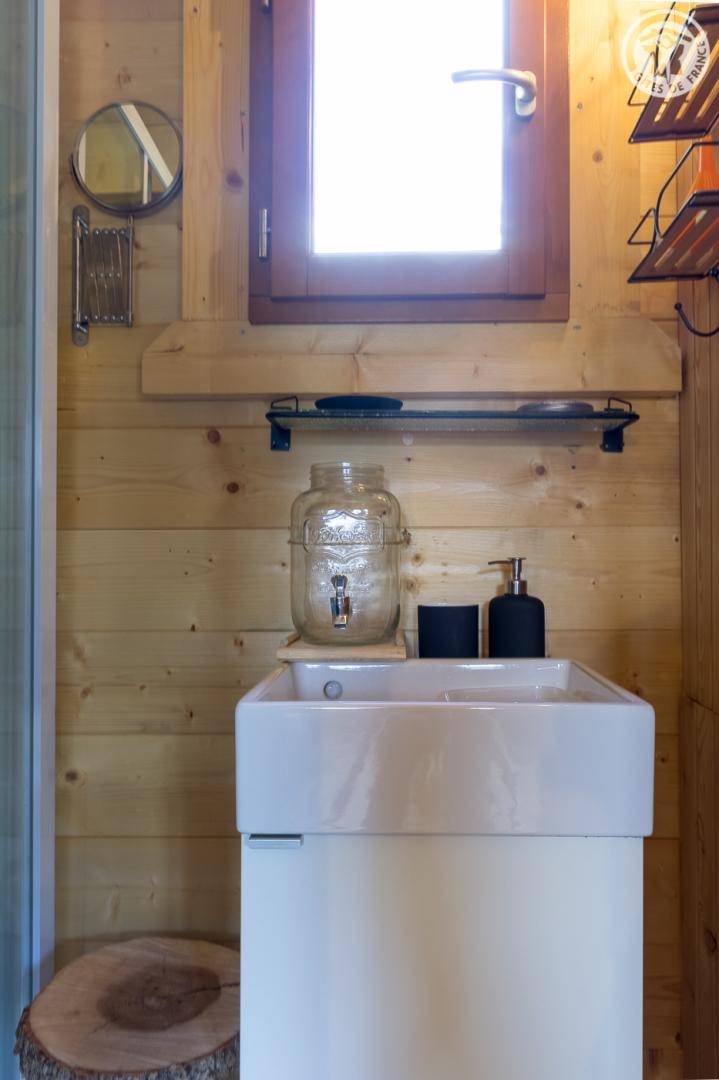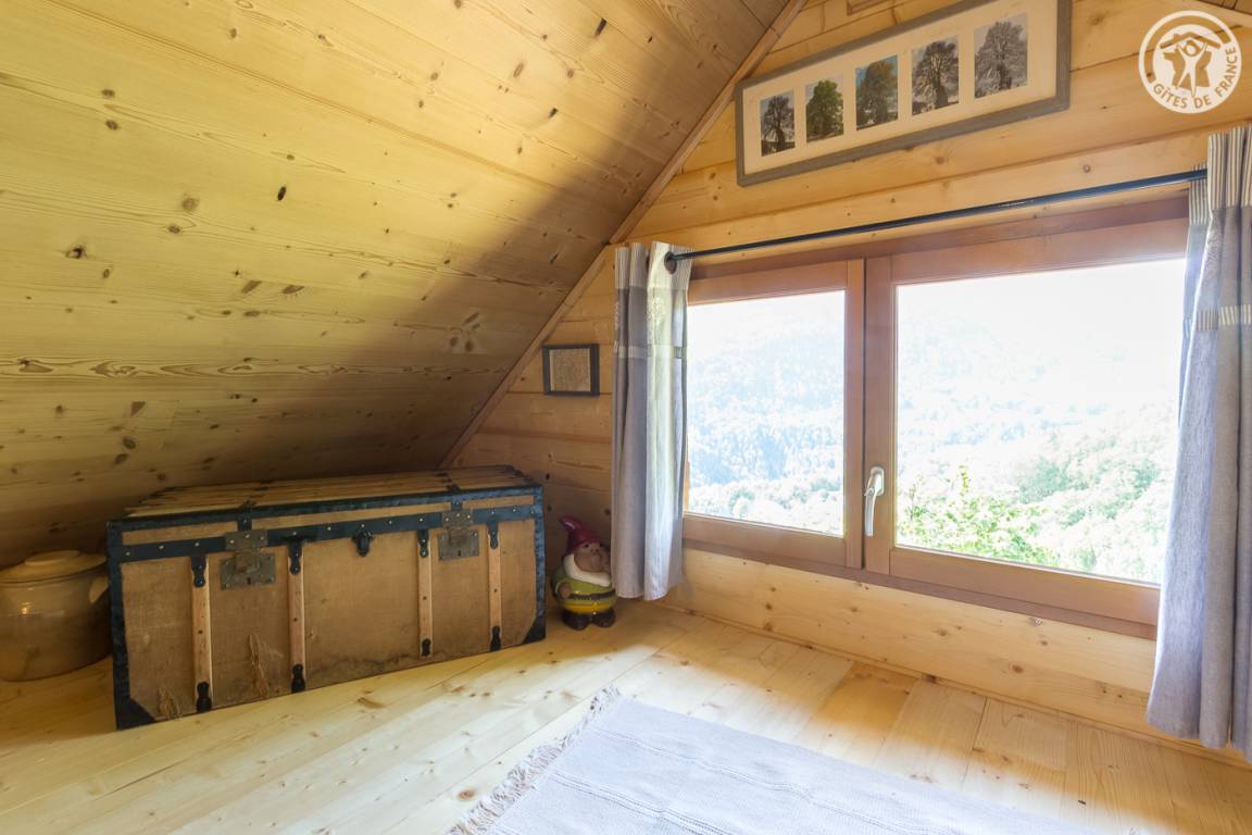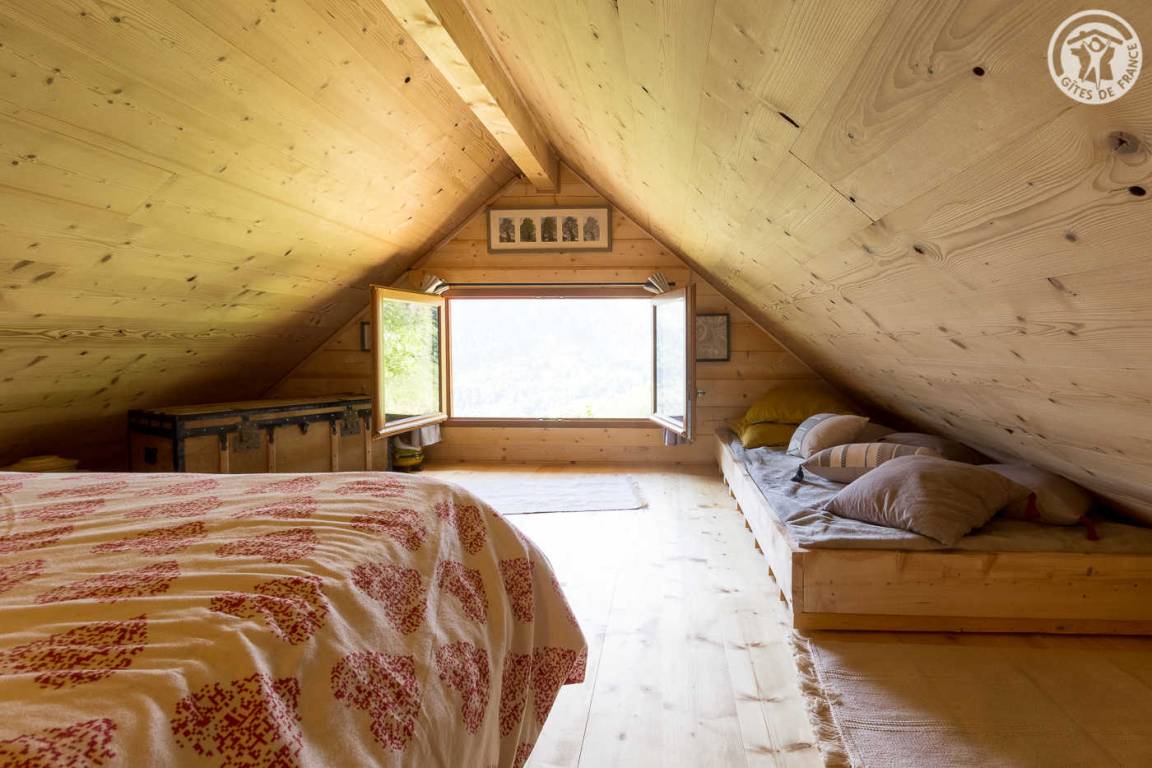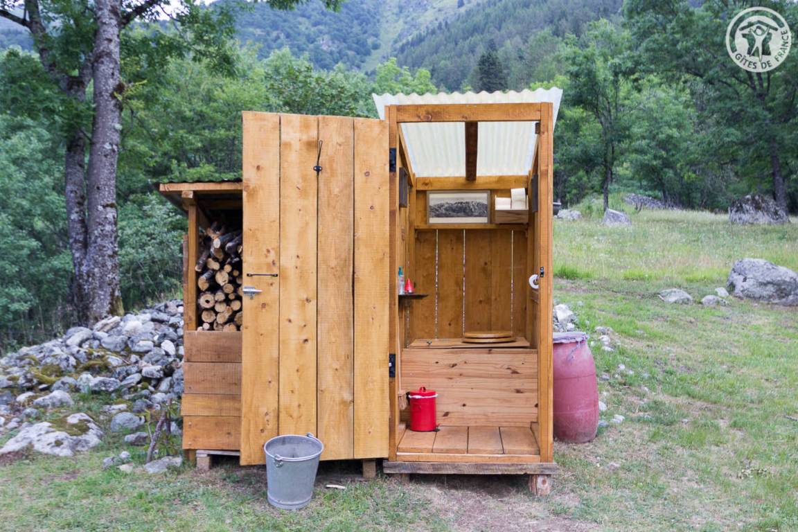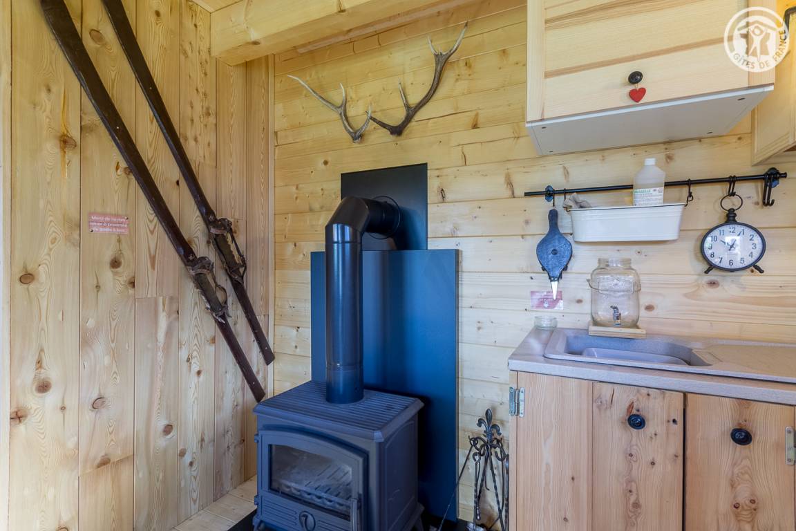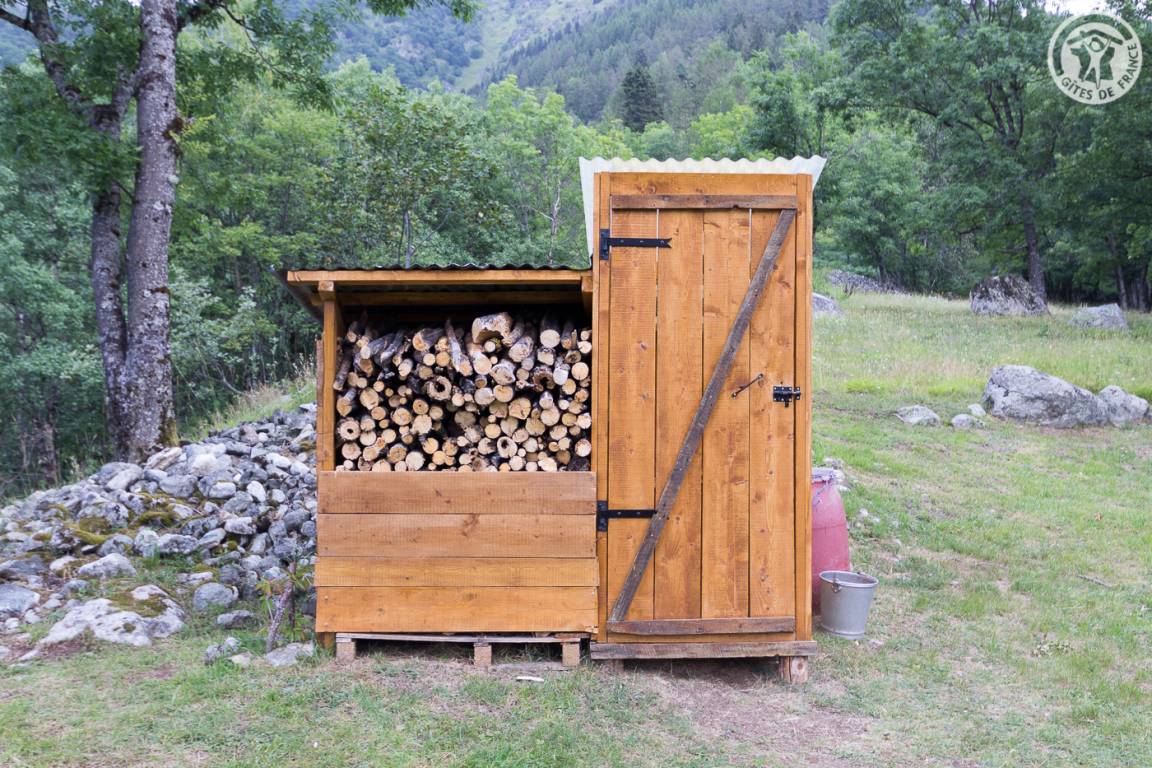 Freistehendes Holzchalet mit Küchenbereich (Kühlschrank mit Gefrierfach, 2 Gasbrenner) und Wohnbereich (1 Schlafsofa 110 x 190 cm für 1 Person), Bad (Dusche und Waschbecken). Obergeschoss: Zwischengeschoss unter dem Hang mit einer Gesamthöhe von weniger als 1,80 m, mit 1 Doppelbett und 1 Einzelbett. Trockentoiletten außerhalb des Chalets. Kein fließendes Wasser, aber Mineralwasserflaschen zum Kochen und Trinken vorhanden; Wasserbehälter für Waschbecken und Duschtanks (ergänzt durch einen Brunnen vor dem Chalet). Elektrische Beleuchtung durch 2 Solarmodule und batteriebetriebene Lampen. Holzofen mit Holz wird bereitgestellt. Ebenes Grundstück mit Grill, Tisch, Stühlen, Liegestühlen und Hängematte ausgestattet.