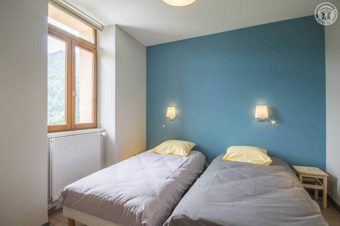 2 Hütten im Rathaus. Ferienhaus im 1. Stock vom gemeinsamen Eingang im Rathaus auf der Straßenseite (aber im 2. Stock, wenn der Zugang vom Grundstück aus erfolgt, da das Gebäude an der Seite eines Hangs liegt) bestehend aus Eingang, Wohnzimmer-Küchen-Loungebereich (Schlafsofa für 2 Personen), 2 Schlafzimmer (2 Einzelbetten 90 x 200 cm / 2 Einzelbetten 90 x 200 cm), ein Duschbad, separates WC. Aufenthaltsraum mit Sommerküche im Erdgeschoss. Gemeinsamer ebener Boden mit Gartentischen und -stühlen. Kombinierter Waschtrockner gemeinsam auf dem Treppenabsatz zwischen den 2 Gites.