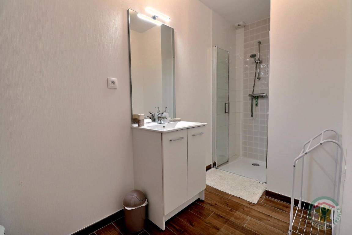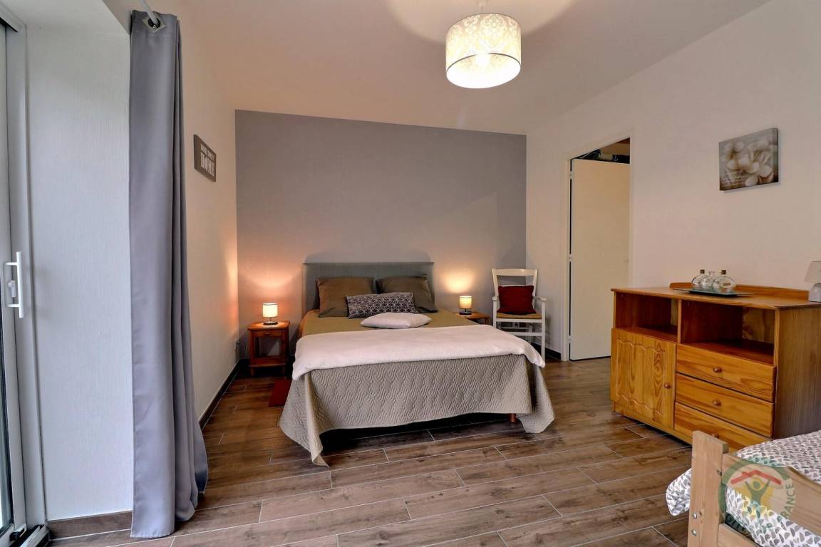 Dieses einstöckige Landhaus ist für Personen mit eingeschränkter Mobilität zugänglich und besteht aus einem Wohnzimmer mit einer zum Essbereich und einem Wohnbereich offenen Küche, einem Schlafzimmer mit einem 140-cm-Bett und einem 90-cm-Bett sowie einem verbundenen Duschbad , eine separate Toilette mit Waschbecken. Fußbodenzentralheizung.