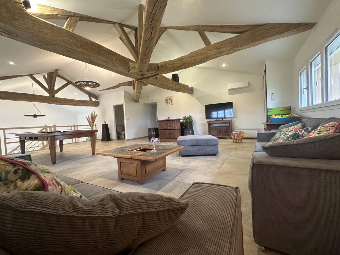 Entdecken Sie ein großes, helles Wohnzimmer. Heben Sie den Kopf und bewundern Sie das imposante Gerüst mit Blick auf die Lounge mit Billardtisch. Helle, geräumige Zimmer mit farbenfrohen Akzenten: Lila, Orange, Blau usw. An kühleren Abenden gibt es nichts Schöneres, als sich am Holzofen aufzuwärmen....