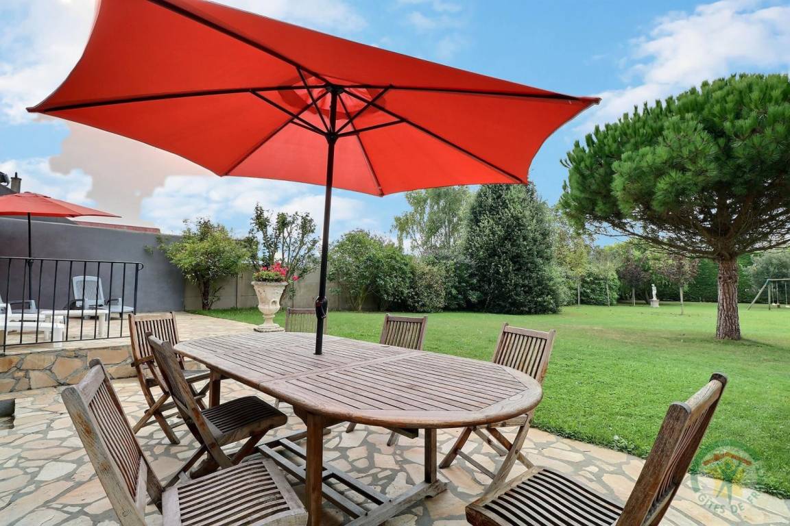 - Terrasse mit Gartenmöbeln, Sonnenschirm, Liegestühlen und Grill