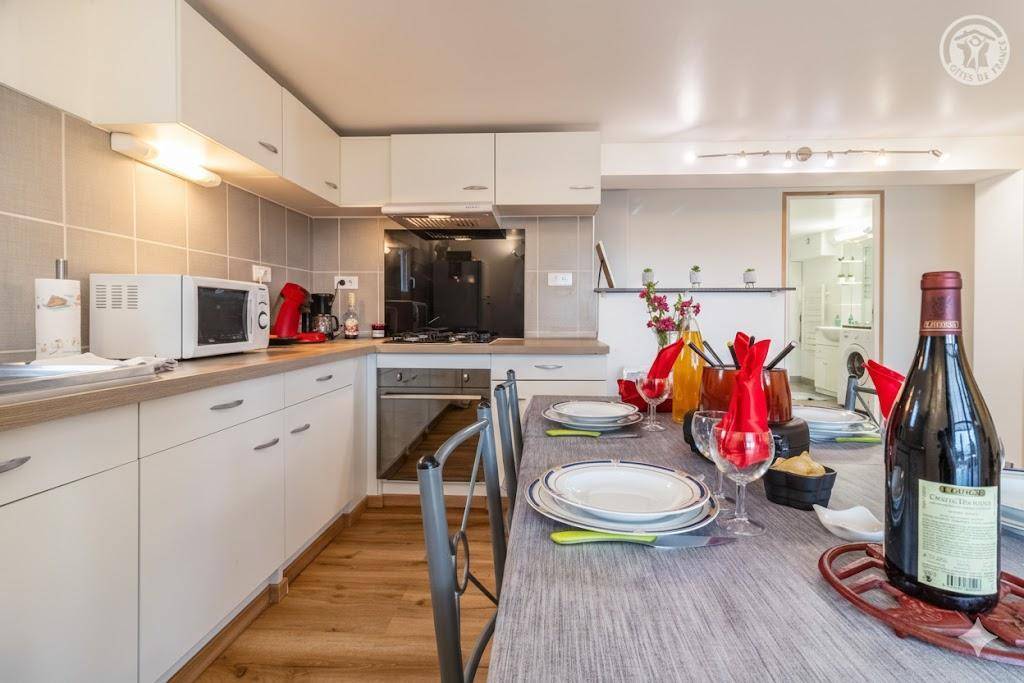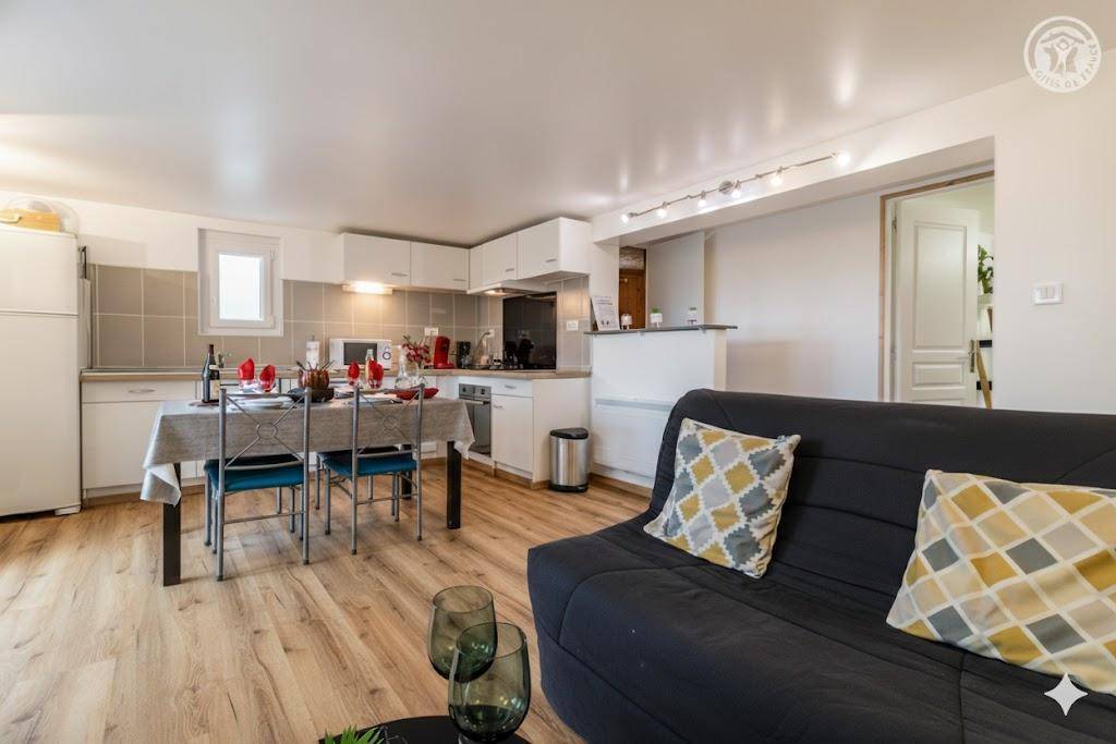 Unabhängige Gîte im Erdgeschoss des Hauses der Eigentümer. Einfaches und kostenloses Parken in der Gasse (Zugang zur asphaltierten Gîte über einen steilen Hang von der Gasse oder über eine Treppe). Zugang über die Holzterrasse (40 m²). Apartment mit Wohnküche (BZ-Sofa für 2 Personen 140x190 cm), 2 Schlafzimmern (1 Doppelbett 160x200 cm / 2 Einzelbetten 90x190 cm), Badezimmer (Dusche), WC. 1 Stufe zum Zugang zur Terrasse (dann 1 Stufe vom Wohnzimmer zum Badezimmer und 1 Stufe zum Zugang zum WC). Eingang zum Grundstück unter Videoüberwachung.