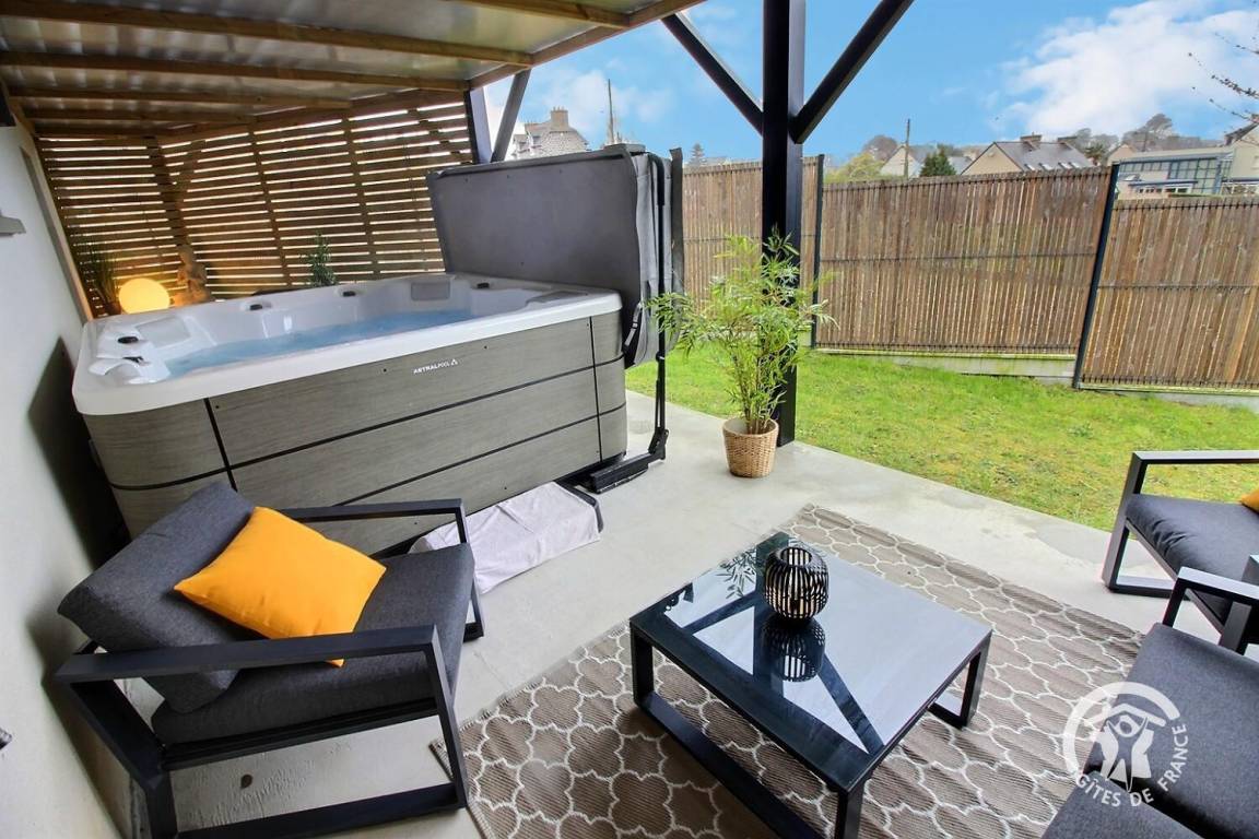 • Eine 30 m² große Terrasse auf der Gartenebene mit einer Entspannungslounge und einem Whirlpool für 6 Personen