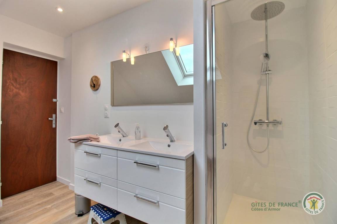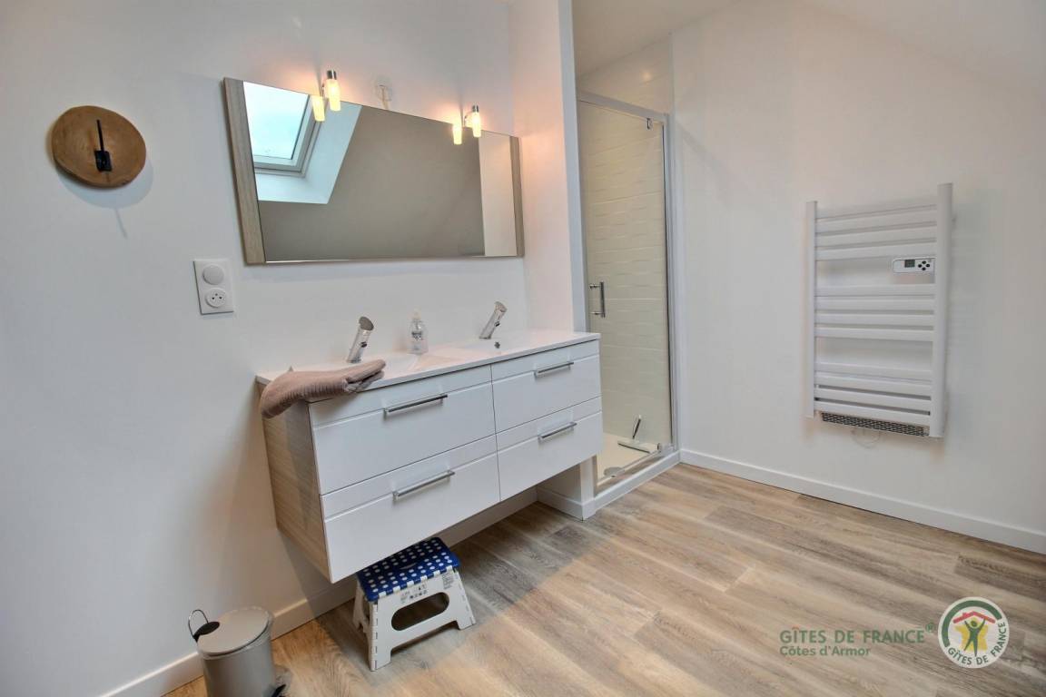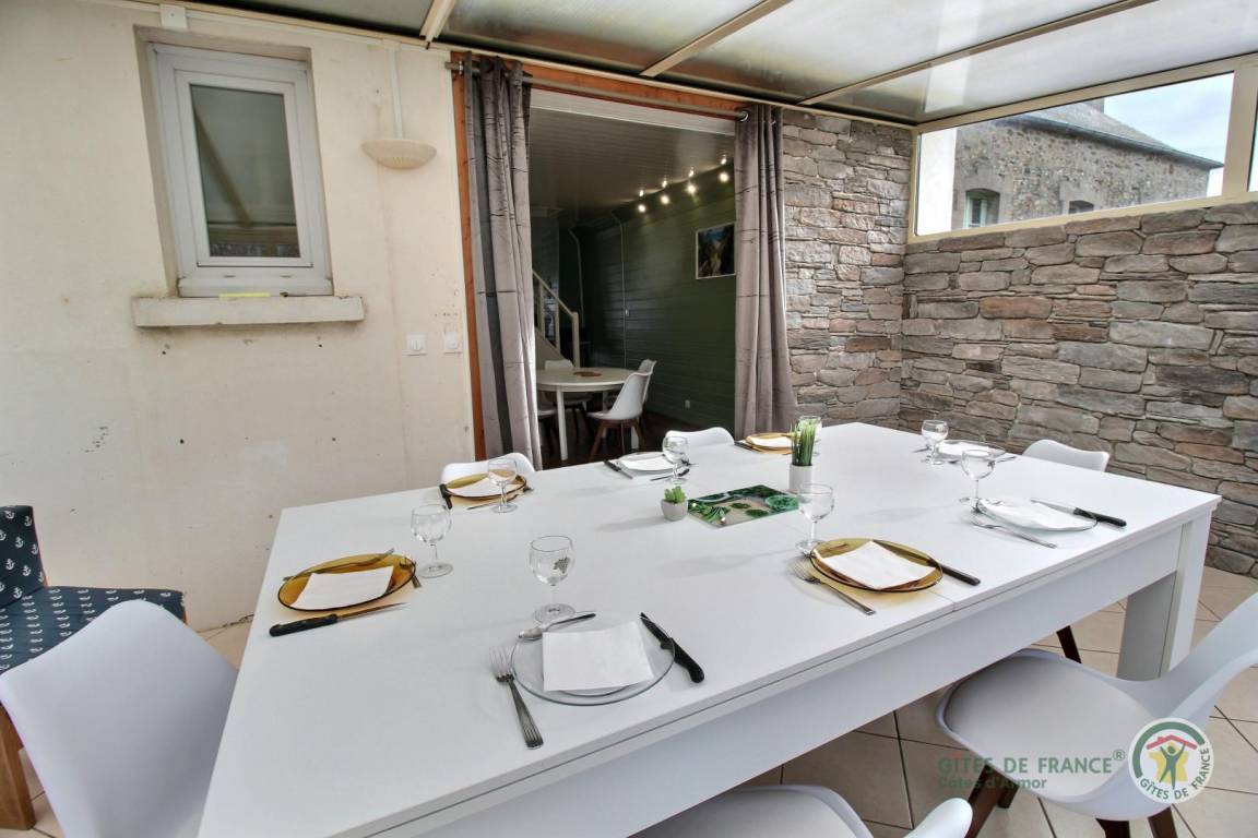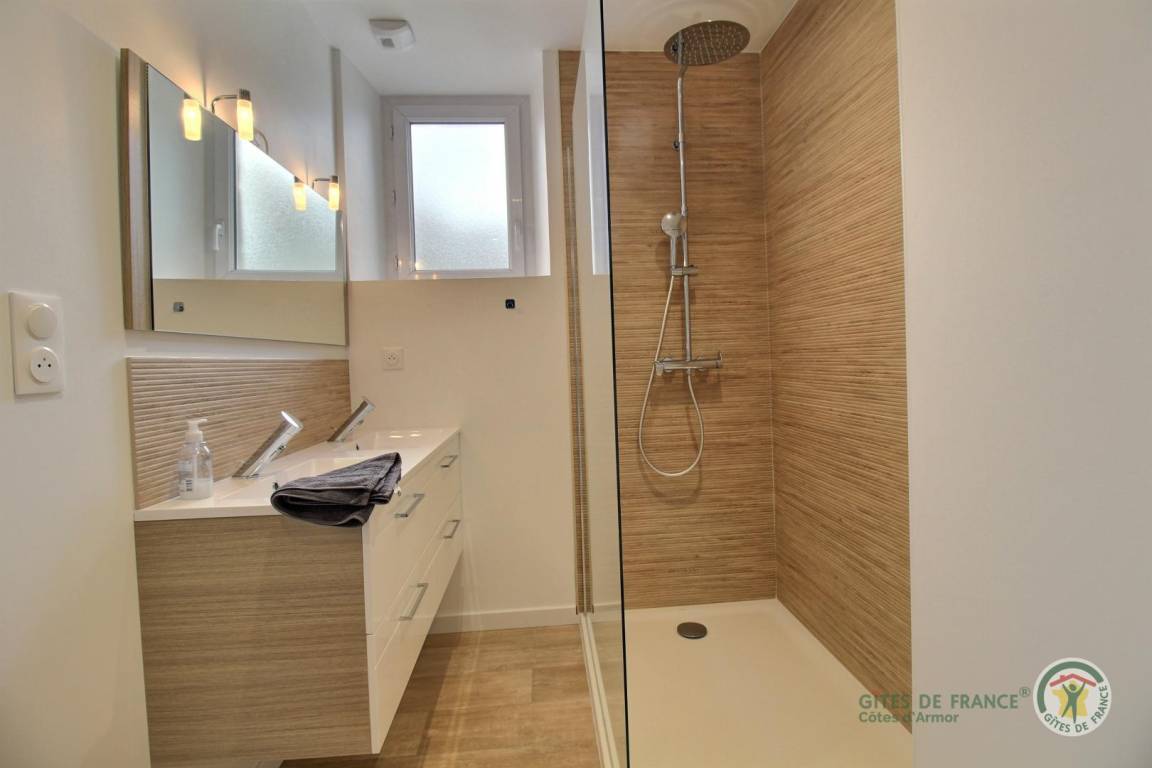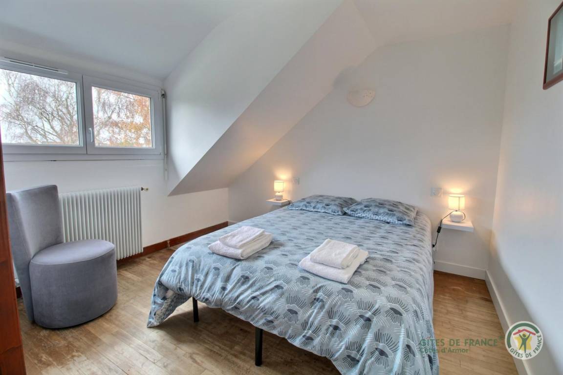 „Le gîte est très agréable, assez équipé pour faire deux services complets pour 10 personnes chacun (ça n'est pas toujours le cas dans les gîtes), ce qui ensuite rempli parfaitement le lave-vaisselle. Peut-être un petit manque de couteaux. Chambres agréables et propres, inégalité de fermeté entre les différents lits et oreillers: à tester en arrivant pour faire son choix;) il y en a pour tous les goûts. L'extérieur est agréable aussi, plusieurs jeux d'extérieur disponibles. Gîte très ensoleillé (parfois trop chaud dans la véranda, mais tout dépend de la météo extérieure, pour nous il faisait 28-30°c dehors). S'aère facilement grâce aux nombreuses fenêtres (attention peu se mettent en oscillo-battant, et celles du salon sont juste au dessus du canapé: Impossible d'ouvrir durant la présence de jeunes enfants escaladeurs).Nous avons apprécié le nombre de salles d'eau ainsi que les 3 wc indépendants, un vrai plus à 10 personnes !Le seul problème du gîte est sa localisation: Voiture ou vélo obligatoire pour aller à Saint-Cast. Avec sortie du parking délicate sur route très passante et dans un virage, le mieux est de prendre le temps de se garer en marche arrière afin d'avoir une bonne visibilité pour repartir. À pieds vous pouvez accéder à une petite plage à 2km, par contre pente à 10% à la fin. Accès possible à pieds aux pierres sonnantes et au château du Guildo. Par contre petit square pour enfants juste en face, ainsi que les conteneurs pour recyclage. Boulangerie et biscuiterie/Boutique souvenir à environ 1km, faisable à pieds. Petite cidrerie fermière accessible à pieds. Plusieurs activités estivales à Saint-Cast, nous n'avons testé que le cinéma en plein air mais c'était une réussite !Niveau accueil et départ, propriétaires très sympathiques, arrangeants, cadeau de bienvenue très apprécié. Gîte probablement très adapté aux cyclistes avec espace extérieur couvert pour ranger les vélos, piste cyclable à proximité et lieux d'intérêt à distance raisonnable.“