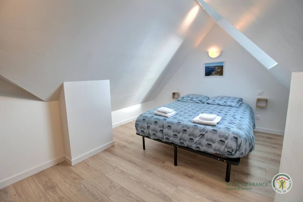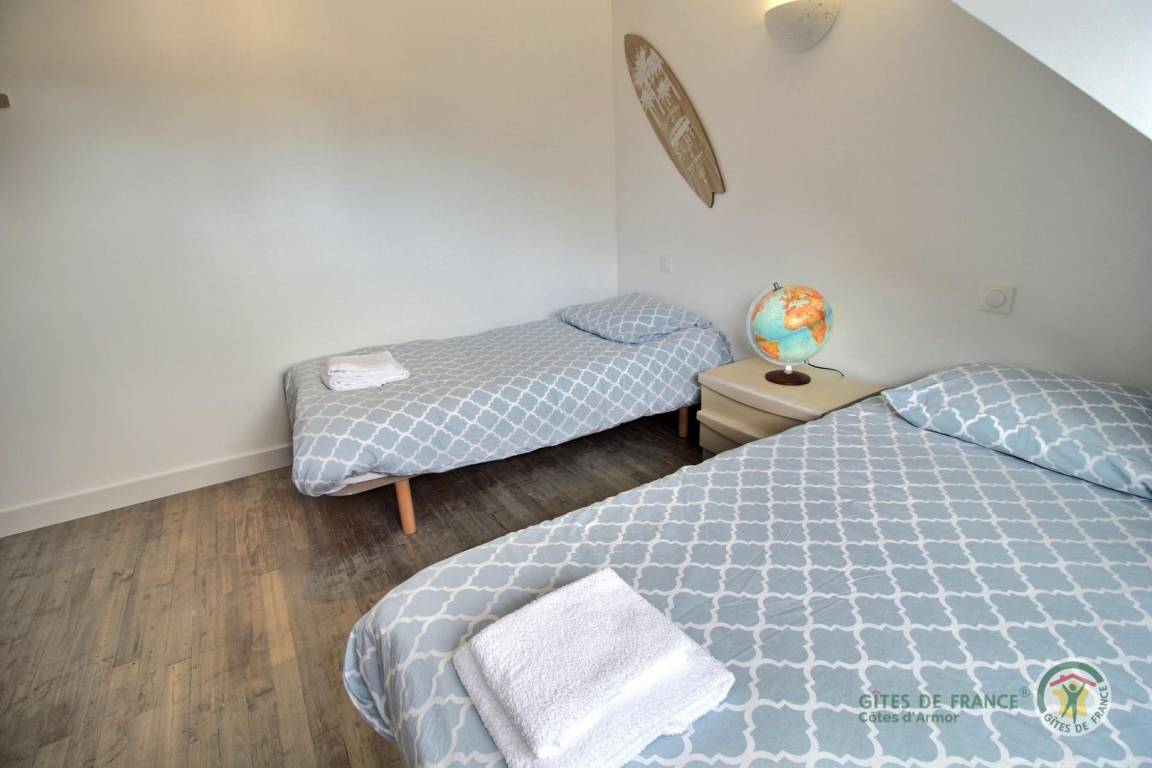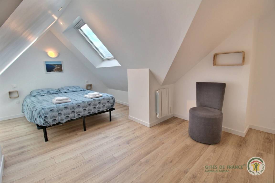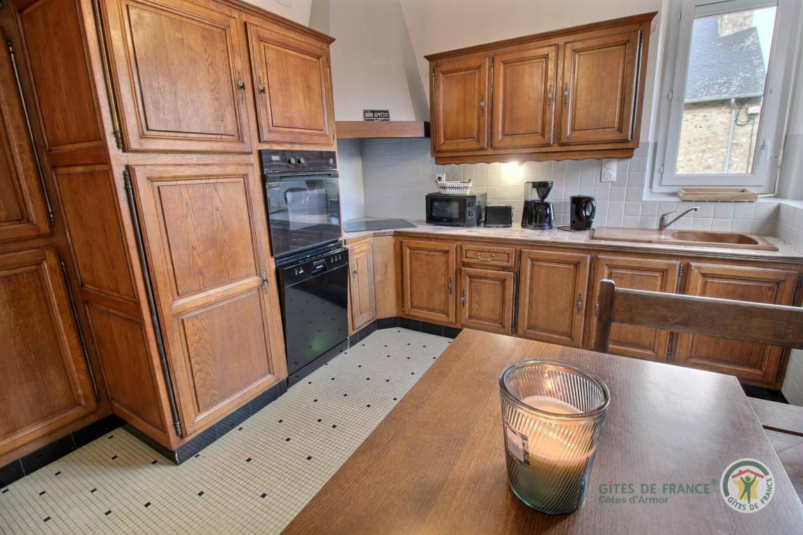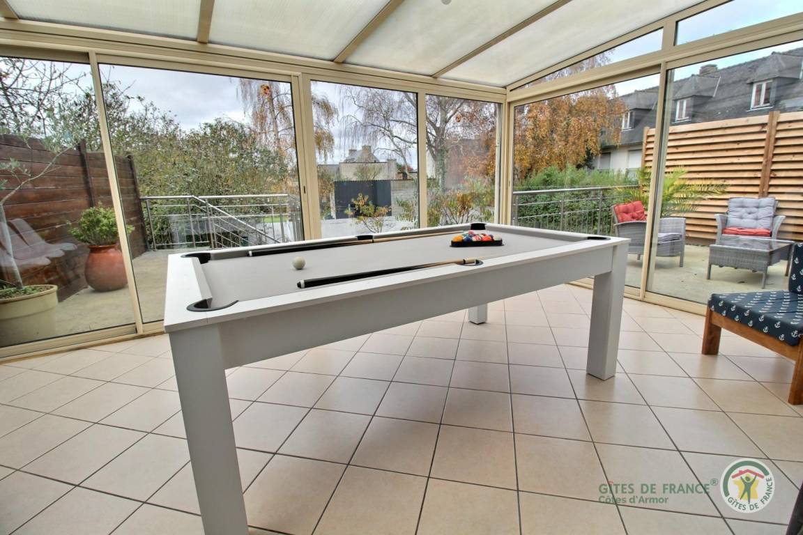 „Le gîte est très agréable, assez équipé pour faire deux services complets pour 10 personnes chacun (ça n'est pas toujours le cas dans les gîtes), ce qui ensuite rempli parfaitement le lave-vaisselle. Peut-être un petit manque de couteaux. Chambres agréables et propres, inégalité de fermeté entre les différents lits et oreillers: à tester en arrivant pour faire son choix;) il y en a pour tous les goûts. L'extérieur est agréable aussi, plusieurs jeux d'extérieur disponibles. Gîte très ensoleillé (parfois trop chaud dans la véranda, mais tout dépend de la météo extérieure, pour nous il faisait 28-30°c dehors). S'aère facilement grâce aux nombreuses fenêtres (attention peu se mettent en oscillo-battant, et celles du salon sont juste au dessus du canapé: Impossible d'ouvrir durant la présence de jeunes enfants escaladeurs).Nous avons apprécié le nombre de salles d'eau ainsi que les 3 wc indépendants, un vrai plus à 10 personnes !Le seul problème du gîte est sa localisation: Voiture ou vélo obligatoire pour aller à Saint-Cast. Avec sortie du parking délicate sur route très passante et dans un virage, le mieux est de prendre le temps de se garer en marche arrière afin d'avoir une bonne visibilité pour repartir. À pieds vous pouvez accéder à une petite plage à 2km, par contre pente à 10% à la fin. Accès possible à pieds aux pierres sonnantes et au château du Guildo. Par contre petit square pour enfants juste en face, ainsi que les conteneurs pour recyclage. Boulangerie et biscuiterie/Boutique souvenir à environ 1km, faisable à pieds. Petite cidrerie fermière accessible à pieds. Plusieurs activités estivales à Saint-Cast, nous n'avons testé que le cinéma en plein air mais c'était une réussite !Niveau accueil et départ, propriétaires très sympathiques, arrangeants, cadeau de bienvenue très apprécié. Gîte probablement très adapté aux cyclistes avec espace extérieur couvert pour ranger les vélos, piste cyclable à proximité et lieux d'intérêt à distance raisonnable.“