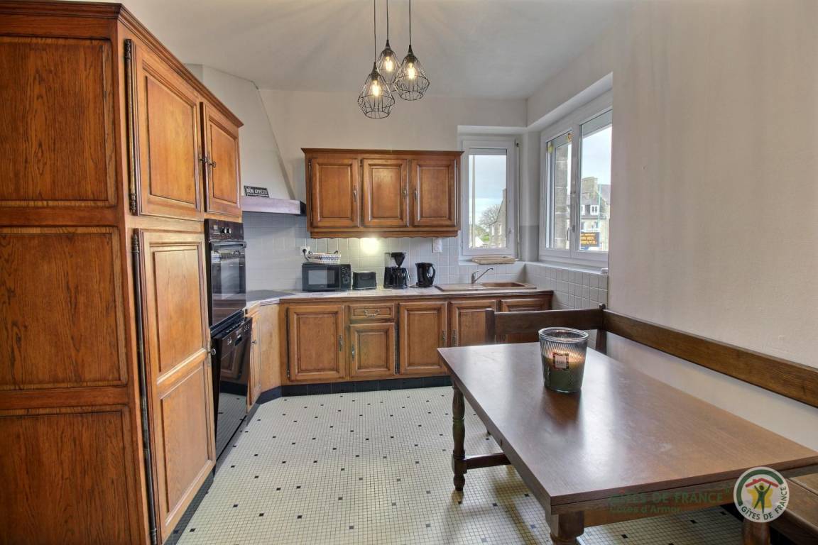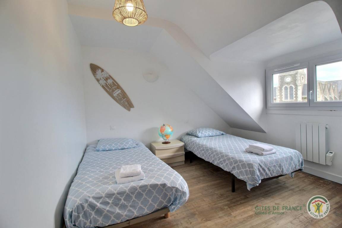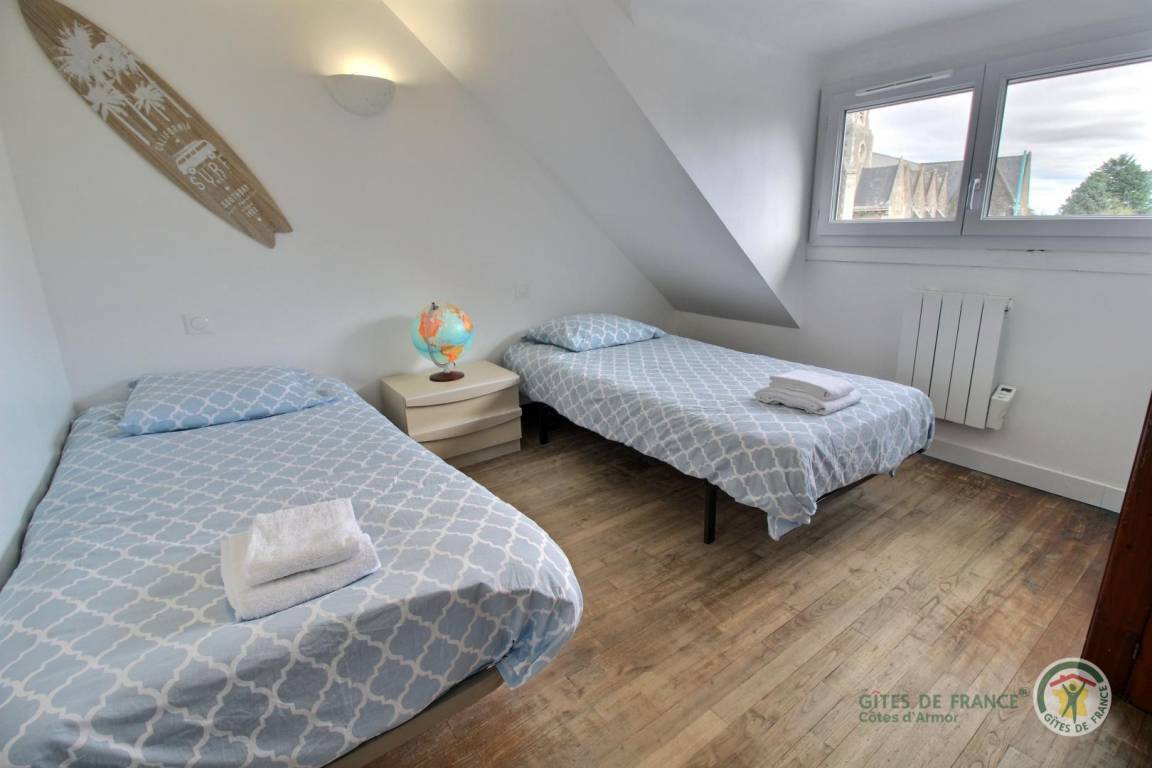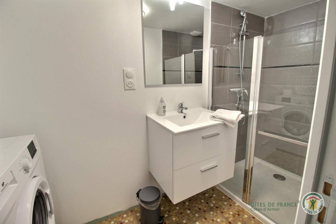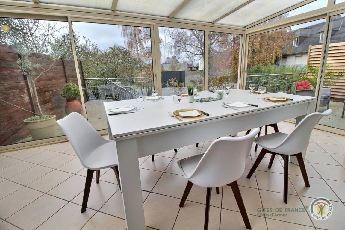 „Le gîte est très agréable, assez équipé pour faire deux services complets pour 10 personnes chacun (ça n'est pas toujours le cas dans les gîtes), ce qui ensuite rempli parfaitement le lave-vaisselle. Peut-être un petit manque de couteaux. Chambres agréables et propres, inégalité de fermeté entre les différents lits et oreillers: à tester en arrivant pour faire son choix;) il y en a pour tous les goûts. L'extérieur est agréable aussi, plusieurs jeux d'extérieur disponibles. Gîte très ensoleillé (parfois trop chaud dans la véranda, mais tout dépend de la météo extérieure, pour nous il faisait 28-30°c dehors). S'aère facilement grâce aux nombreuses fenêtres (attention peu se mettent en oscillo-battant, et celles du salon sont juste au dessus du canapé: Impossible d'ouvrir durant la présence de jeunes enfants escaladeurs).Nous avons apprécié le nombre de salles d'eau ainsi que les 3 wc indépendants, un vrai plus à 10 personnes !Le seul problème du gîte est sa localisation: Voiture ou vélo obligatoire pour aller à Saint-Cast. Avec sortie du parking délicate sur route très passante et dans un virage, le mieux est de prendre le temps de se garer en marche arrière afin d'avoir une bonne visibilité pour repartir. À pieds vous pouvez accéder à une petite plage à 2km, par contre pente à 10% à la fin. Accès possible à pieds aux pierres sonnantes et au château du Guildo. Par contre petit square pour enfants juste en face, ainsi que les conteneurs pour recyclage. Boulangerie et biscuiterie/Boutique souvenir à environ 1km, faisable à pieds. Petite cidrerie fermière accessible à pieds. Plusieurs activités estivales à Saint-Cast, nous n'avons testé que le cinéma en plein air mais c'était une réussite !Niveau accueil et départ, propriétaires très sympathiques, arrangeants, cadeau de bienvenue très apprécié. Gîte probablement très adapté aux cyclistes avec espace extérieur couvert pour ranger les vélos, piste cyclable à proximité et lieux d'intérêt à distance raisonnable.“