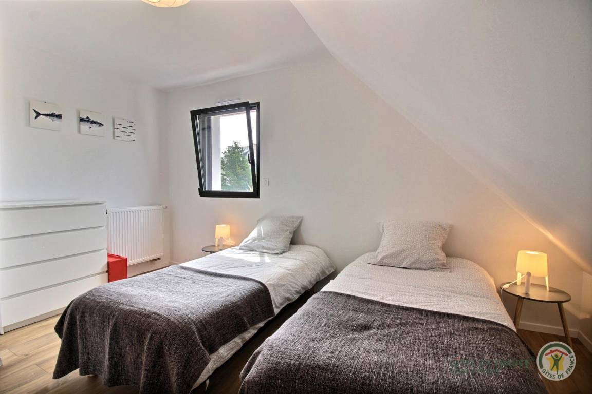 - Im Obergeschoss: 2 Schlafzimmer, eines mit Meerblick (ein 160-cm-Bett und zwei 90-cm-Betten) und ein Badezimmer mit WC.