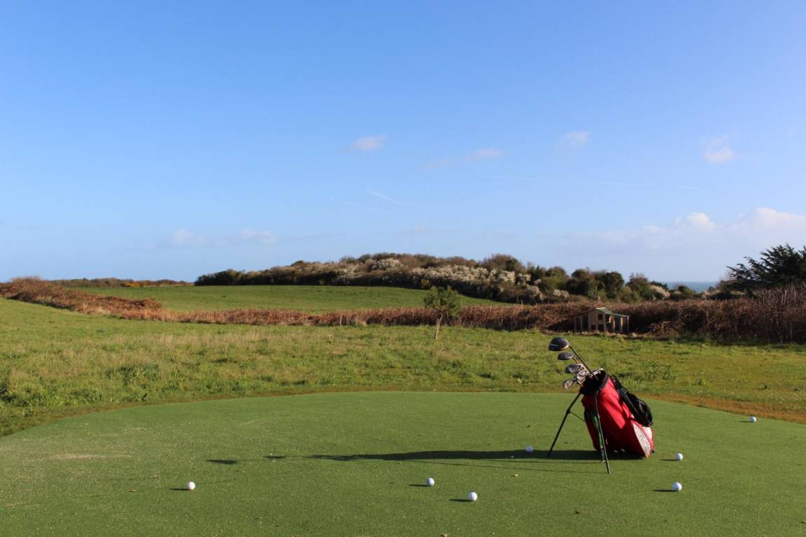 Kleiner angelegter Golfplatz. Terrasse an der Vorder- und Rückseite des Ferienhauses.