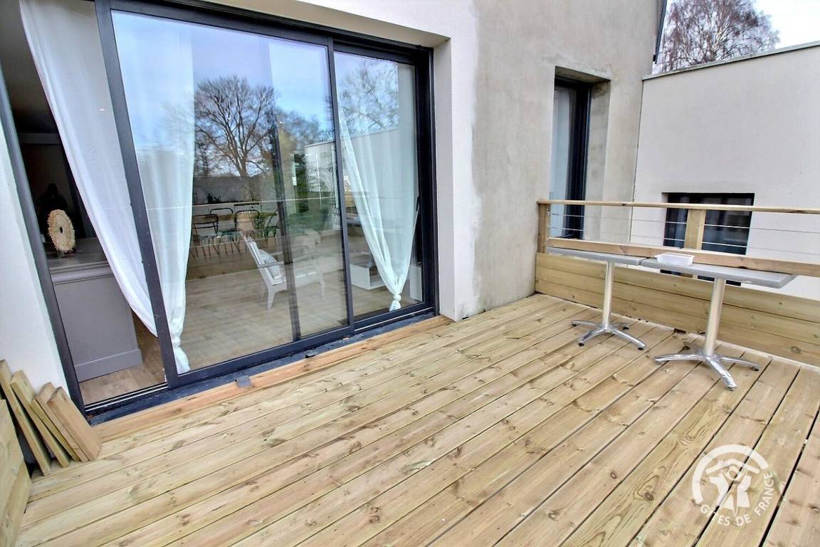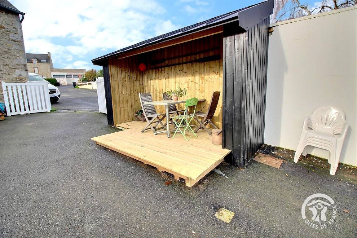 Eine private Terrasse von 19 m² auf der Rückseite des Ferienhauses mit Zugang zu einem kleinen Zierrasen.