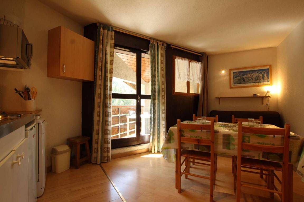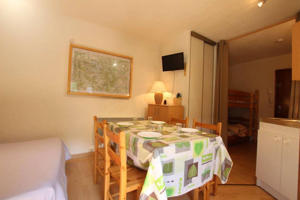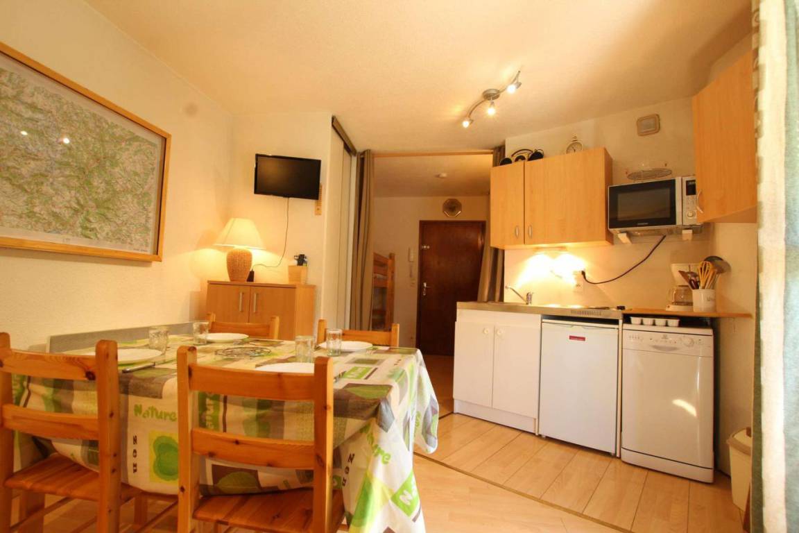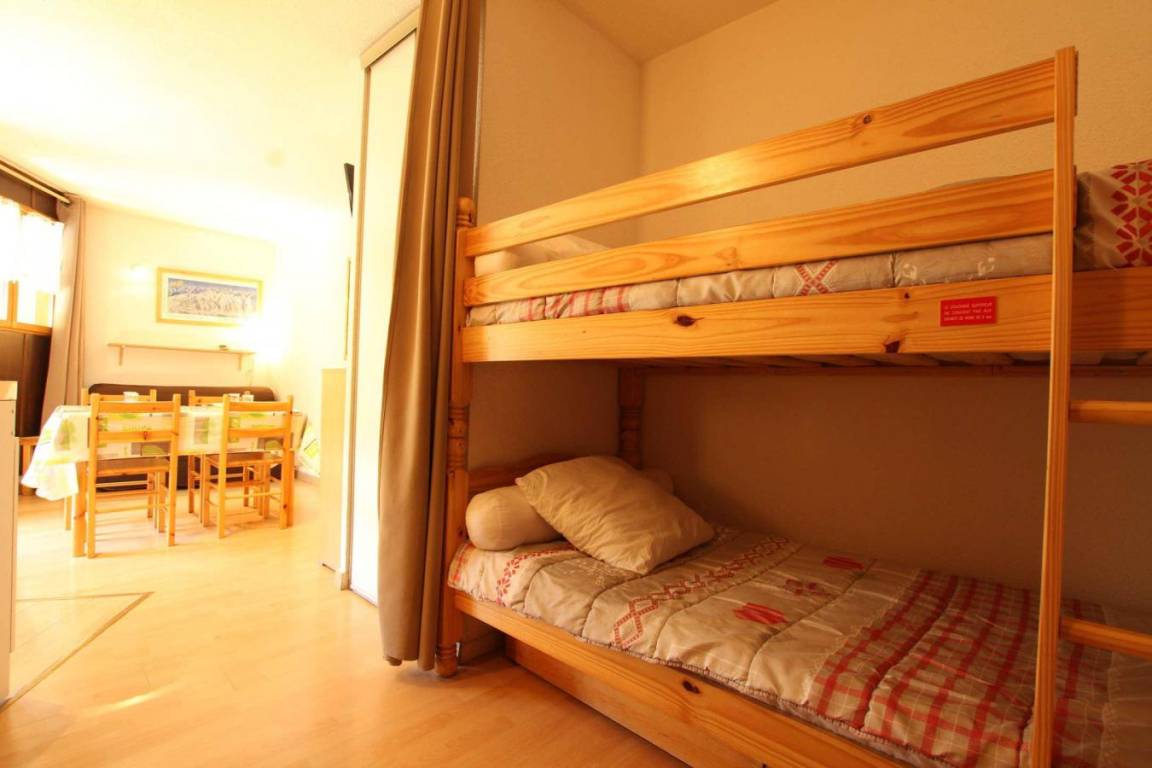 Fläche von ungefähr 23 m². 3te Etage. Orientierung : Süd, West. Blick skipisten. Wohnzimmer mit Klappschlafcouch (140). offener Schlafbereich mit 2 Stockbetten. Kochnische mit Raclettegerät, Wasserkocher, Kaffeemaschine, Toaster, Geschirrspülmaschine, Mikrowellenherd, 2 elektronische Herdplatten, Kühlschrank. Badezimmer mit Badewanne, Waschbecken, WC. Balkon mit Gartentisch und -stühle. Die oberen Betten sind nicht für Kinder unter 6 Jahren geeignet.