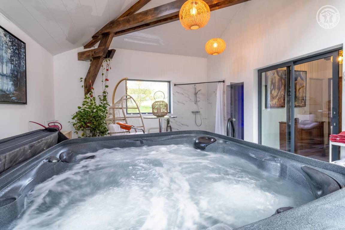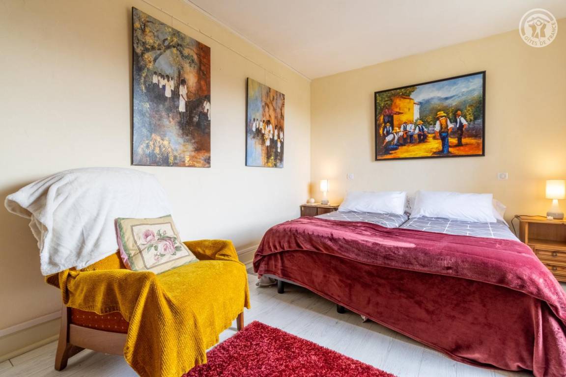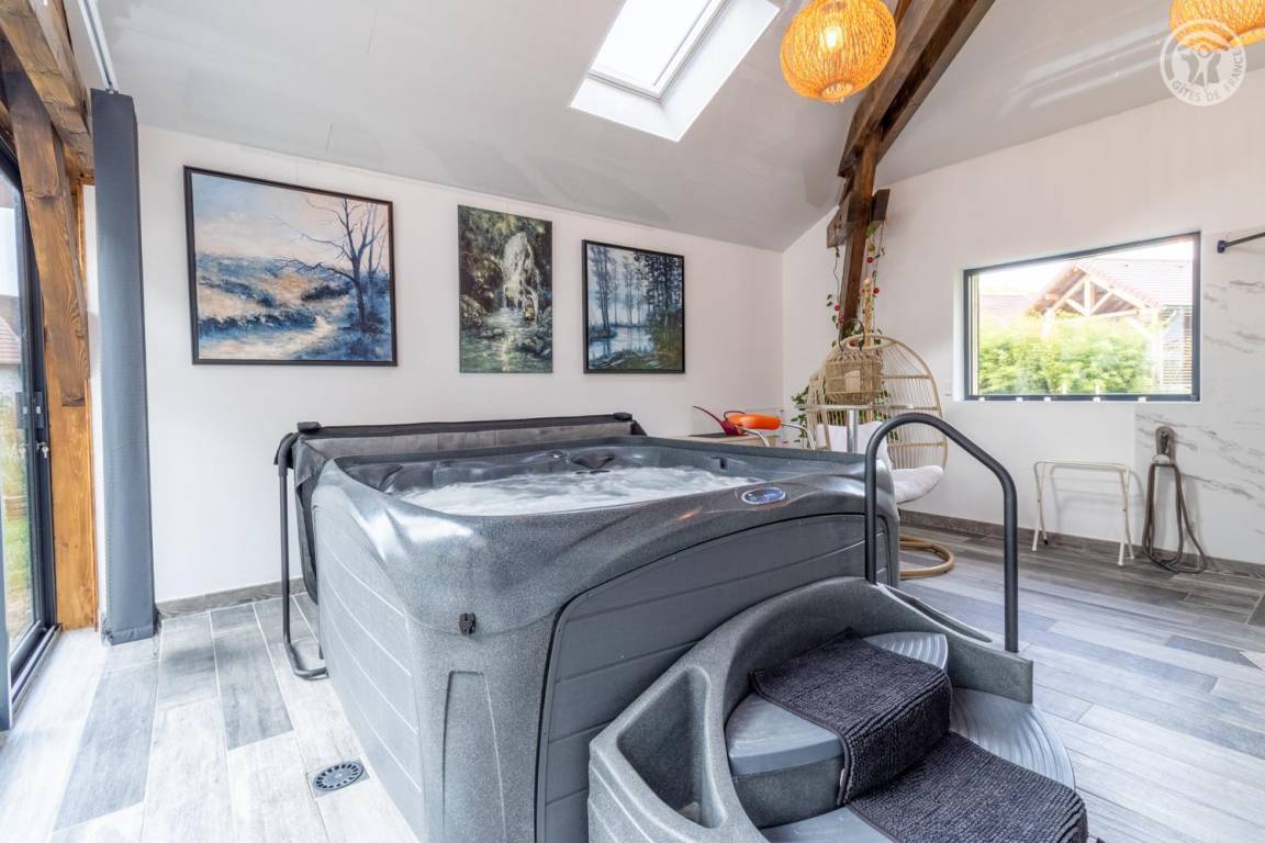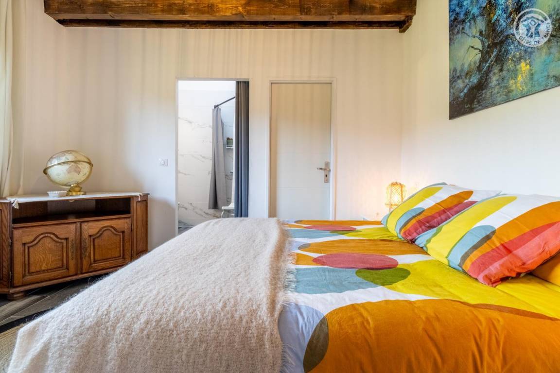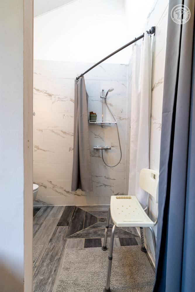 Im Erdgeschoss und 1. Stock des Hauses der Eigentümer. Privatparkplatz neben dem Chalet. Unabhängiger Zugang, auf einer Ebene: Wohnzimmer-Küche, Wellnessbereich (6-Sitzer-Spa, Hamam und Dusche), PMR-Schlafzimmer (1 Doppelbett 160x200 cm mit Bad - Dusche + WC - privat und Waschküche (Waschmaschine), Badezimmer (Dusche), separates WC Im 1. Stock: 2 Schlafzimmer (1 Doppelbett 160x200 cm / 2 Einzelbetten 90x200 cm. Große private Terrasse und gemeinsamer, möblierter Garten.