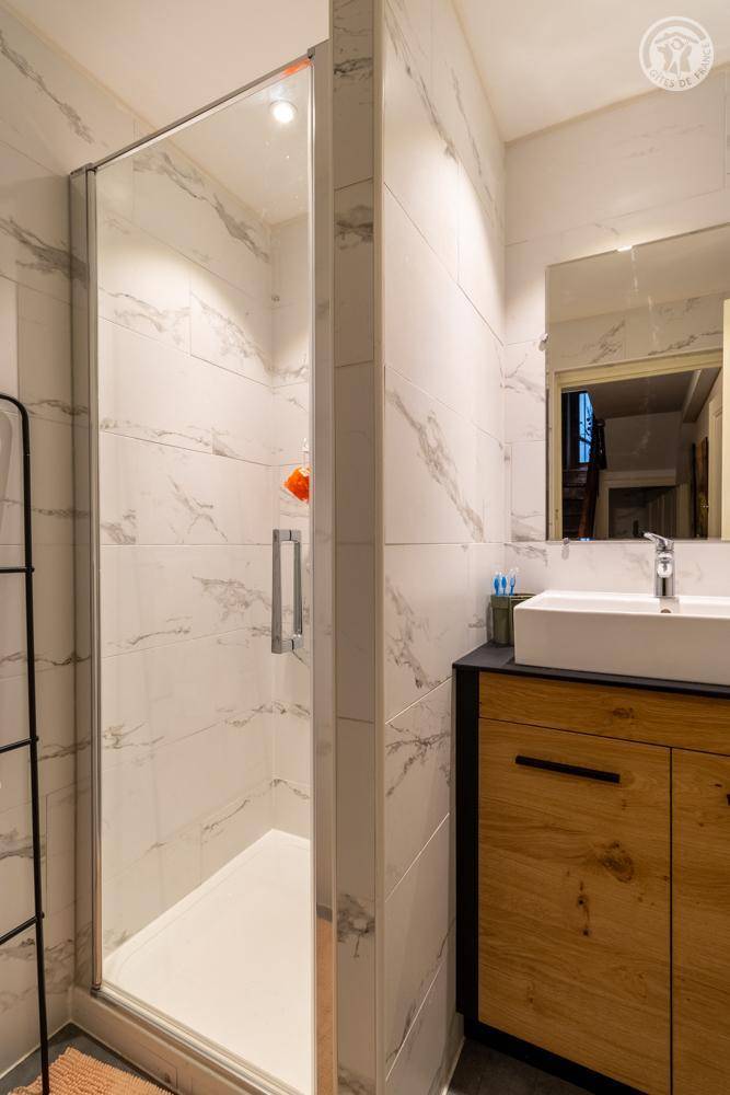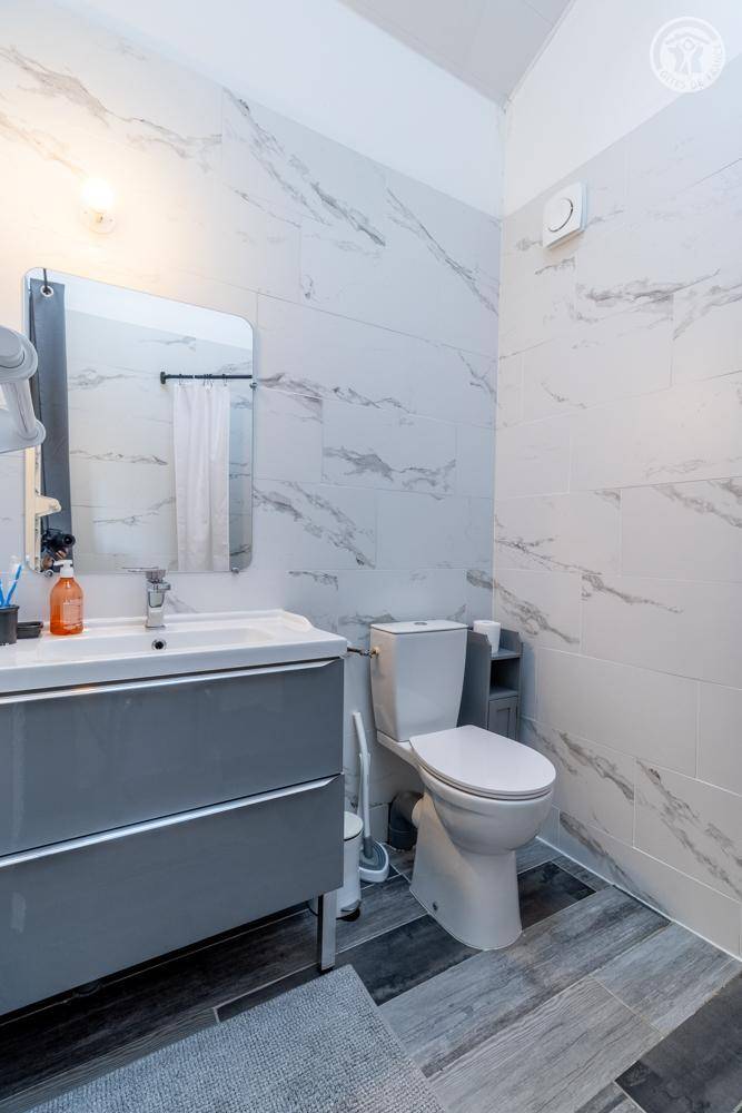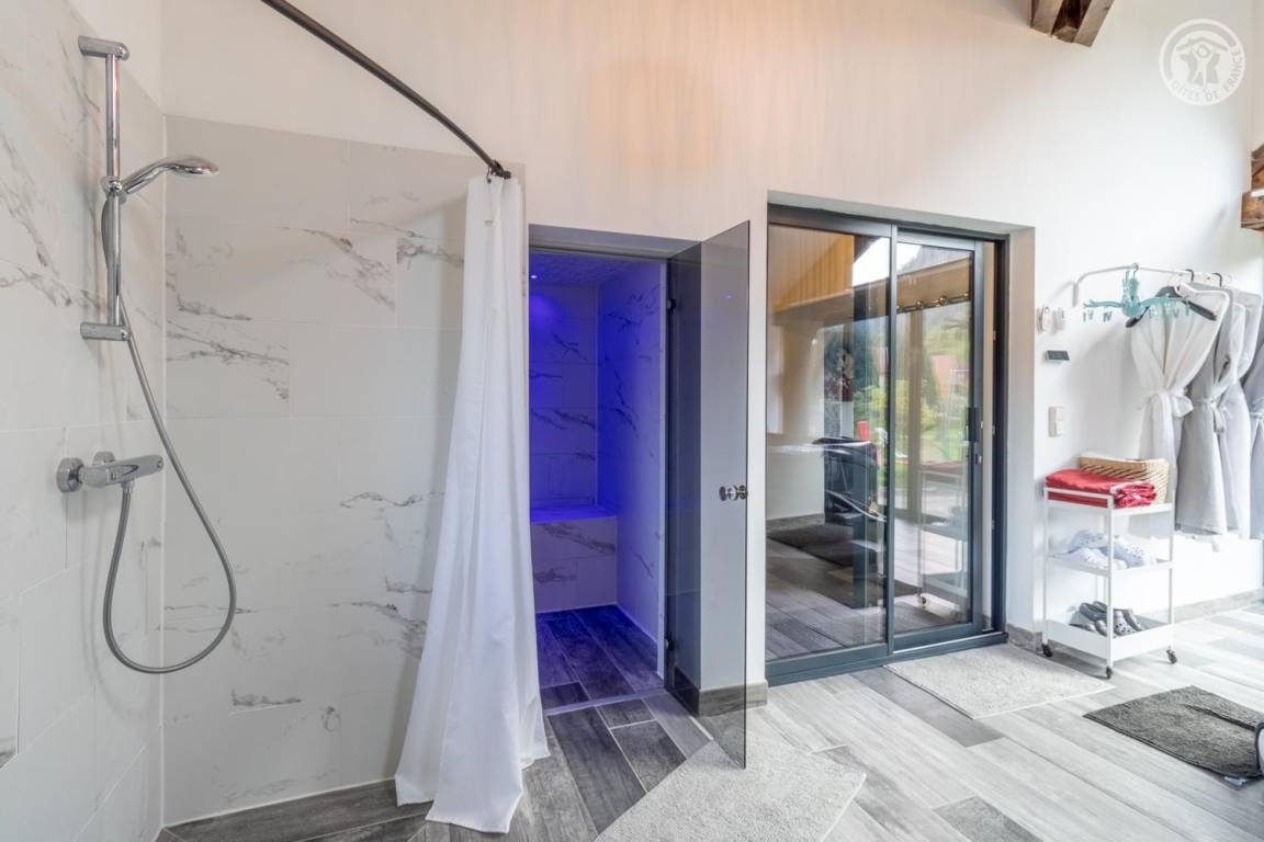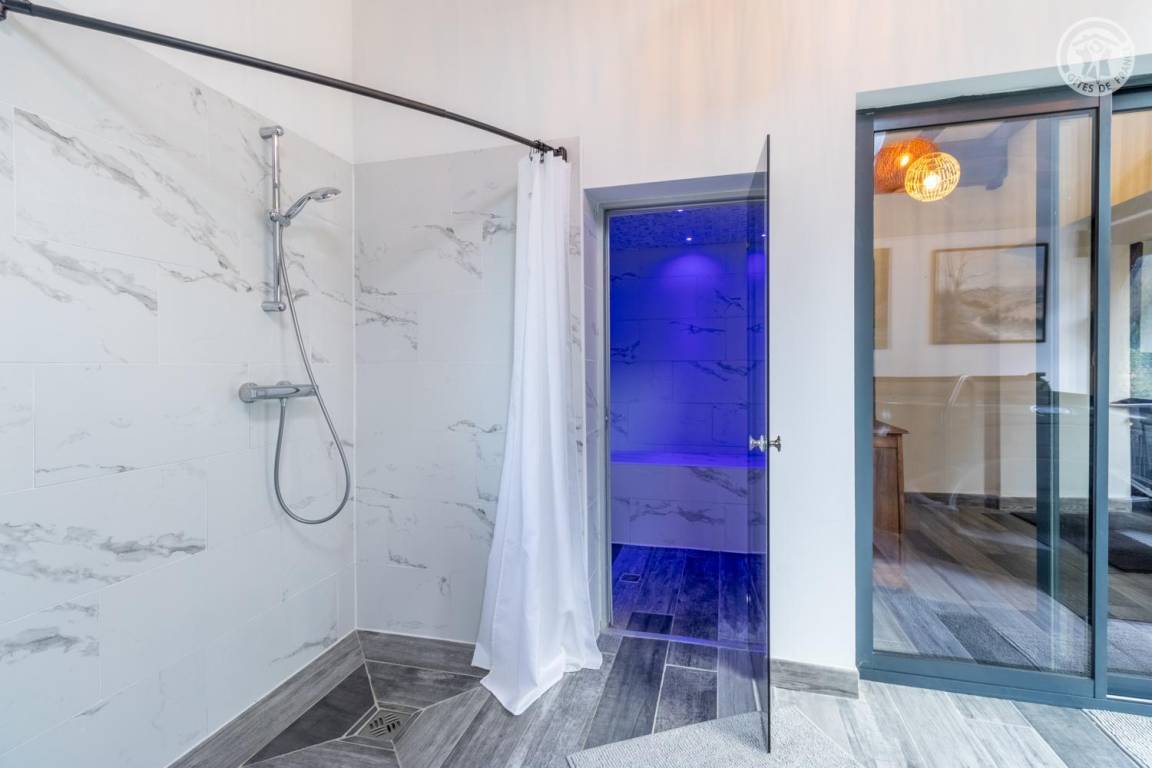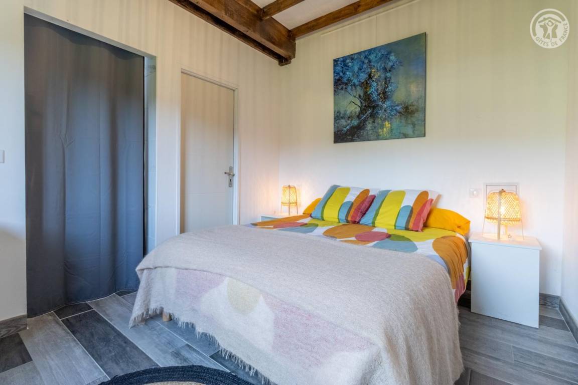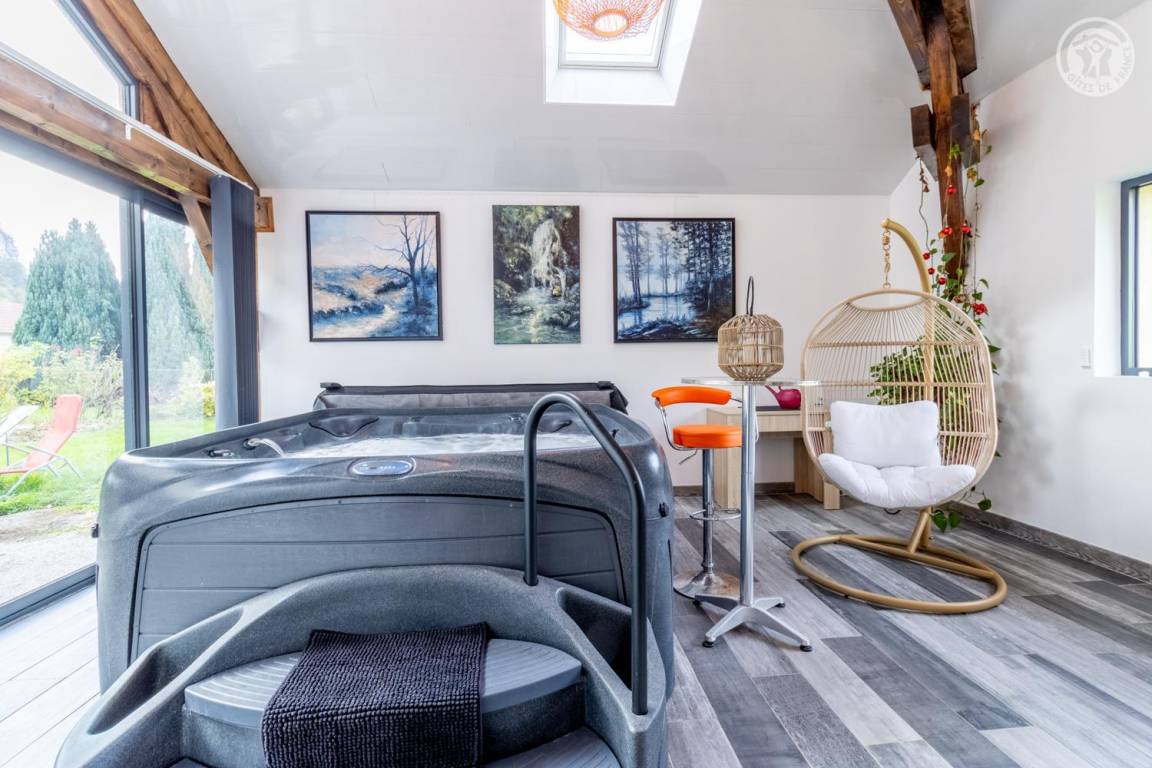 Im Erdgeschoss und 1. Stock des Hauses der Eigentümer. Privatparkplatz neben dem Chalet. Unabhängiger Zugang, auf einer Ebene: Wohnzimmer-Küche, Wellnessbereich (6-Sitzer-Spa, Hamam und Dusche), PMR-Schlafzimmer (1 Doppelbett 160x200 cm mit Bad - Dusche + WC - privat und Waschküche (Waschmaschine), Badezimmer (Dusche), separates WC Im 1. Stock: 2 Schlafzimmer (1 Doppelbett 160x200 cm / 2 Einzelbetten 90x200 cm. Große private Terrasse und gemeinsamer, möblierter Garten.