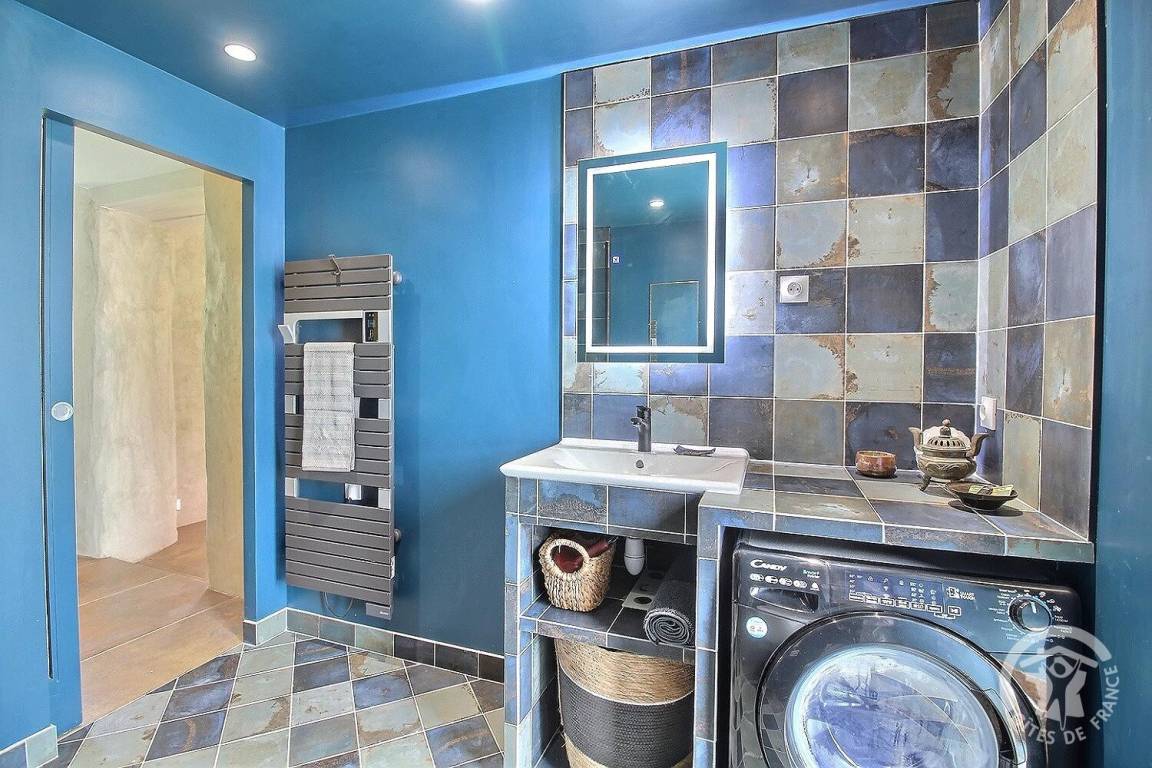 - Eine halbe Stufe führt zum Badezimmer mit Dusche, Waschbecken, kombinierter Waschmaschine und Trockner sowie Toilette.