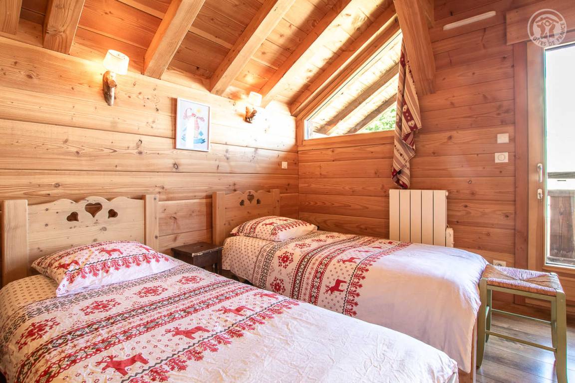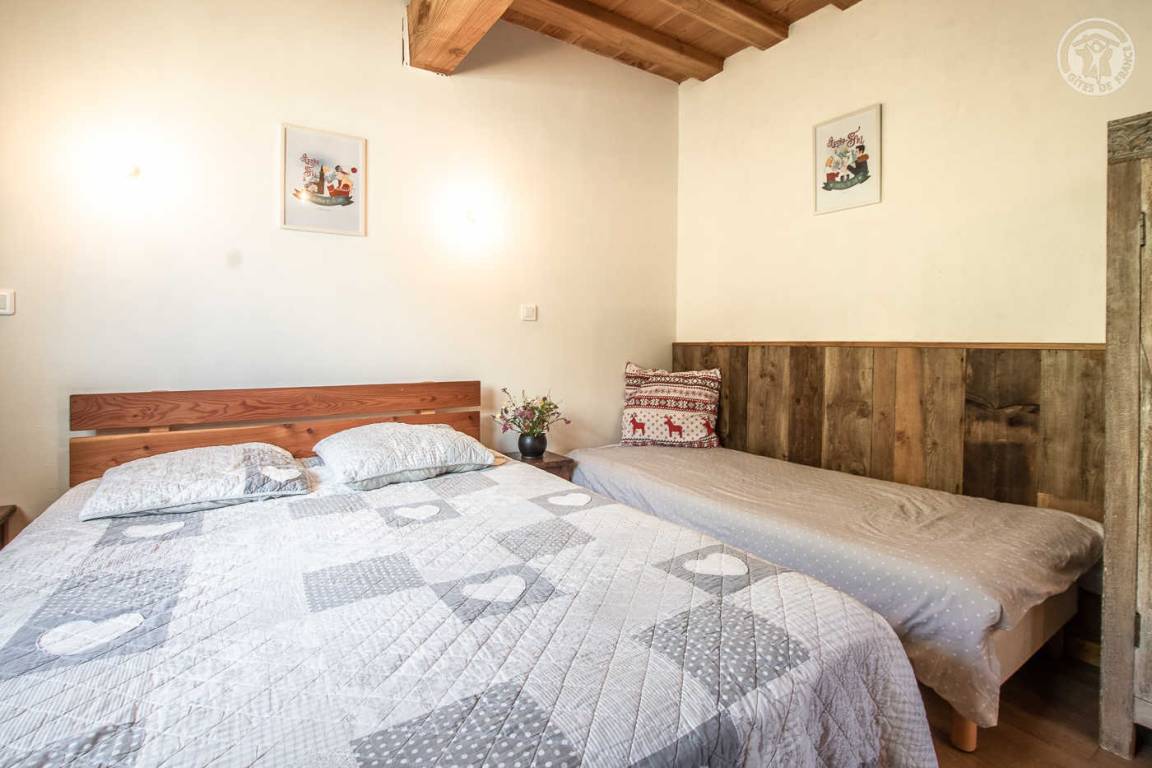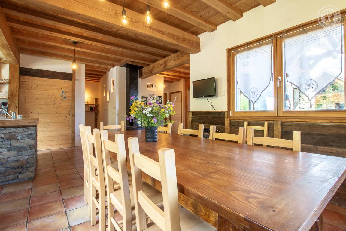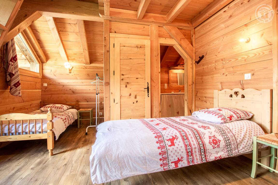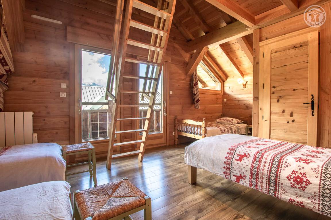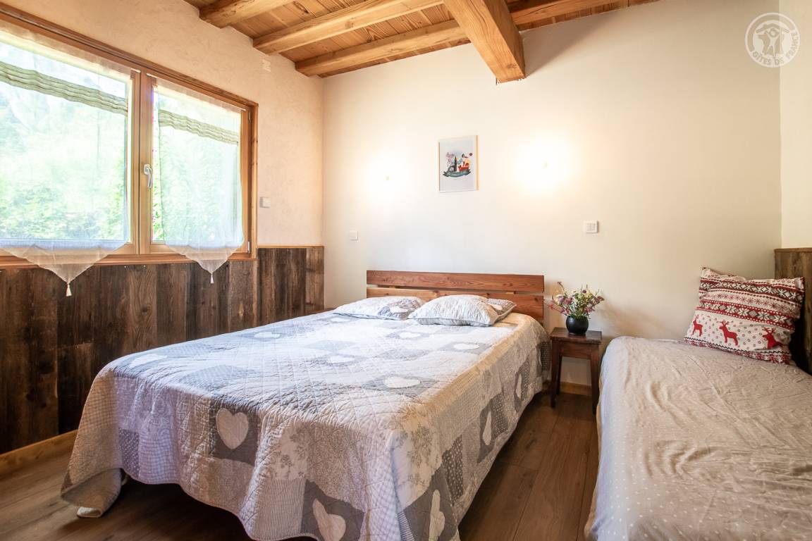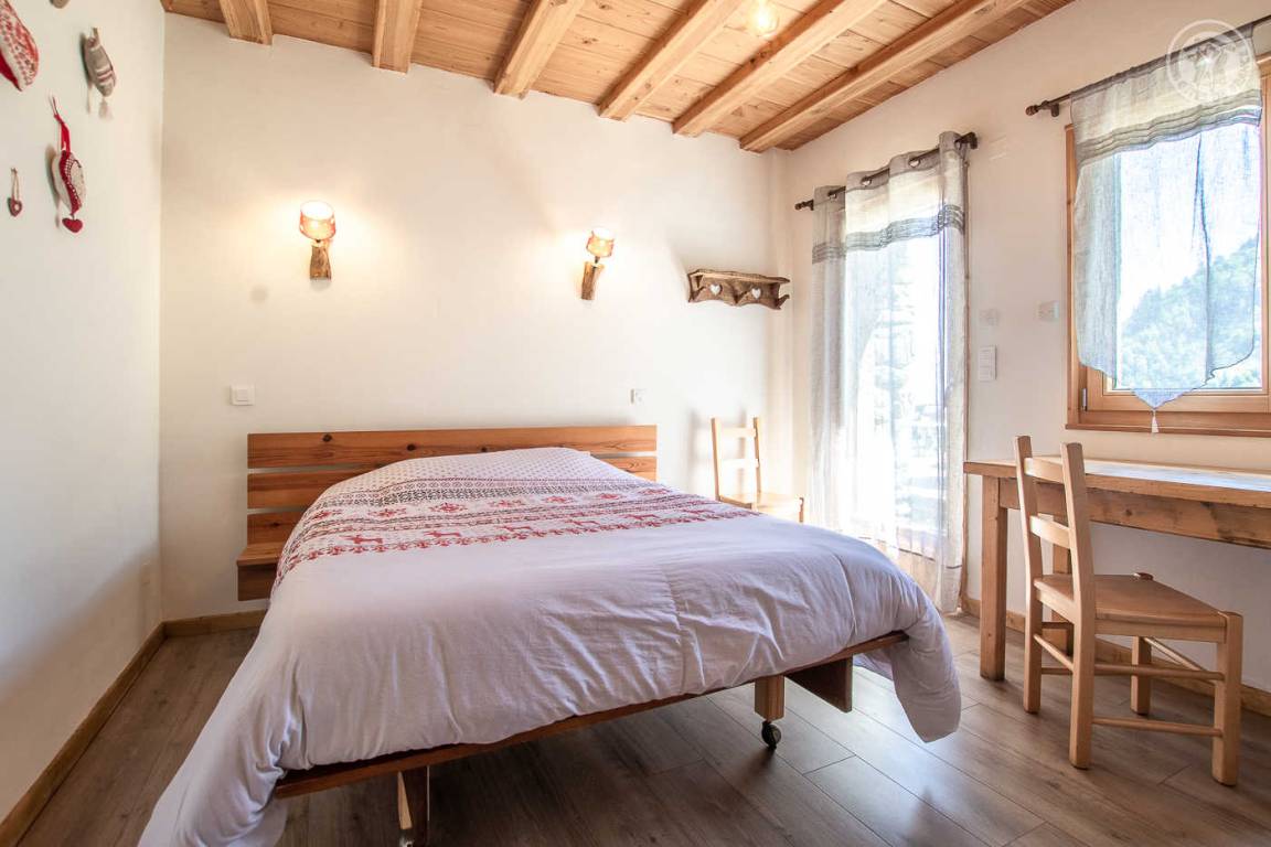 Alpenchalet mit 2 Ferienhäusern (mit separatem Eingang). Das Ferienhaus erstreckt sich über 2 Ebenen und besteht im Erdgeschoss aus: Eingang zum Wohnzimmer mit Küche und Wohnzimmer, 2 Schlafzimmern (1 Doppelbett 140 x 190 cm mit separatem WC und Waschbecken / 1 Doppelbett 140 x 190 cm + 1 Einzelbett 90 x 190 cm), Badezimmer (Dusche), separates WC. Im 1. Stock: 1 Schlafzimmer mit eigenem Badezimmer (Dusche) und separatem WC (4 Einzelbetten 90 x 190 cm und 1 Zwischengeschoss im Dachgeschoss mit Zugang über eine Leiter, mit 1 Doppelmatratze 140 x 190 cm). Private Balkonterrasse. Gemeinsames Grundstück.