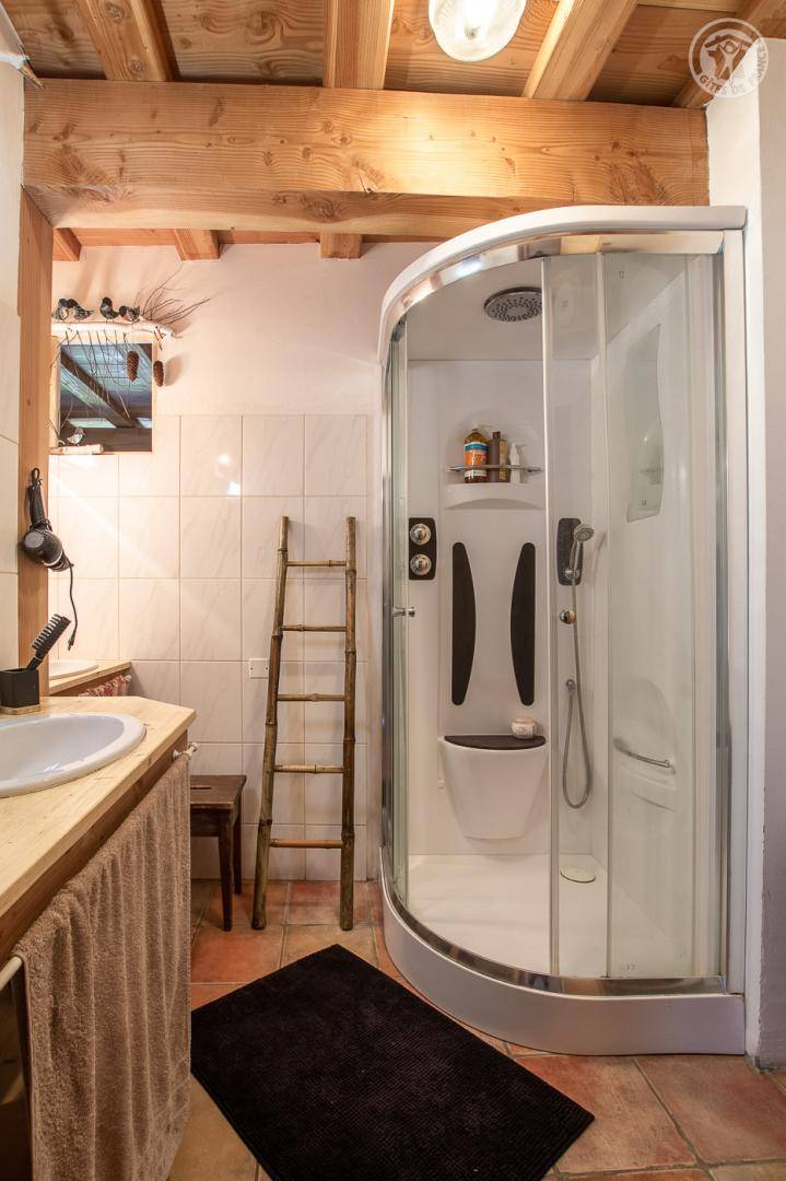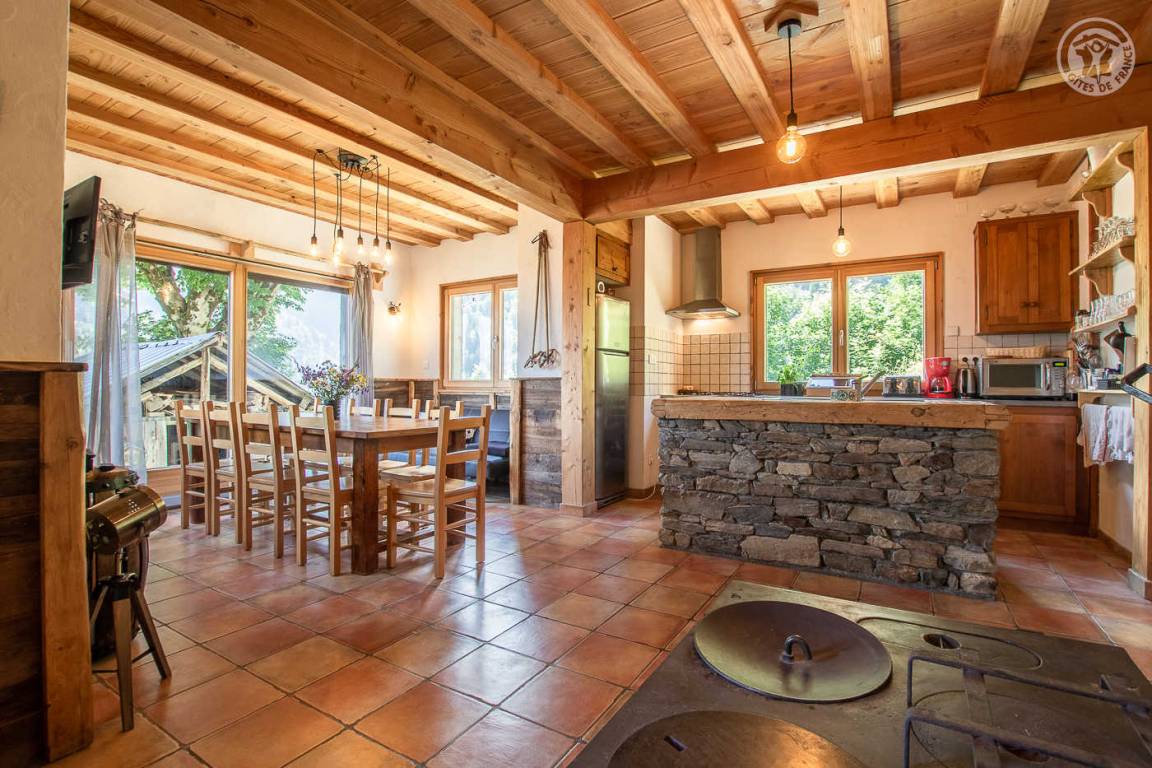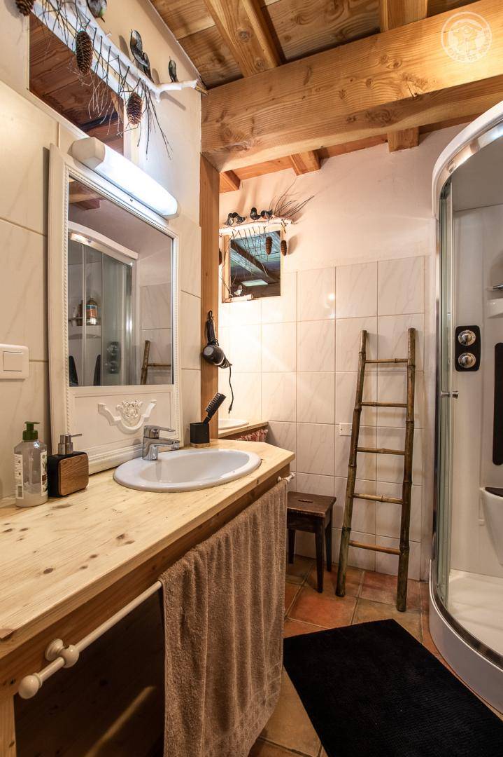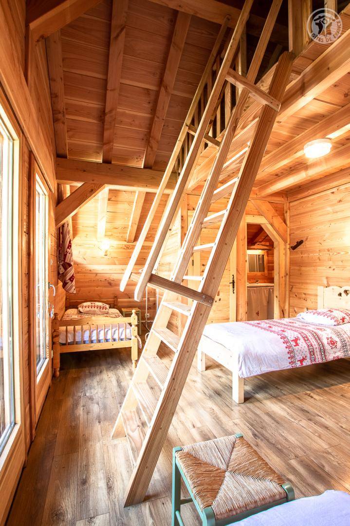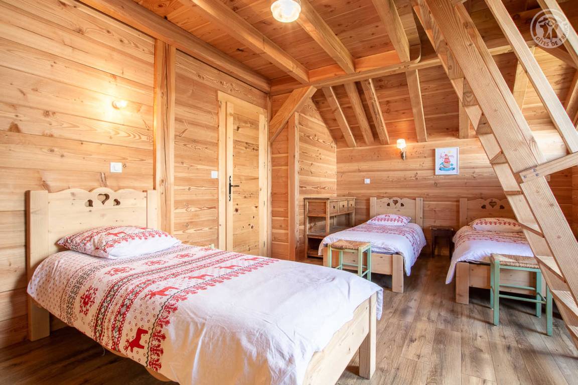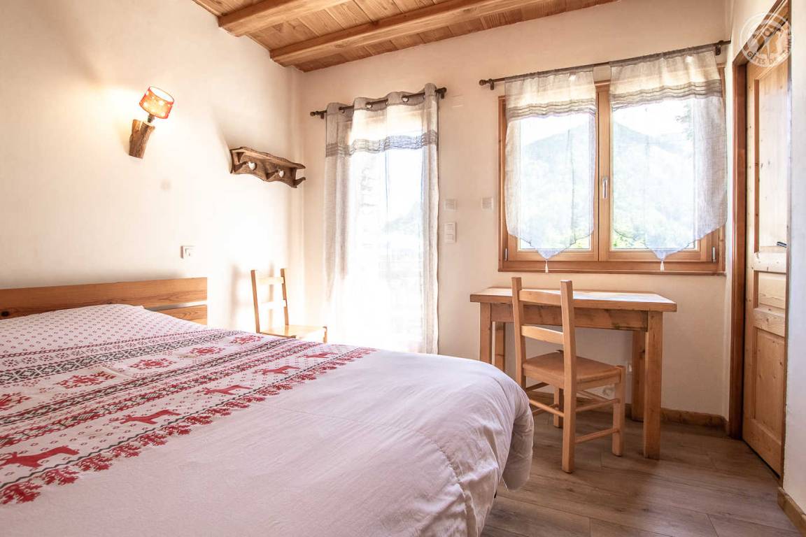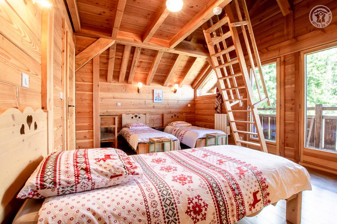 Alpenchalet mit 2 Ferienhäusern (mit separatem Eingang). Das Ferienhaus erstreckt sich über 2 Ebenen und besteht im Erdgeschoss aus: Eingang zum Wohnzimmer mit Küche und Wohnzimmer, 2 Schlafzimmern (1 Doppelbett 140 x 190 cm mit separatem WC und Waschbecken / 1 Doppelbett 140 x 190 cm + 1 Einzelbett 90 x 190 cm), Badezimmer (Dusche), separates WC. Im 1. Stock: 1 Schlafzimmer mit eigenem Badezimmer (Dusche) und separatem WC (4 Einzelbetten 90 x 190 cm und 1 Zwischengeschoss im Dachgeschoss mit Zugang über eine Leiter, mit 1 Doppelmatratze 140 x 190 cm). Private Balkonterrasse. Gemeinsames Grundstück.