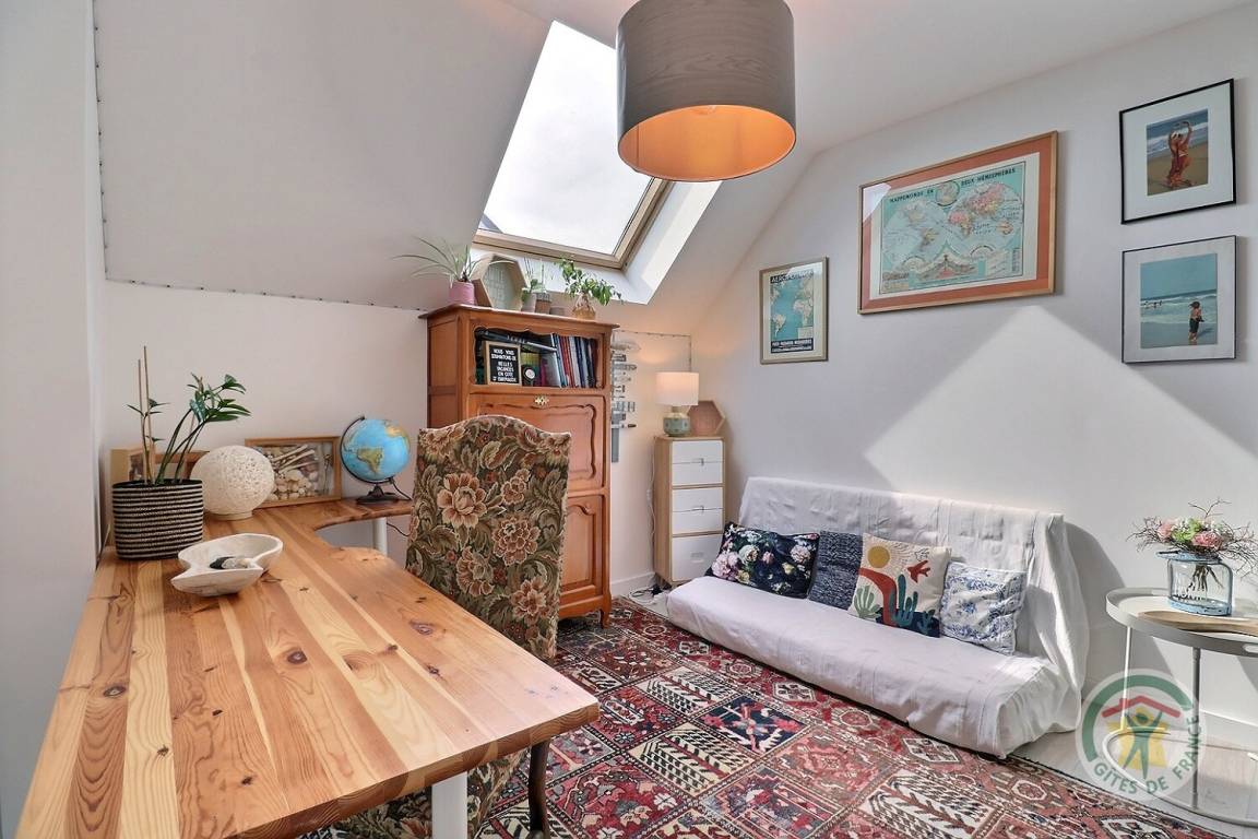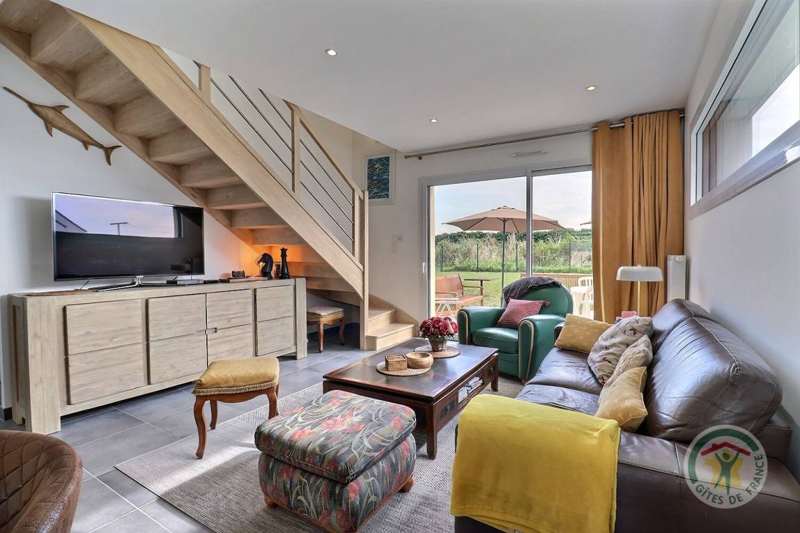 Im Erdgeschoss: eine offene Küche zum Wohnzimmer mit Lounge, ein Schlafzimmer mit einem 160X200 Bett, ein Badezimmer und eine separate Toilette. Obergeschoss: Ein Flur mit Büro verteilt zwei Schlafzimmer mit je einem 160X200 Bett, ein Badezimmer mit Doppelwaschbecken und Badewanne und separatem WC. Parken auf dem Grundstück (leichtes Entladen).
