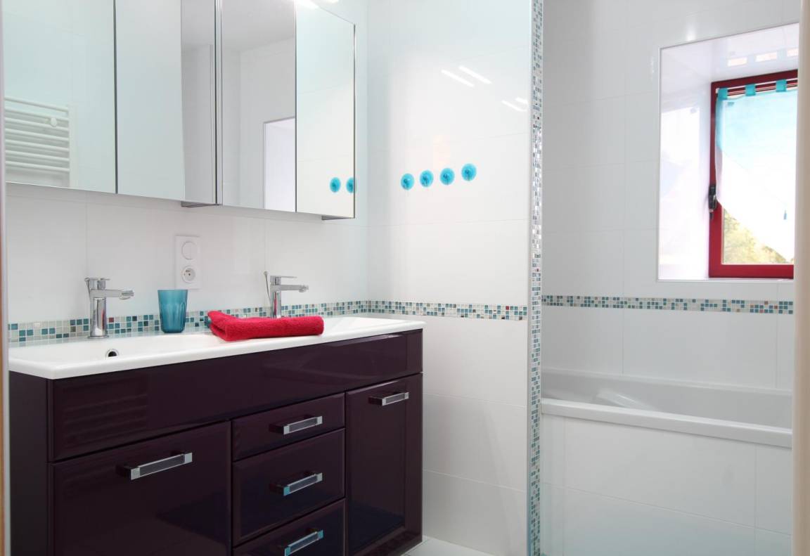 Freistehendes Haus. Erdgeschoss: Küche, Hauswirtschaftsraum, Wohnzimmer, Fernseher, DVD-Player, Hi-Fi-Anlage, Internetzugang, WC, Waschmaschine, Geschirrspüler. Erster Stock: Schlafzimmer 1 (3 Einzelbetten 90x190 cm), Schlafzimmer 2 (Doppelbett 140x190 cm) und Schlafzimmer 3 (Doppelbett 140x190 cm und Schlafsofa 130x190 cm), Duschbad, Badezimmer, WC. Zweiter Stock: Große Galerie unter dem Dach (Entspannungsbereich). Kinderbett und Hochstuhl auf Anfrage. Elektrische Heizung (Fußbodenheizung im Erdgeschoss) gegen Aufpreis. Bettwäsche und Handtücher können gemietet werden. Reinigungsservice gegen Aufpreis. Privater, nicht umzäunter Garten. Gartenmöbel, Sonnenliegen. Grill. Parkplatz.