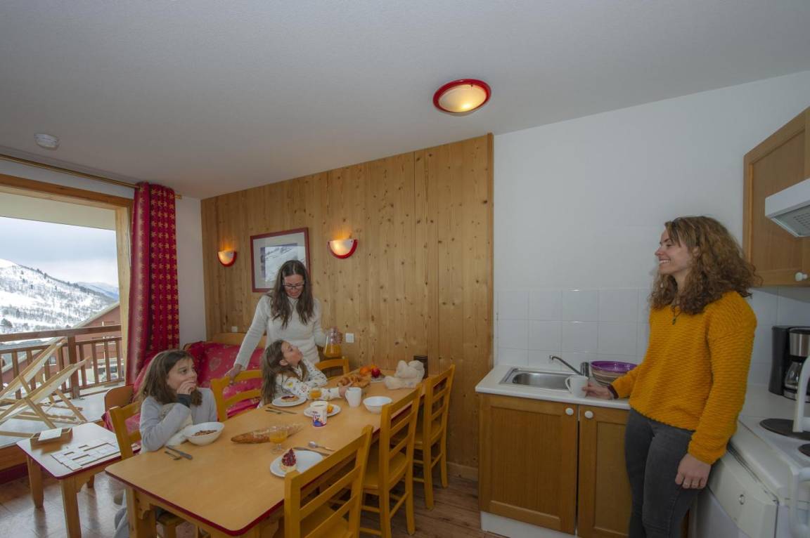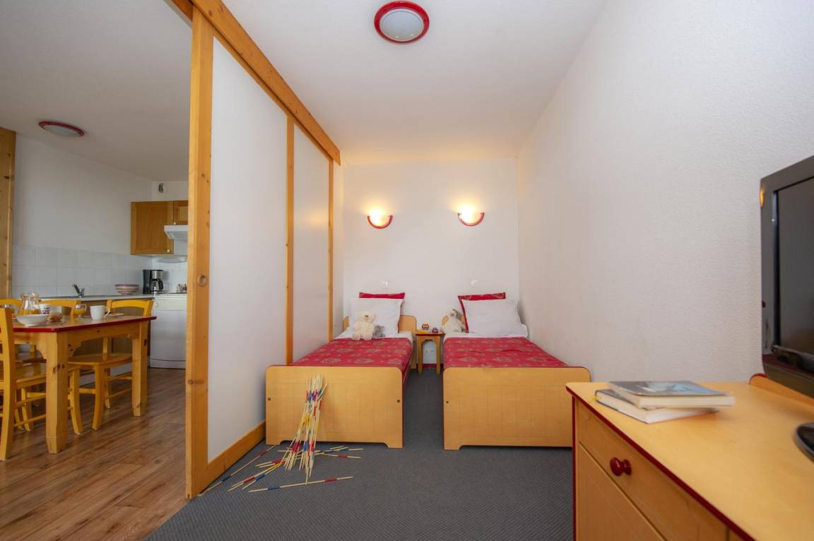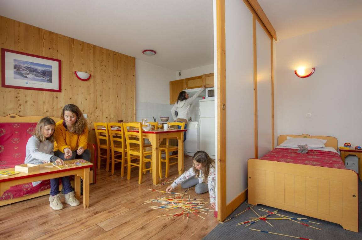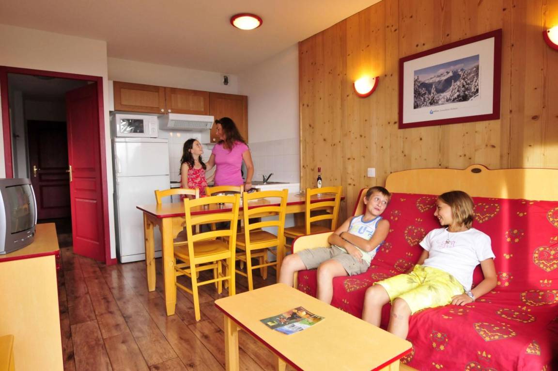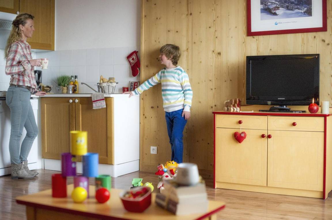Fläche von ungefähr 35 m². Wohnzimmer mit Klappschlafcouch. Schlafzimmer mit Doppelbett oder 2 Einzelbetten. Schlafzimmer mit 2 Einzelbetten oder 2 Stockbetten. Kochnische mit Wasserkocher, Kaffeemaschine, Dunstabzugshaube, Geschirrspülmaschine, Mikrowellenherd, 4 Herdplatten, Kühlschrank. Badezimmer. separates WC. Balkon ODER Terrasse. Die oberen Betten sind nicht für Kinder unter 6 Jahren geeignet.