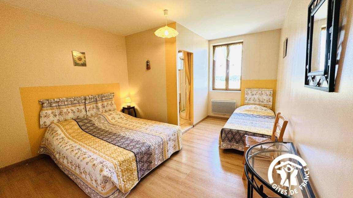 _Ein Schlafzimmer mit einem Doppelbett und einem Einzelbett sowie ein Badezimmer mit Dusche und WC.
