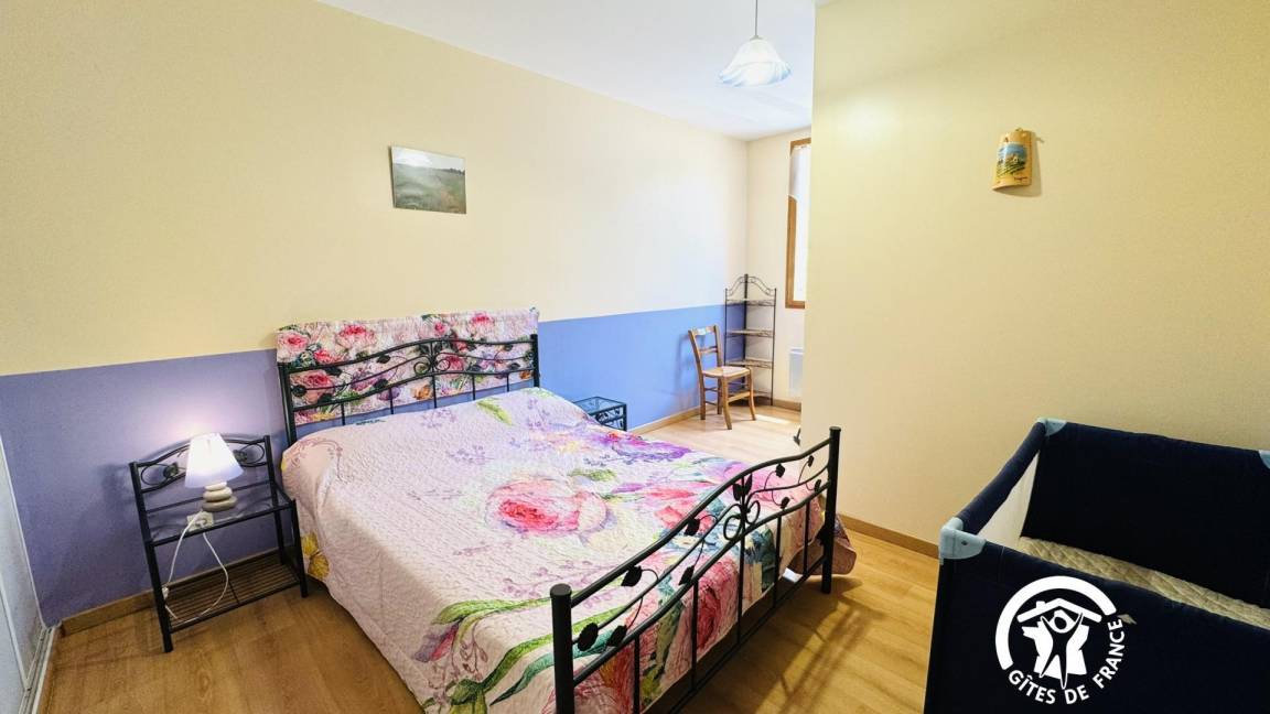 _Ein Schlafzimmer mit einem Doppelbett, einem Kinderbett sowie ein Badezimmer mit Dusche und WC.