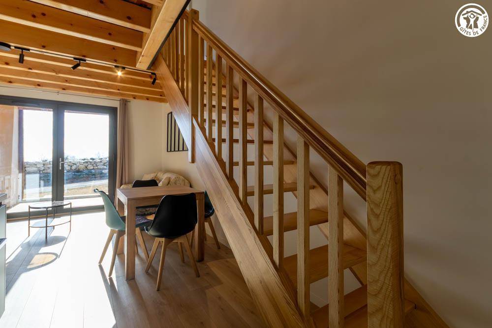 Zweistöckiges Ferienhaus mit Erdgeschoss: Wohnküche mit Sitzecke und separatem WC. Obergeschoss: Schlafzimmer (2 Einzelbetten 90x190 cm), Galerie mit Blick auf das Treppenhaus (1 Doppelbett 140x190 cm), Duschbad. Überdachte Terrasse.
