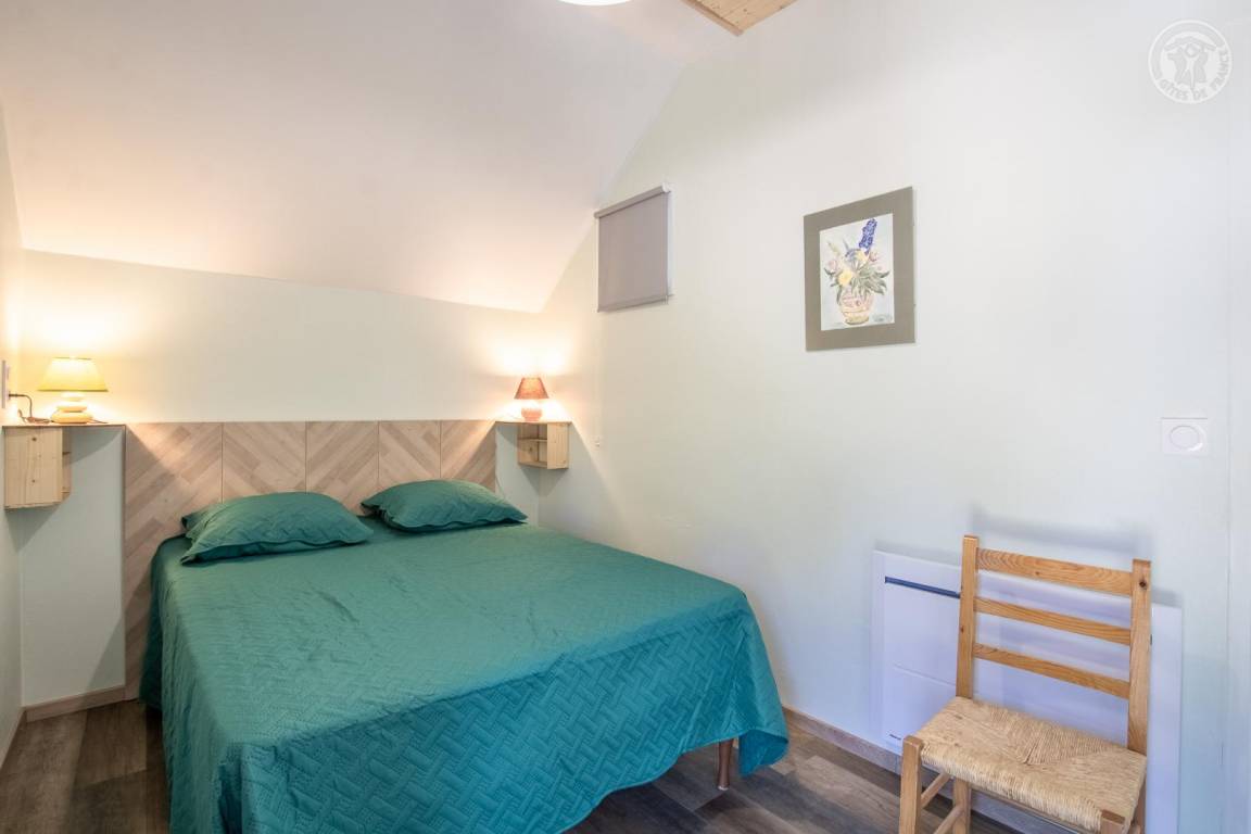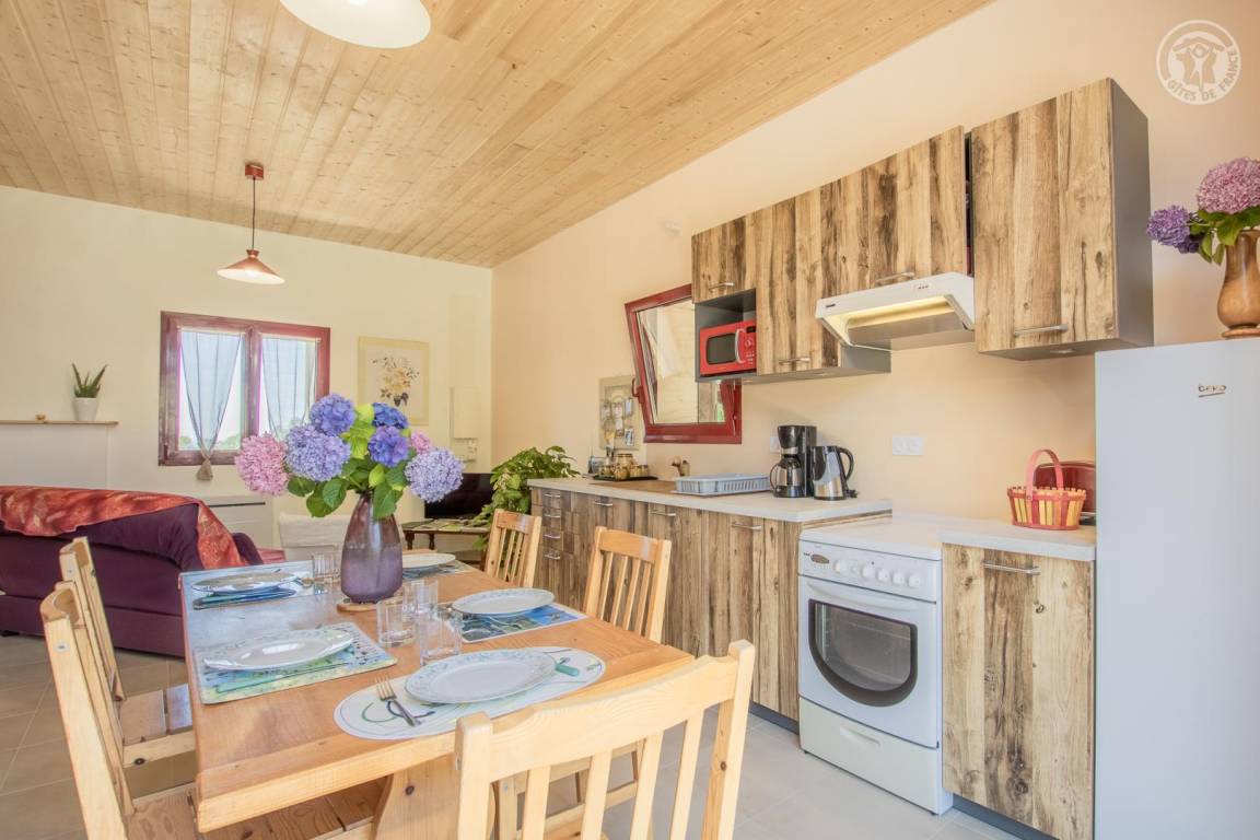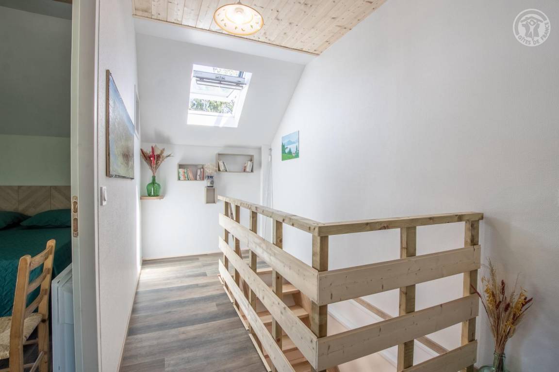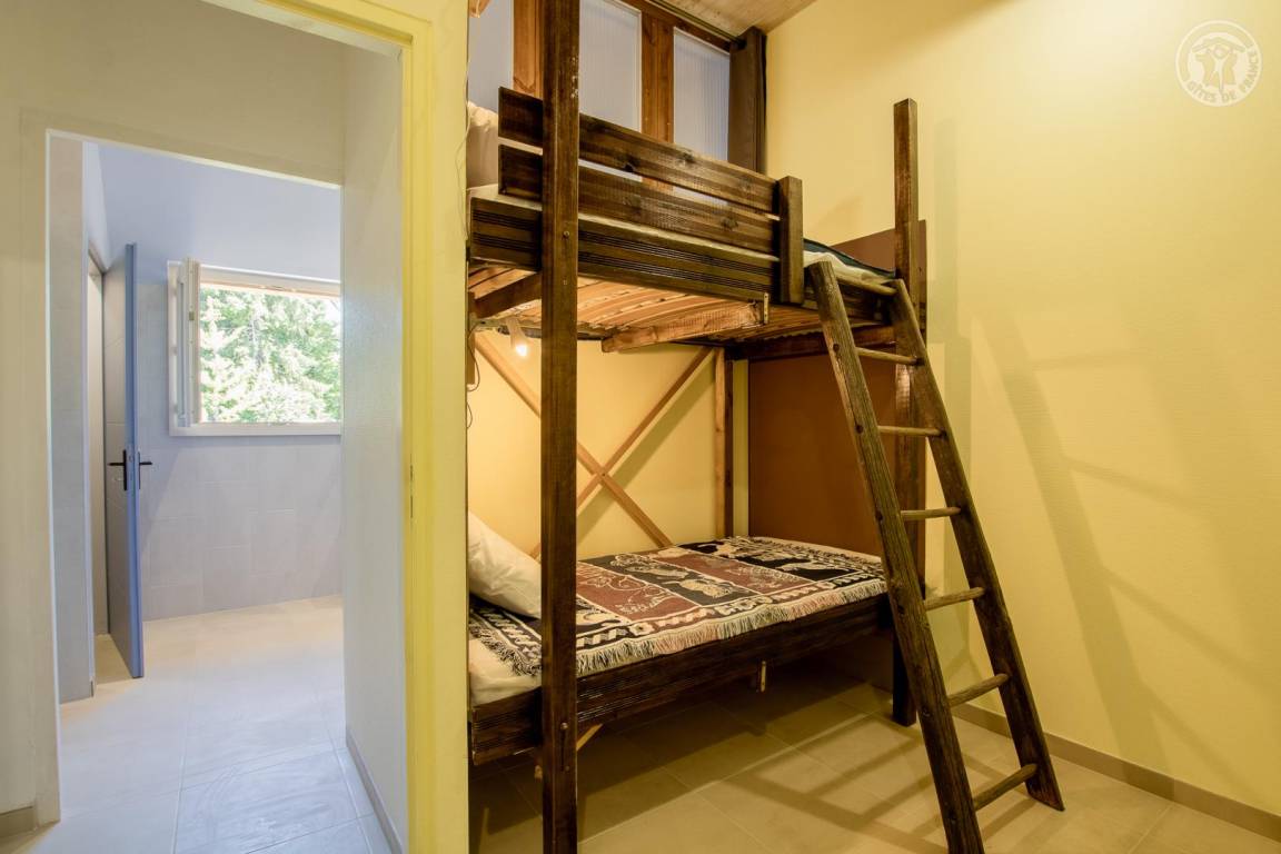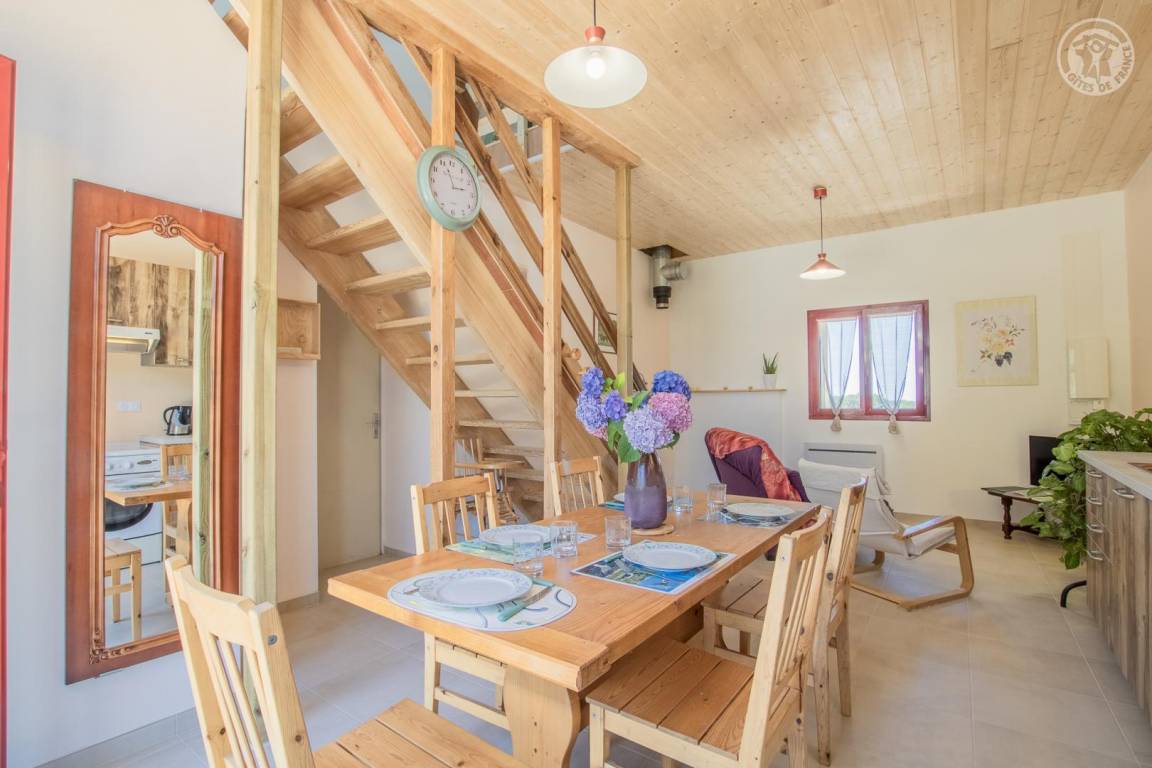 Gîte neben dem Haus der Eigentümer, auf 2 Ebenen mit separatem Eingang. Erdgeschoss: Wohnküche, Sitzecke, separates WC (Waschbecken). 1. Stock: 3 Schlafzimmer (1 Doppelbett 140x190 cm / 1 Doppelbett 140x190 cm / 2 Etagenbetten für 1 Person), ein Duschbad mit geschlossenem WC. Waschmaschine im Ort gemeinsam mit den Eigentümern. Grundstück, privater Parkplatz.