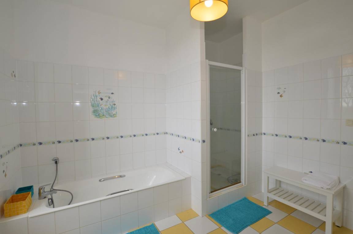 - ein großes Badezimmer mit Doppelwaschbecken, Dusche und Badewanne
