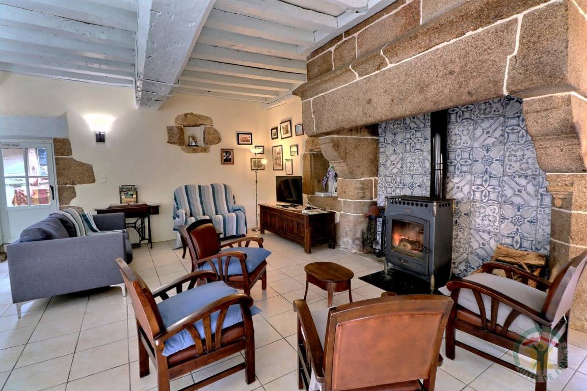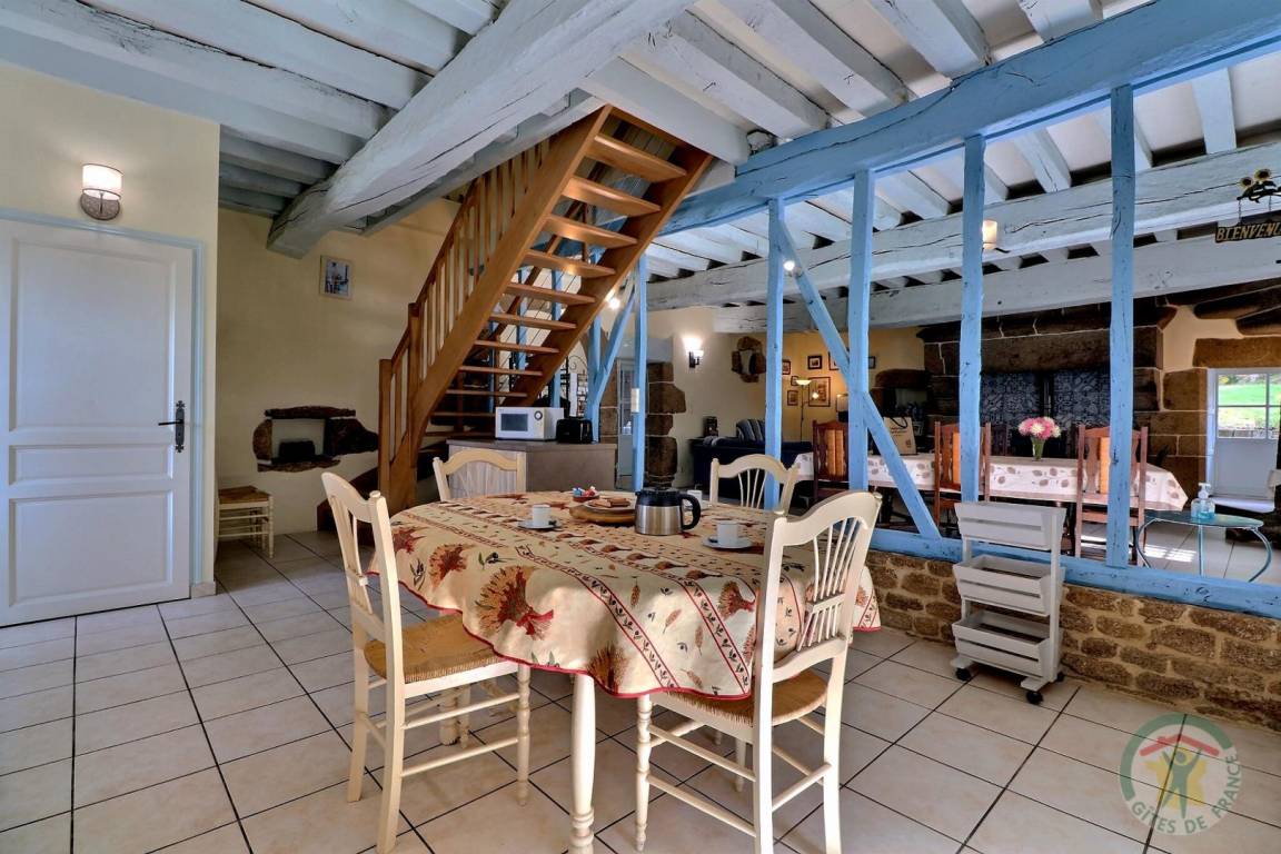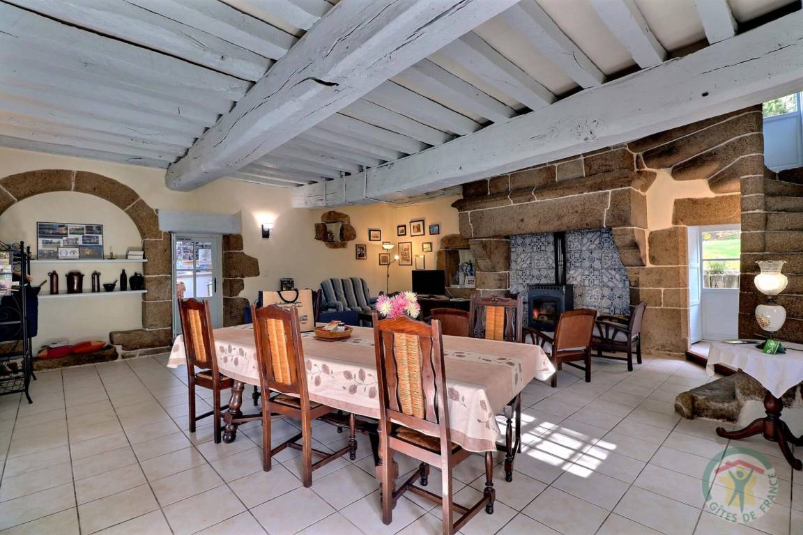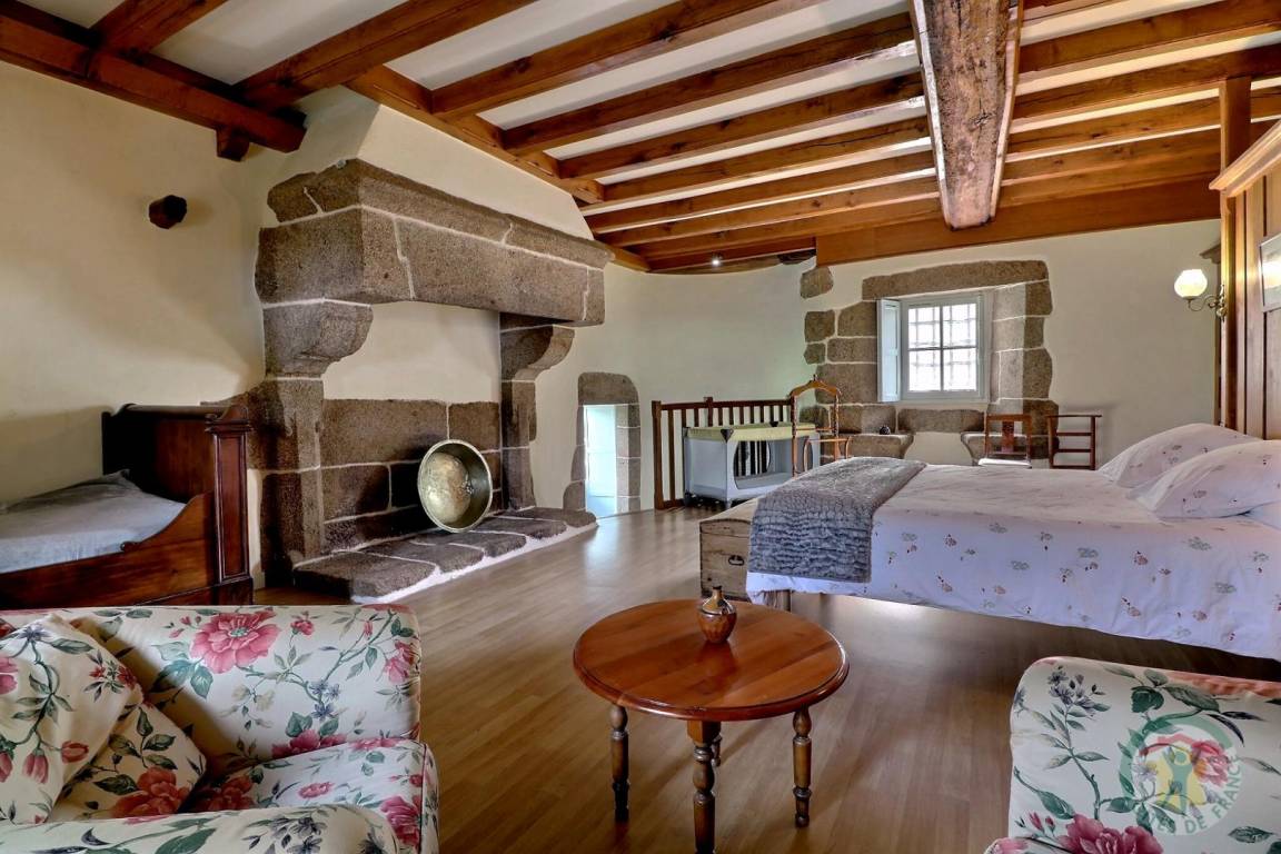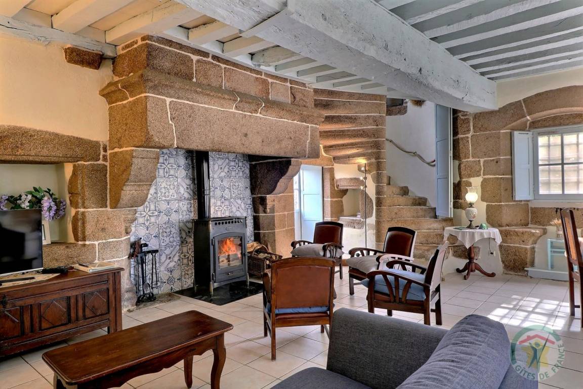 Im EG: separate Küche, Wohnbereich Esszimmer/Wohnzimmer mit großem Kamin aus Granit (Geschirrschrank und sehr alte, ursprüngliche Wendeltreppe aus Stein). Im Stockwerk (Zugang über neue Treppe): 1 Schlafzimmer (1 Doppelbett), 1 Schlafzimmer (2 Einzelbetten), 1 Schlafzimmer (2 Einzelbetten), 2 Sanitärbereiche mit WC. Fußbodenheizung im Mietpreis inbegriffen. Anliegendes Grundstück mit Gartenmöbeln und Grill.