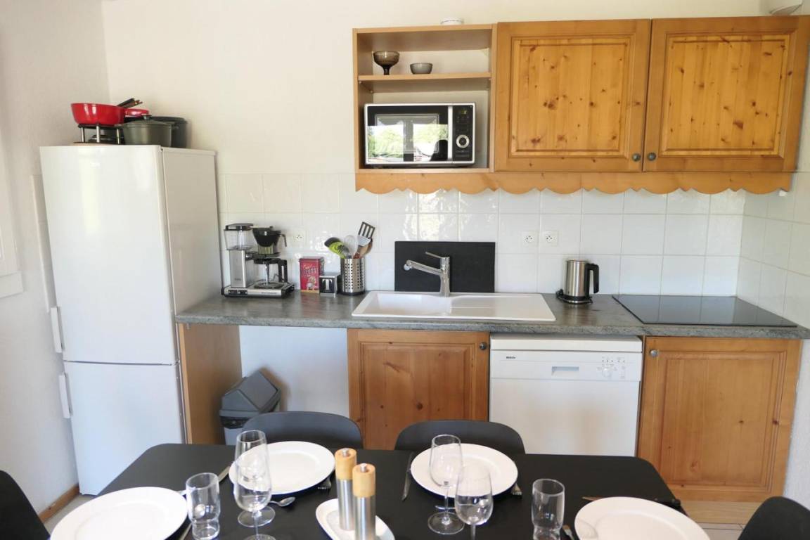 Fläche von ungefähr 44 m². 4te Etage. Orientierung : Nord. Wohnzimmer mit Klappschlafcouch. Schlafzimmer mit 2 Einzelbetten. offener Schlafbereich mit fenster, 2 Stockbetten (80*190). Kochnische mit Wasserkocher, Kaffeemaschine, Toaster, Geschirrspülmaschine, Mikrowellenherd, Glaskeramikkochfelder, Kühlschrank. Badezimmer mit Badewanne, Waschbecken. Waschräume mit Dusche. separates WC. 2 Balkone. Die oberen Betten sind nicht für Kinder unter 6 Jahren geeignet.