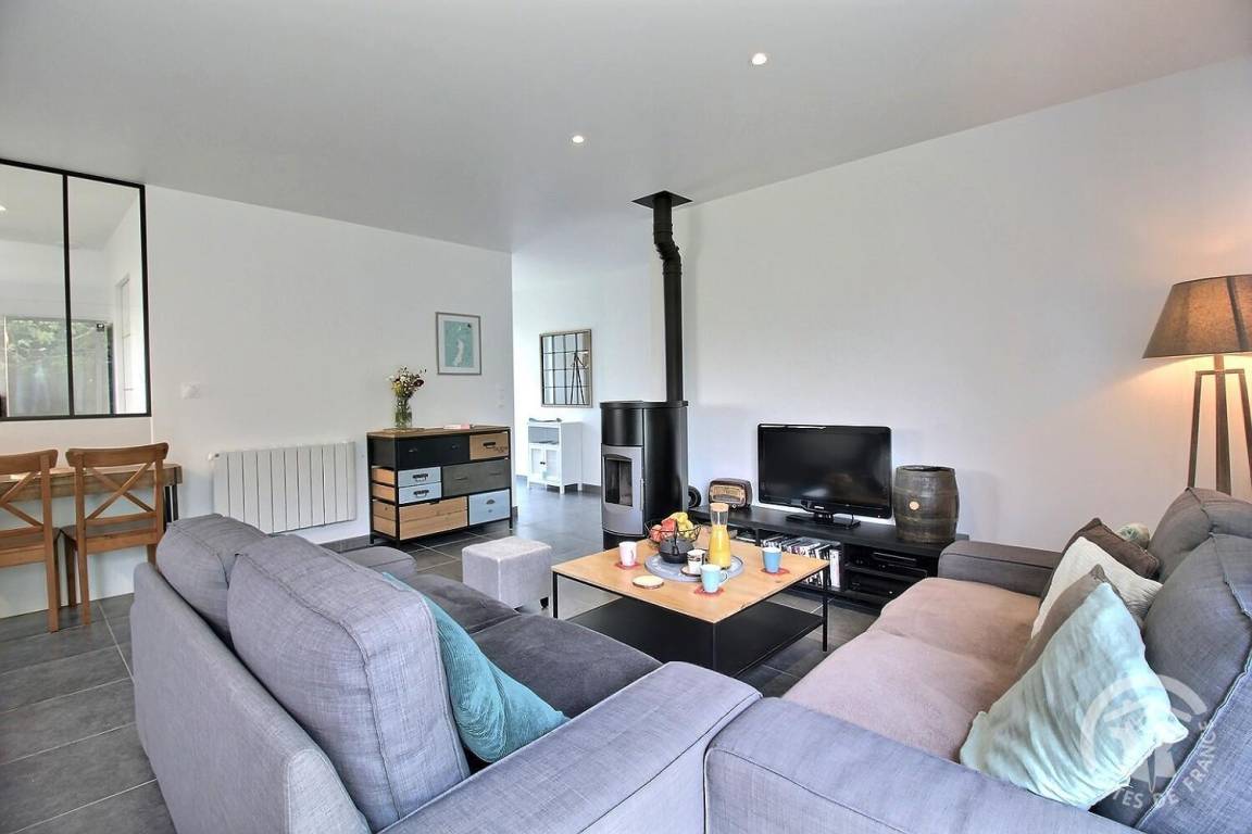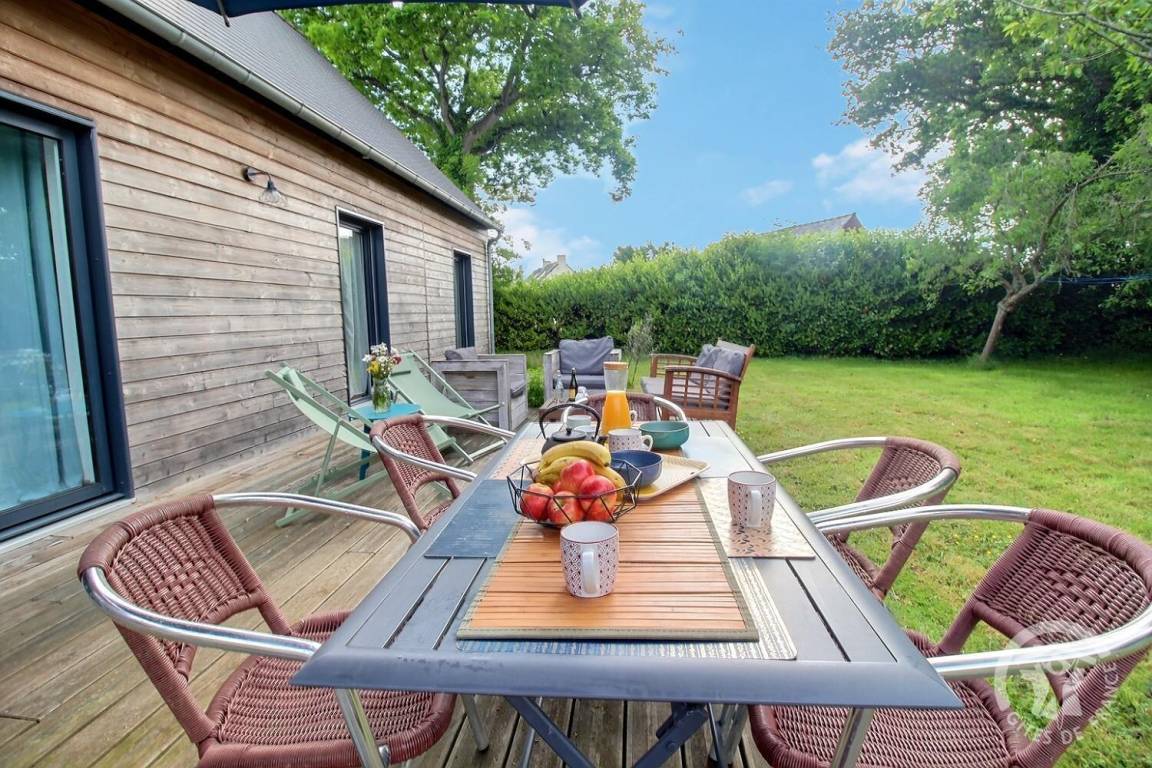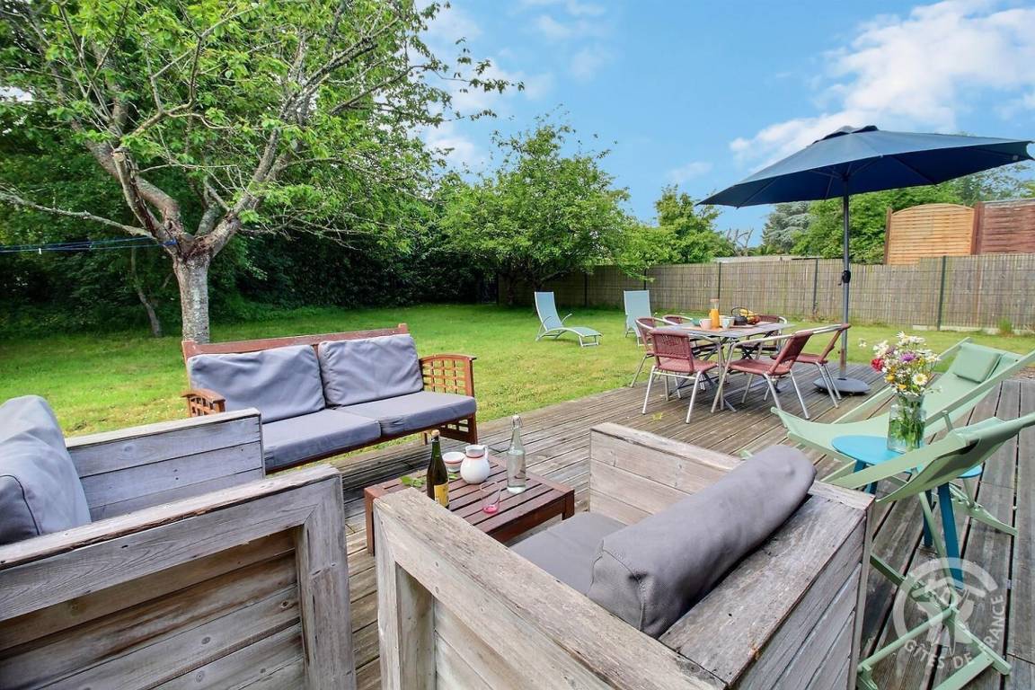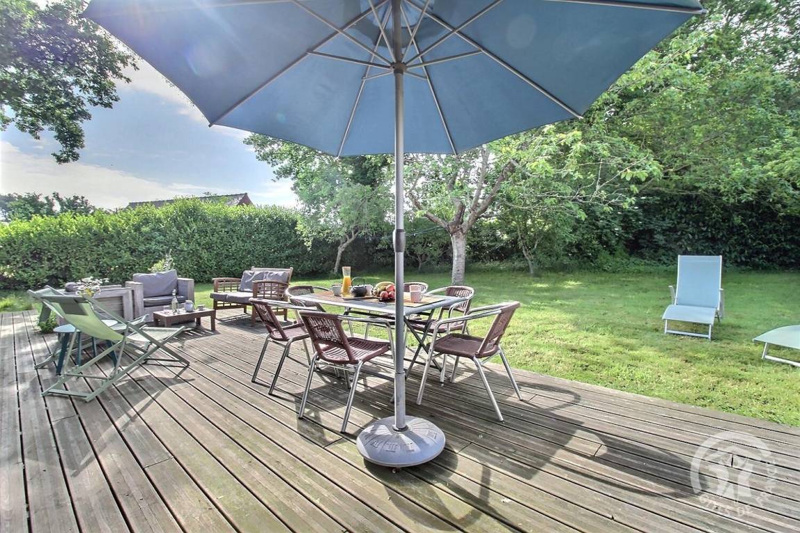Dank seiner großen Öffnungen ist es lichtdurchflutet und öffnet sich direkt zu einer schönen Holzterrasse und einem umzäunten Garten, der perfekt ist, um die sonnigen Tage zu genießen.
