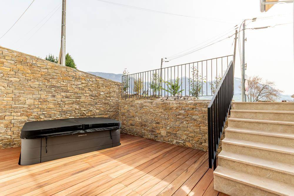 Freistehendes Haus auf drei Ebenen: Erdgeschoss: Eingangsbereich mit Garderobe, Waschküche, separates WC, zwei Schlafzimmer (1 Doppelbett 140x190 cm / 4 Etagenbetten) mit jeweils eigenem Duschbad, ein Schlafzimmer (1 Doppelbett 160x200 cm) mit eigenem Duschbad (Dusche und separates WC), ein Hauptschlafzimmer (1 Doppelbett 180x200 cm) mit Doppel-Dusche, separatem WC, Fernseher und kleinem Kühlschrank sowie Zugang zu einer Terrasse mit Whirlpool. 1. Obergeschoss: Wohnküche mit Zugang zu einer Terrasse. 2. Obergeschoss: zwei Schlafzimmer (je 1 Doppelbett 160x200 cm) mit jeweils eigenem Duschbad (Dusche und WC). Zwei private Parkplätze (für insgesamt fünf Autos). Garten.