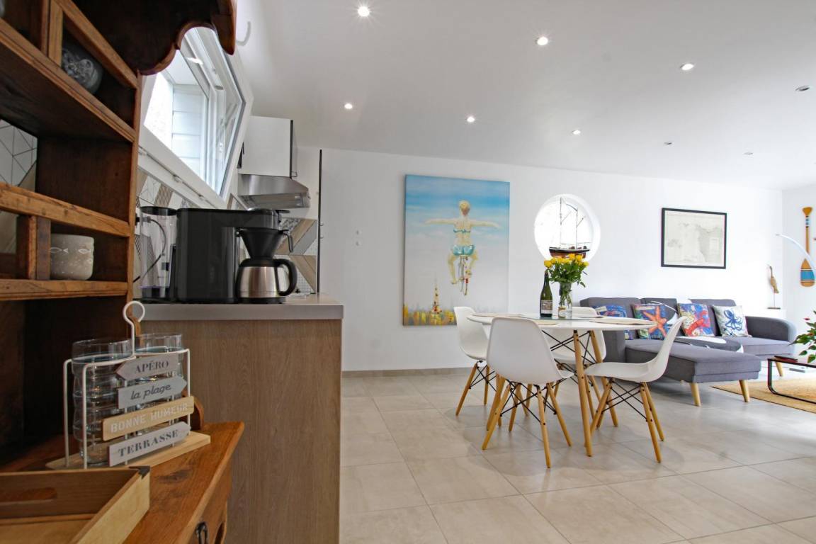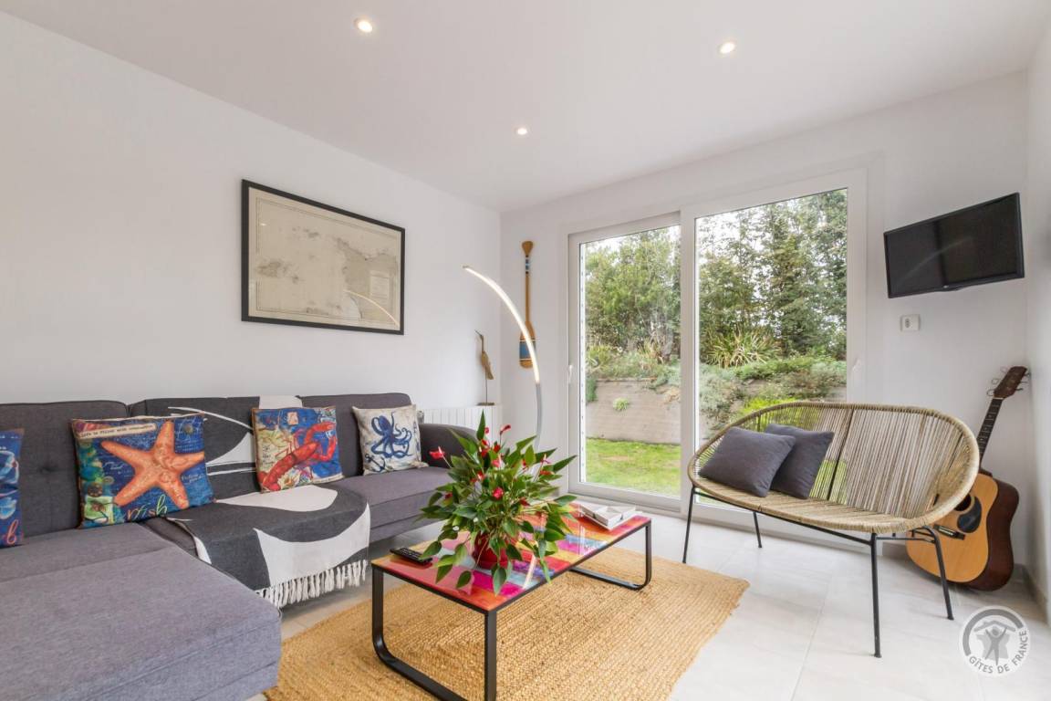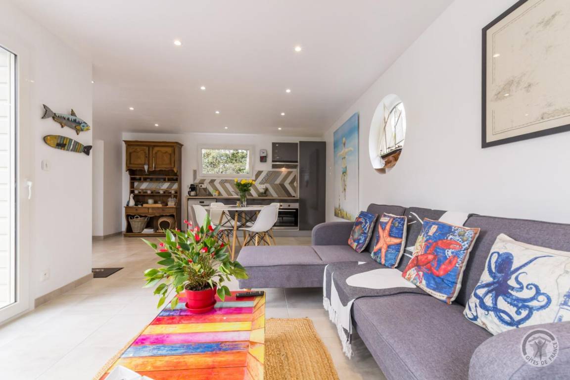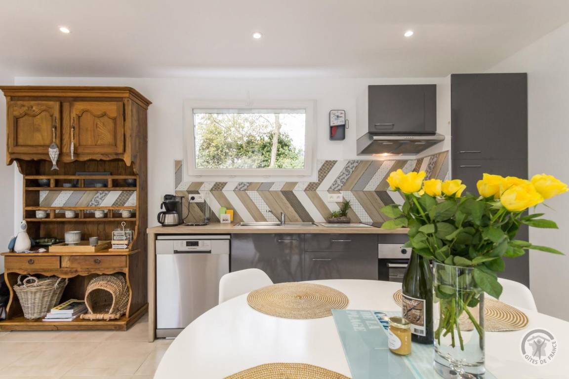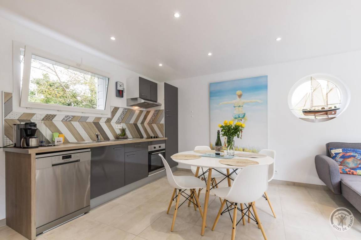 Haus komplett im Erdgeschoss. Wohnzimmer (TV, Internetbox). Offene Küche (Induktionskochfeld, Elektroherd, Geschirrspüler, Mikrowelle, Kühlschrank mit Gefrierfach). Schlafzimmer (140x190 Bett) mit direktem Zugang zur Terrasse. Duschraum. Separates WC. Waschküche (Waschmaschine). Babyausstattung auf Anfrage. Elektroheizung. Alle Gebühren inbegriffen. Bettwäsche und Handtücher werden gestellt. Bett bei Ankunft gemacht. Reinigungsservice. Privater umzäunter Garten. Terrasse. Gartenmöbel. Liegestühle. Grill. Parkplatz.
