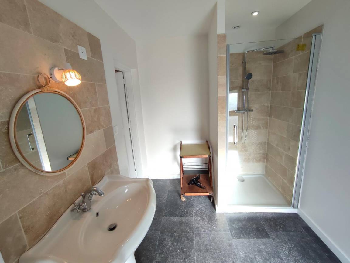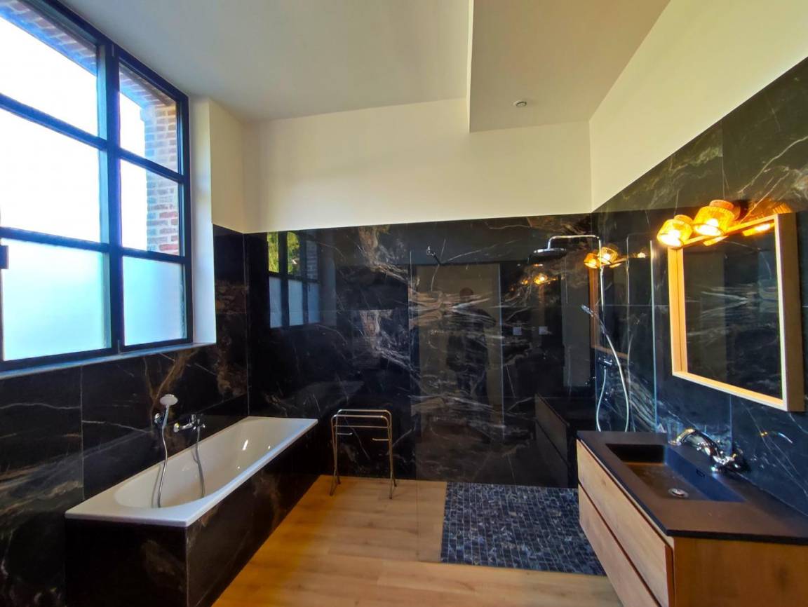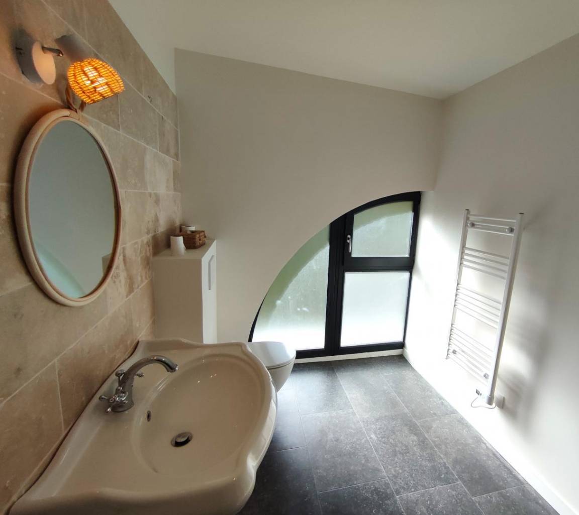 „Een klein minpuntje: Verlichting op sommige plaatsen, vooral de badkamer gelijkvloers (aan de spiegel) en weinig plaats om toiletgerief neer te zetten.“