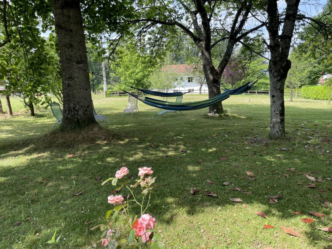Terrasse mit Gartenmöbeln und Plancha. Liegestühle, Hängematten. Großer privater, von Bäumen gesäumter Garten am Ferienhaus.