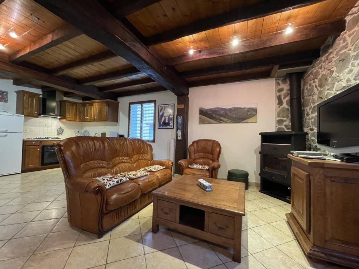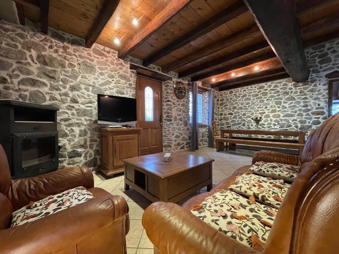 Wohnzimmer, Sitzecke (TV, DVD-Player, Holzofen).